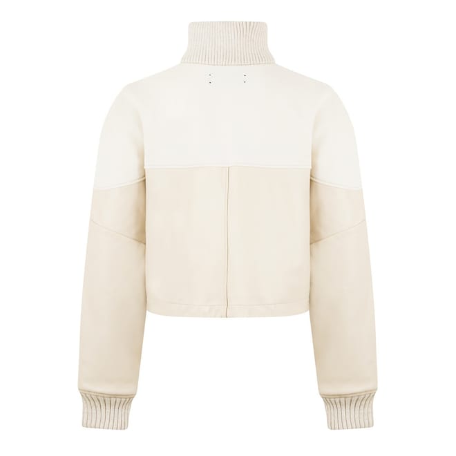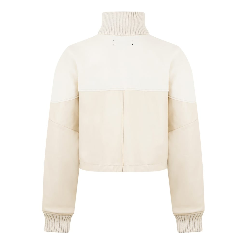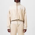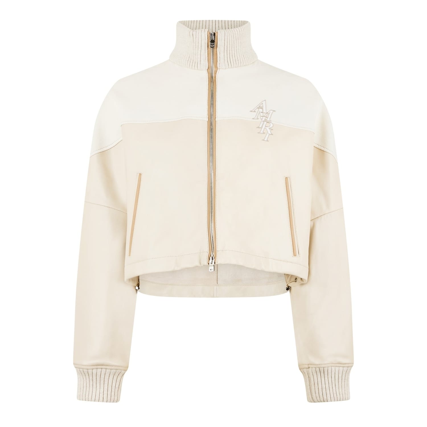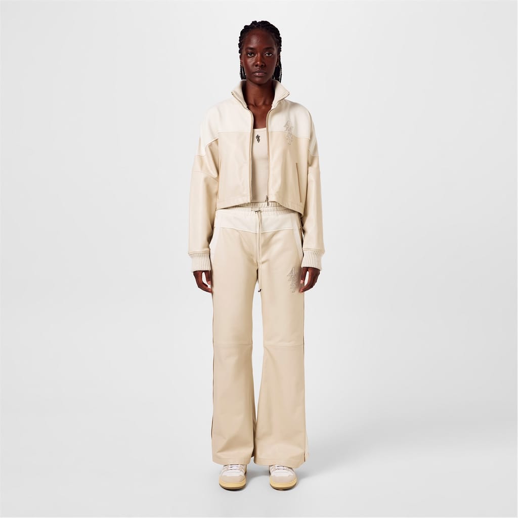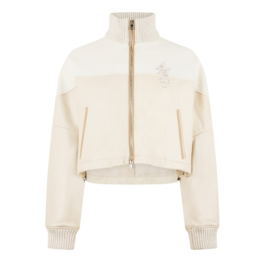 This Amiri track jacket from the casual collection features a relaxed fit and a short length. It showcases a solid pattern with a drop shoulder design and a ribbed top cuff. The jacket is equipped with a zipper closure and a straight hem. A logo embellishment adds a distinctive touch to this stylish piece. -
