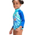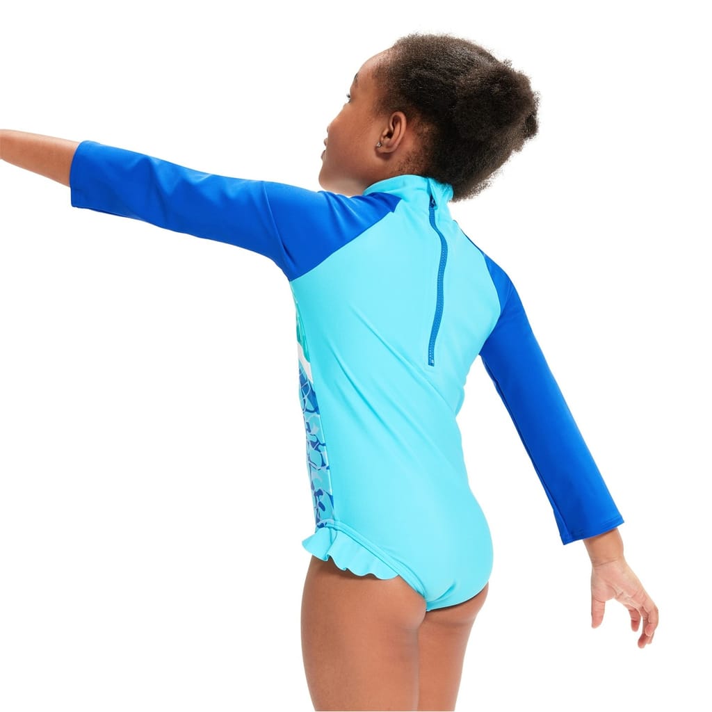 Your little athlete will love splashing about in the swimming pool with this Speedo Long Sleeve Frill Swimsuit. Crafted using Endurance10 fabric enhanced with CREORA® HighClo™ this swimsuit boasts a retchy, shape-retaining feel that is soft, sustainable and chlorine-resistant. The long sleeves, chest, and back coverage ensure that your little adventurer is shielded from the sun's rays with UPF40+ protection, letting the fun last all day without worry, although always remember sunscreen for those beach days! Its ingenious design includes a zip-up back for effortless changing, making transitions from water to land a breeze. Designed in vibrant colours,with a fun pool scene, this swimsuit features frills around the waist. -