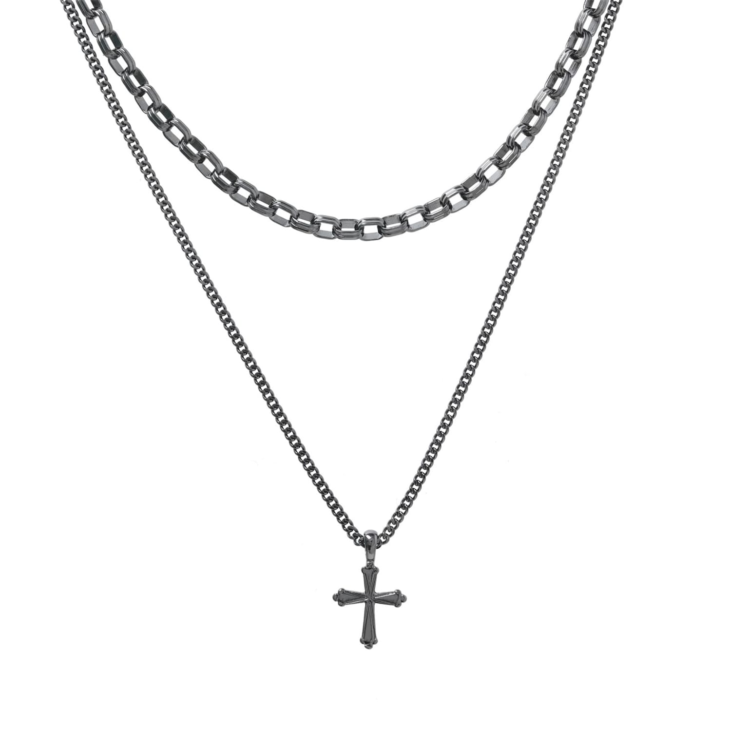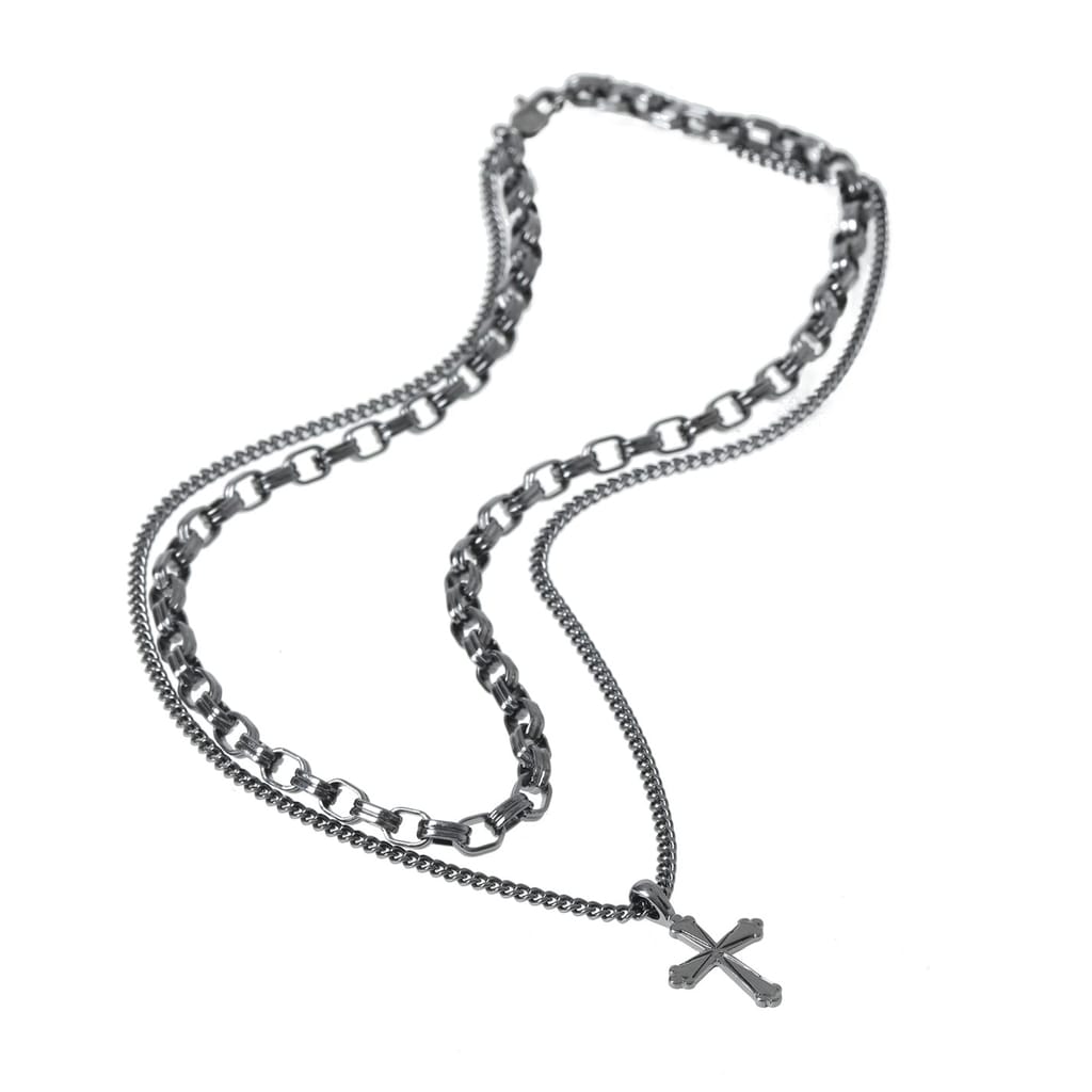 Multi-layer metal cross necklace.