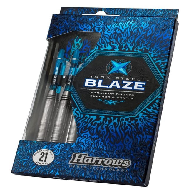 The Harrows Blaze Darts have been precision engineered from Inox steel, a high carbon, iron alloy. The non tarnish steel barrels feature a combination of horizontal and reverse cut micro-grooves for ultimate control, completed with Suregrip shafts and 100 micron Marathon flights. -