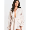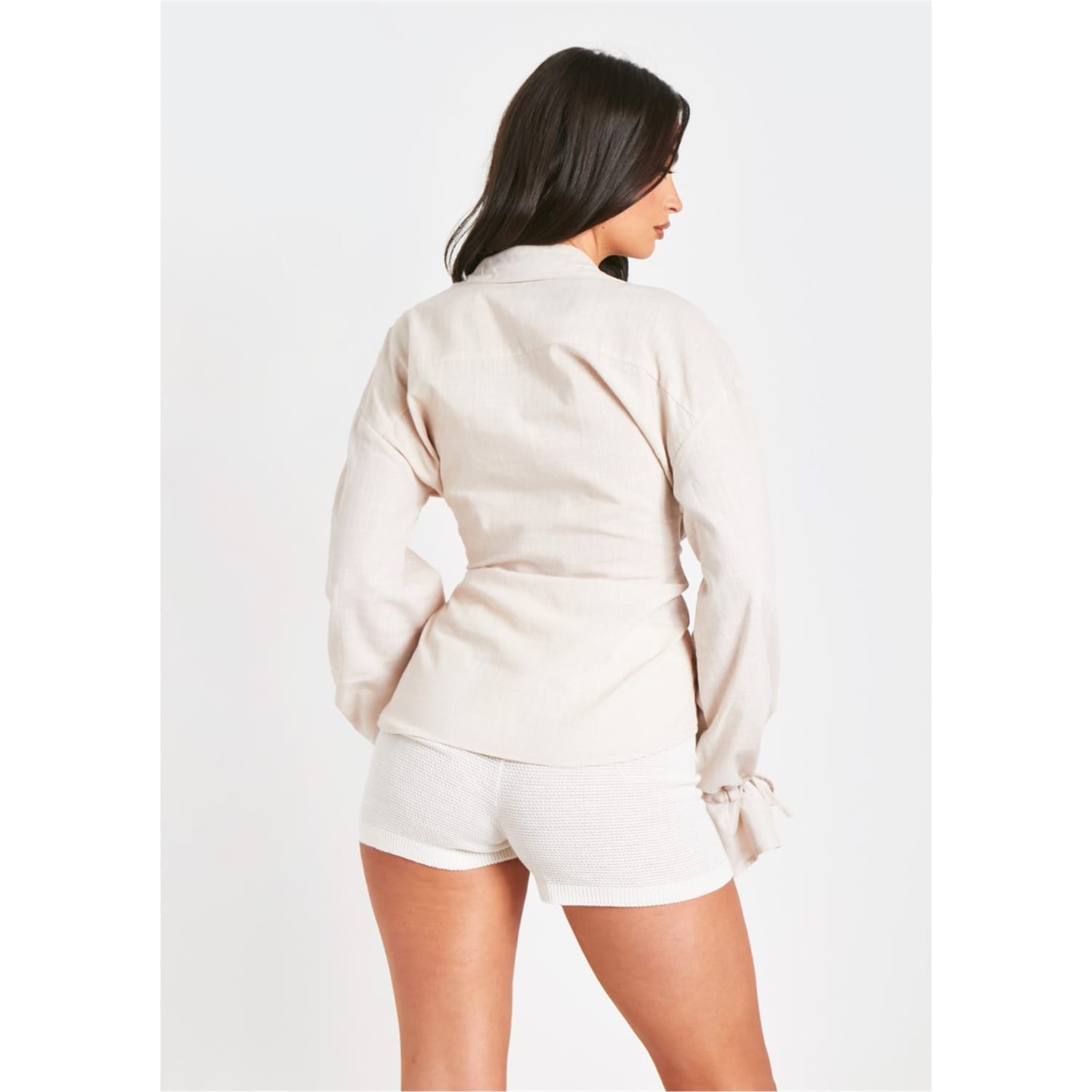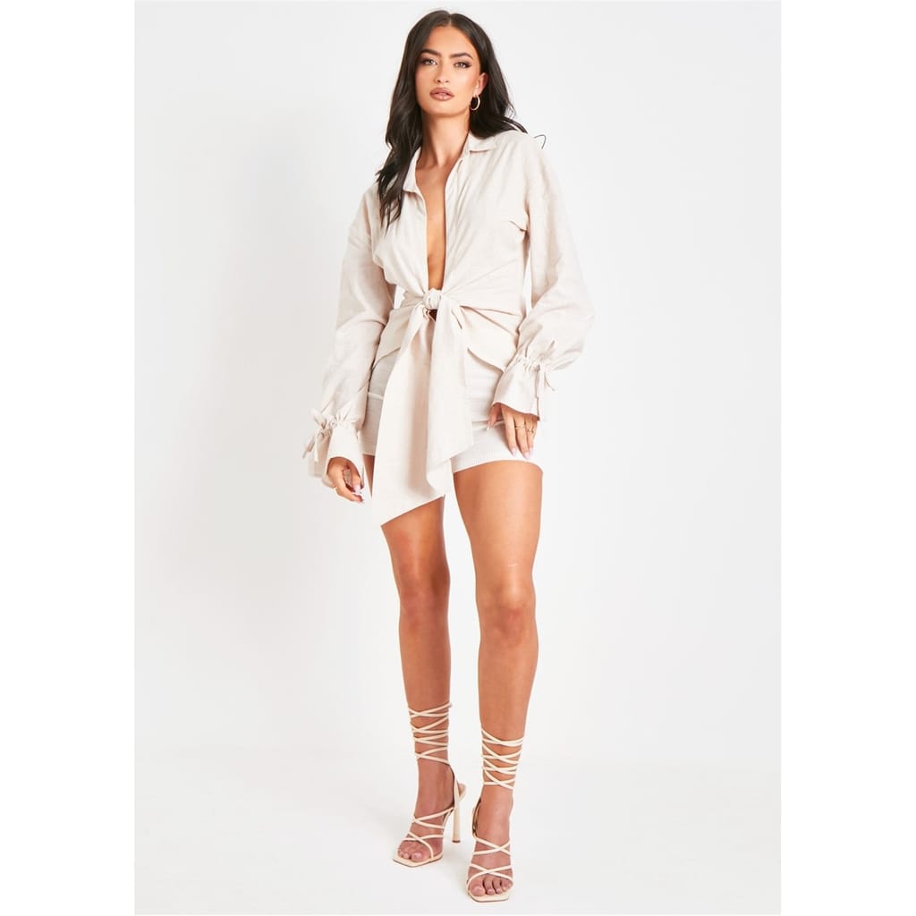 - Girl, get ready to turn heads in the Aphrodite Beige Plunge Drape Detail Shirt! It's all about making a statement. Featuring a plunging neckline, long sleeves with adjustable ties, and a statement knot on the front that cinches the waist. Rock it with high-waisted leather pants or jeans and strappy heels for a fierce night out. Confidence is your best accessory, babe! -