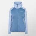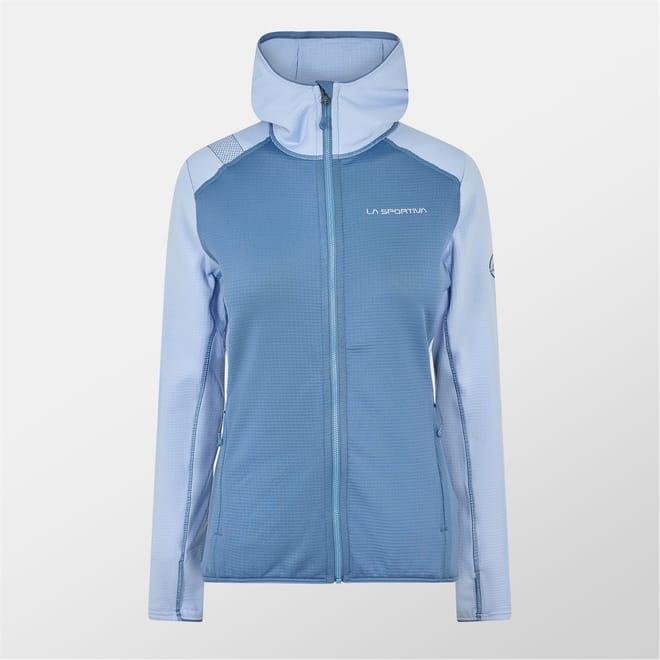 The La Sportiva jacket features a hooded design with a zipper closure, offering a regular fit. It showcases a stylish color block pattern and includes a logo embellishment. The jacket is completed with a straight hem and ribbed cuffs, providing both comfort and style. -