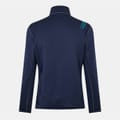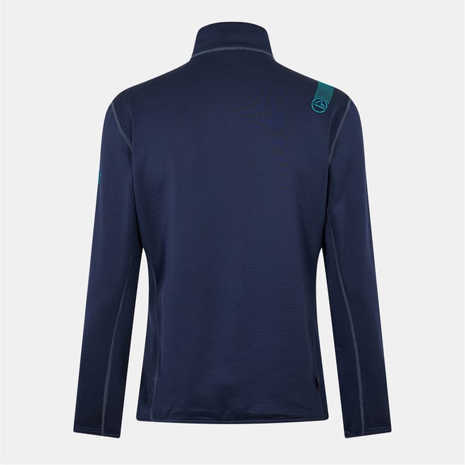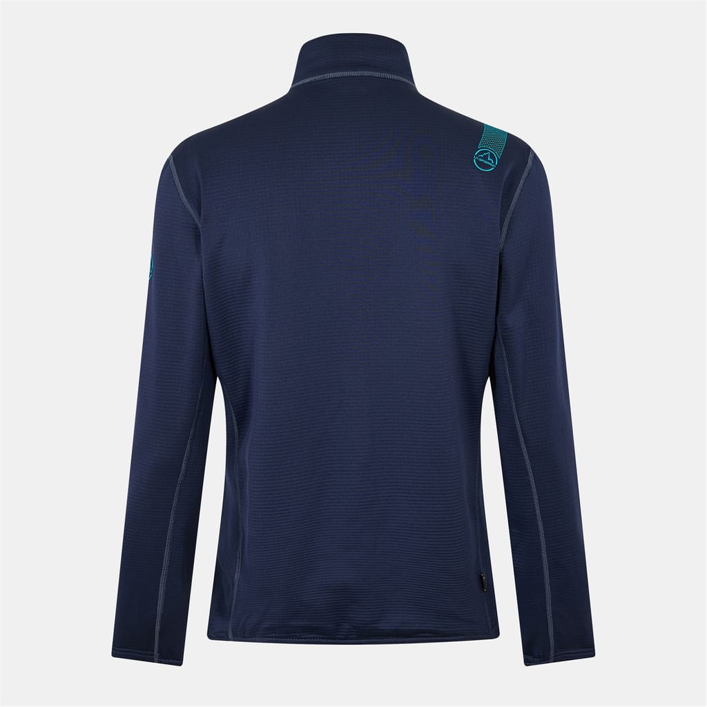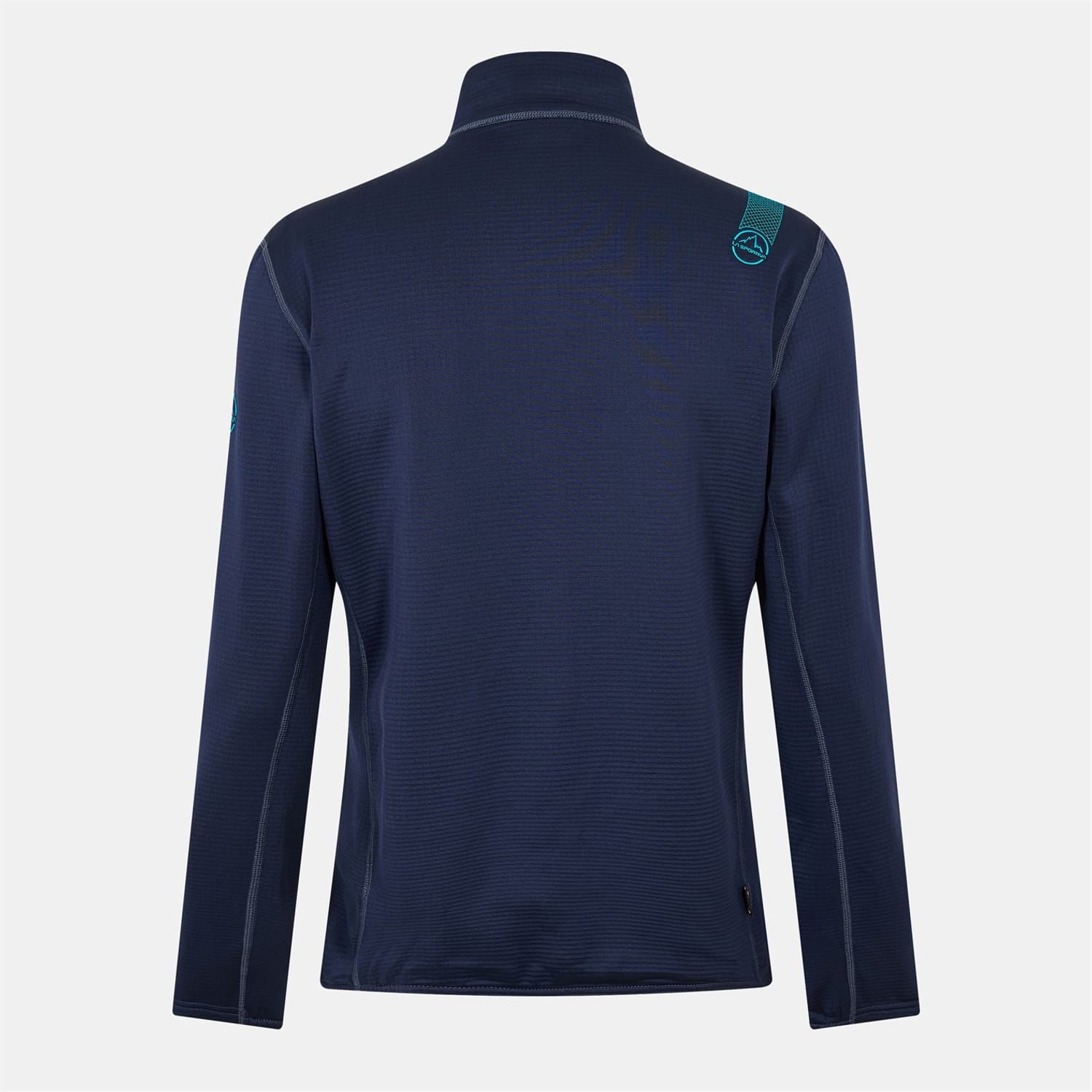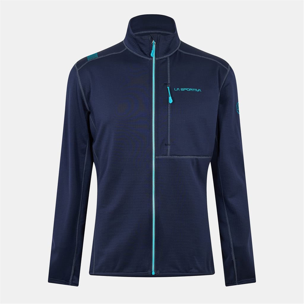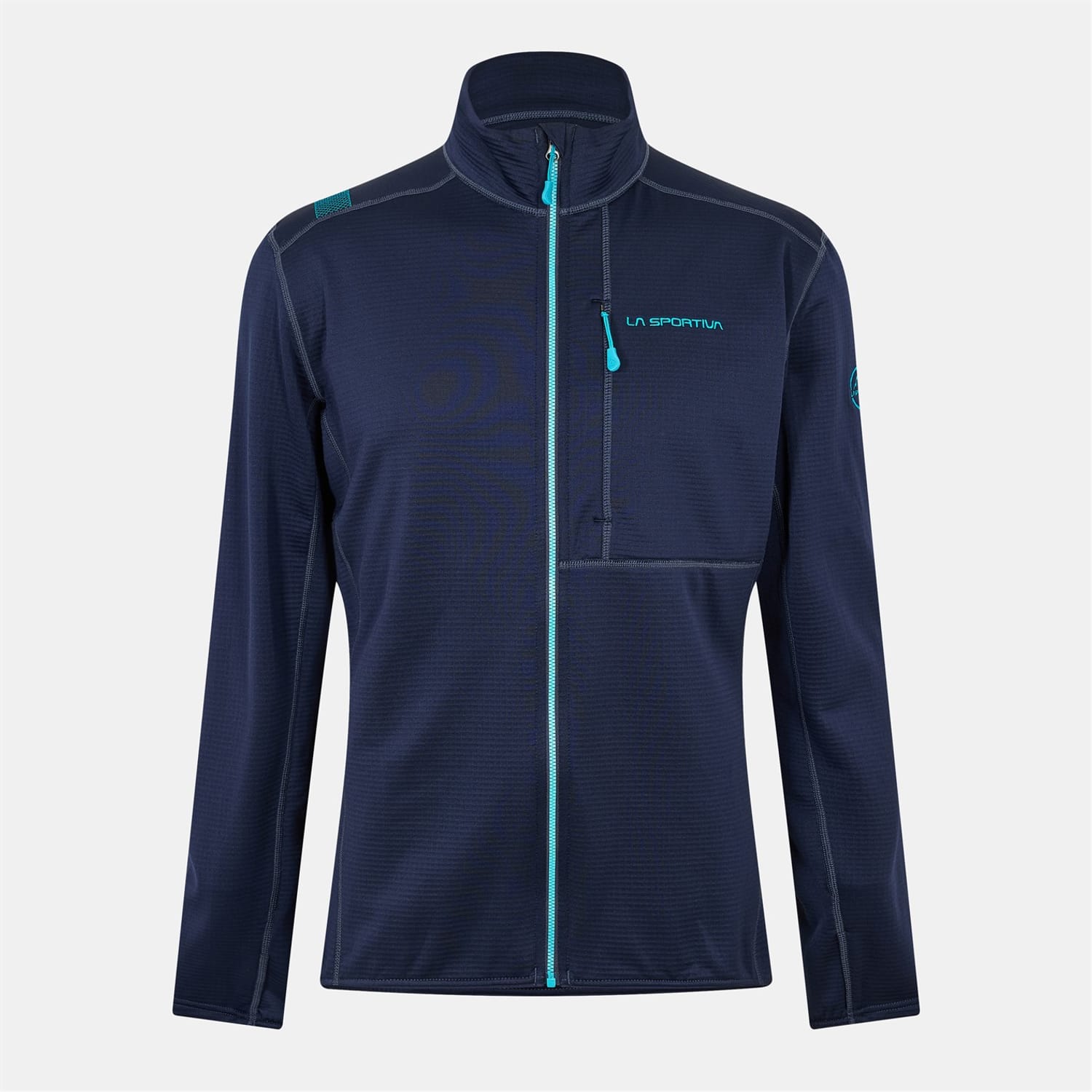 The La Sportiva fleece jacket is designed for sporting activities, featuring a zip neck and a solid pattern. It offers a regular fit with a straight hem and a convenient zipper closure. The jacket is adorned with a logo, adding a touch of brand identity. -
