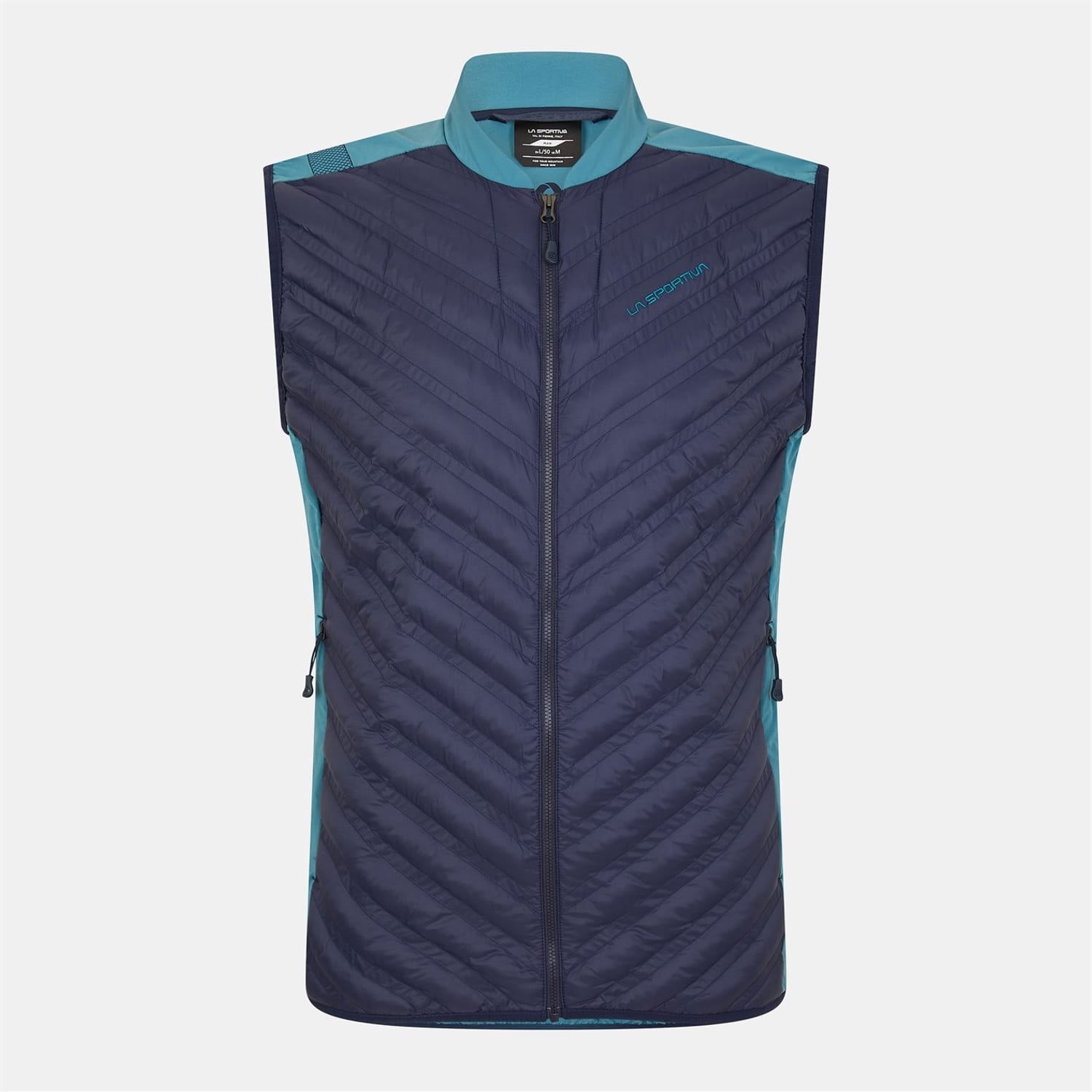 The La Sportiva gilet features a chevron pattern and a mock neck design. It is crafted with a regular fit and includes a zipper closure. The gilet is adorned with a logo embellishment, adding a distinctive touch to its design. -