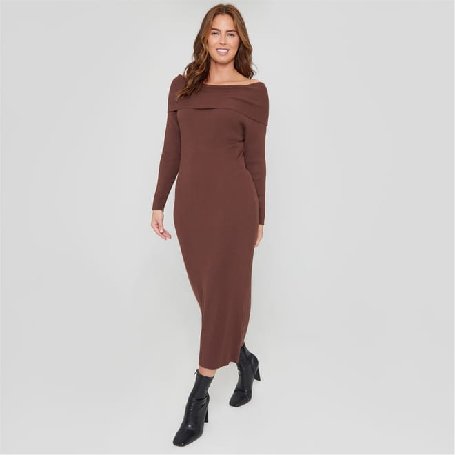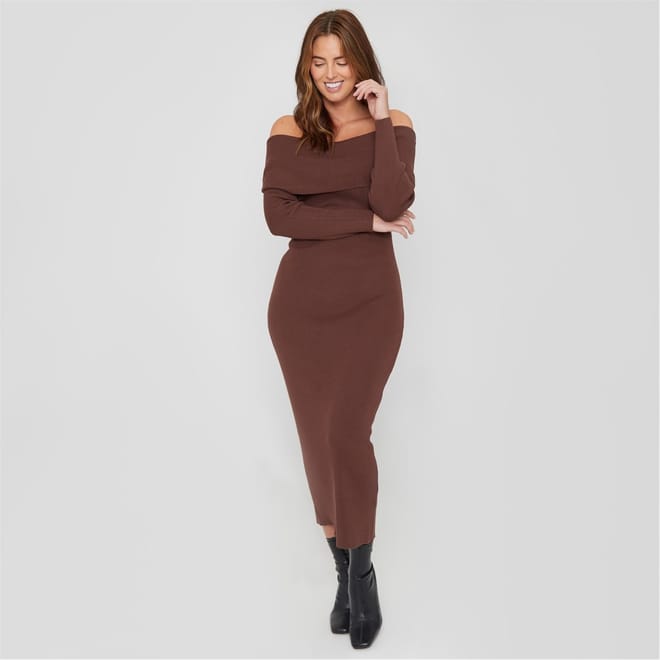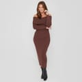 This Be You sweater dress features an off-the-shoulder neckline and a ribbed pattern, offering a stylish knit design. The midi length and straight hem create a sleek silhouette, while the slim fit enhances its modern appeal. Perfect for those seeking a chic and comfortable addition to their wardrobe. -