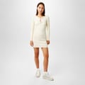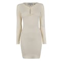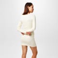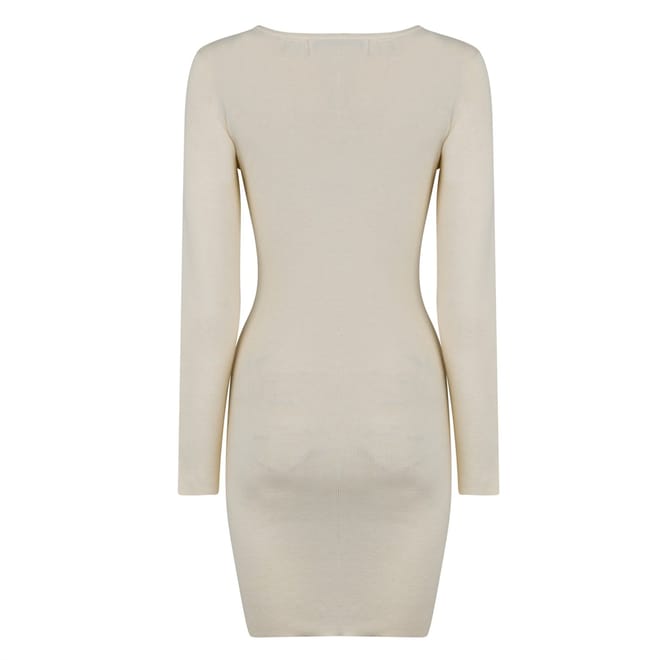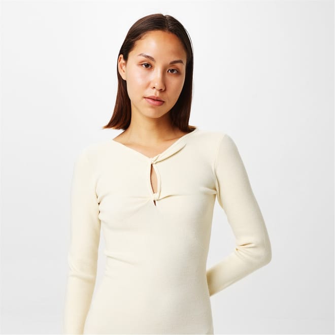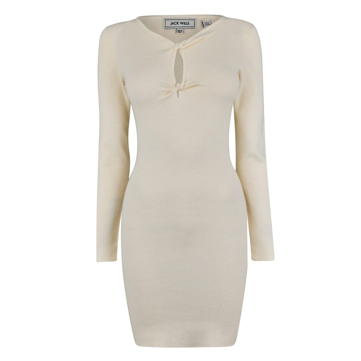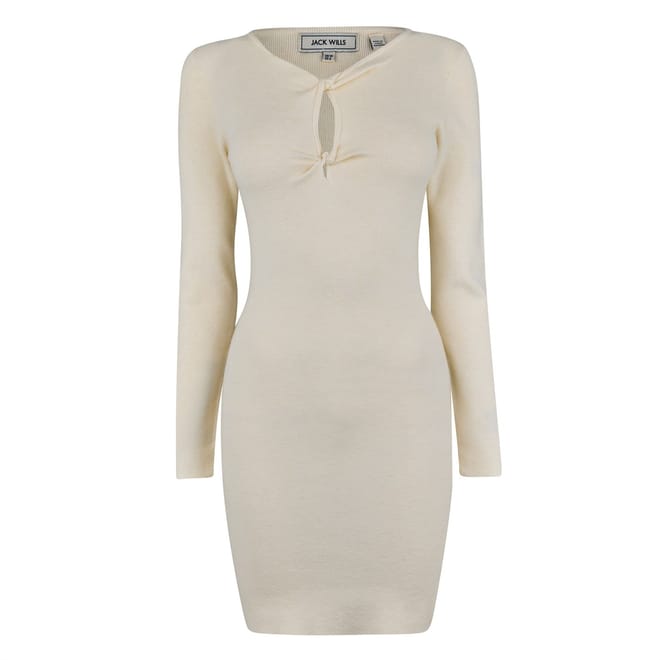 This Jack Wills mini dress is a stylish bodycon piece, featuring a twist effect and knit design. It has a V-neck and long sleeves, offering a slim fit with a solid pattern. The dress is completed with a straight hem, making it a versatile addition to any wardrobe. -