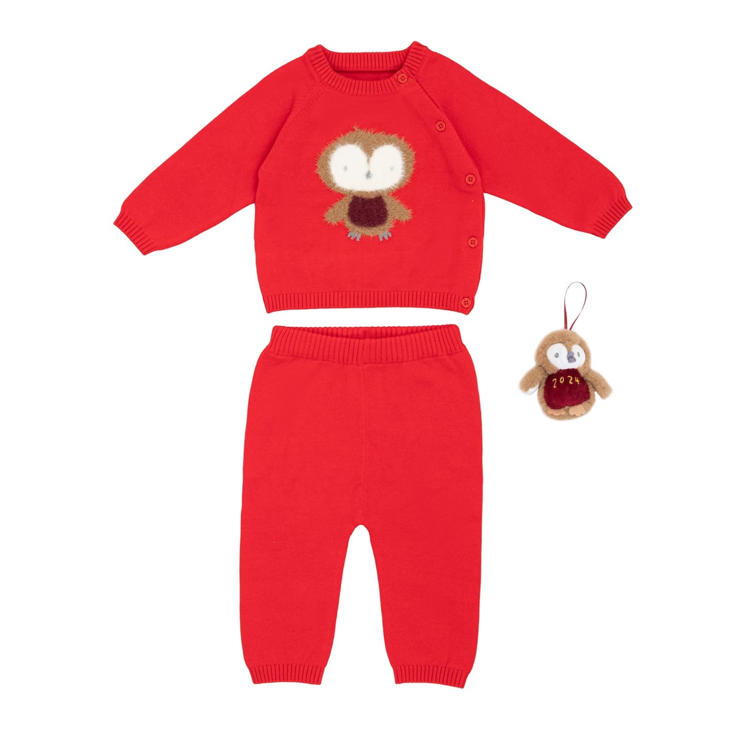 Introduce your little one to the world of style with the Hello World top and pant set. This adorable baby set features a charming robin graphic print with applique embellishments. The sweater boasts a crew neck and raglan long sleeves, ensuring comfort and ease of movement. Paired with casual pants, this set is perfect for keeping your baby cosy and stylish. -