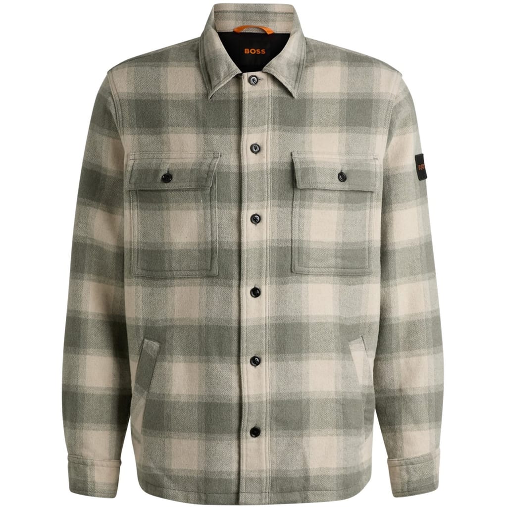 The BOSS overshirt jacket is a stylish addition to your wardrobe. This regular fit jacket features a classic shirt collar and a plaid pattern, lending a timeless appeal. It includes a button closure, cuff sleeves, and practical chest pockets. The design is enhanced with a subtle logo patch, adding a touch of brand recognition. -