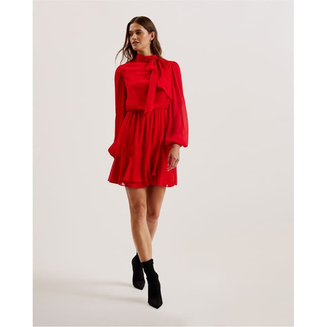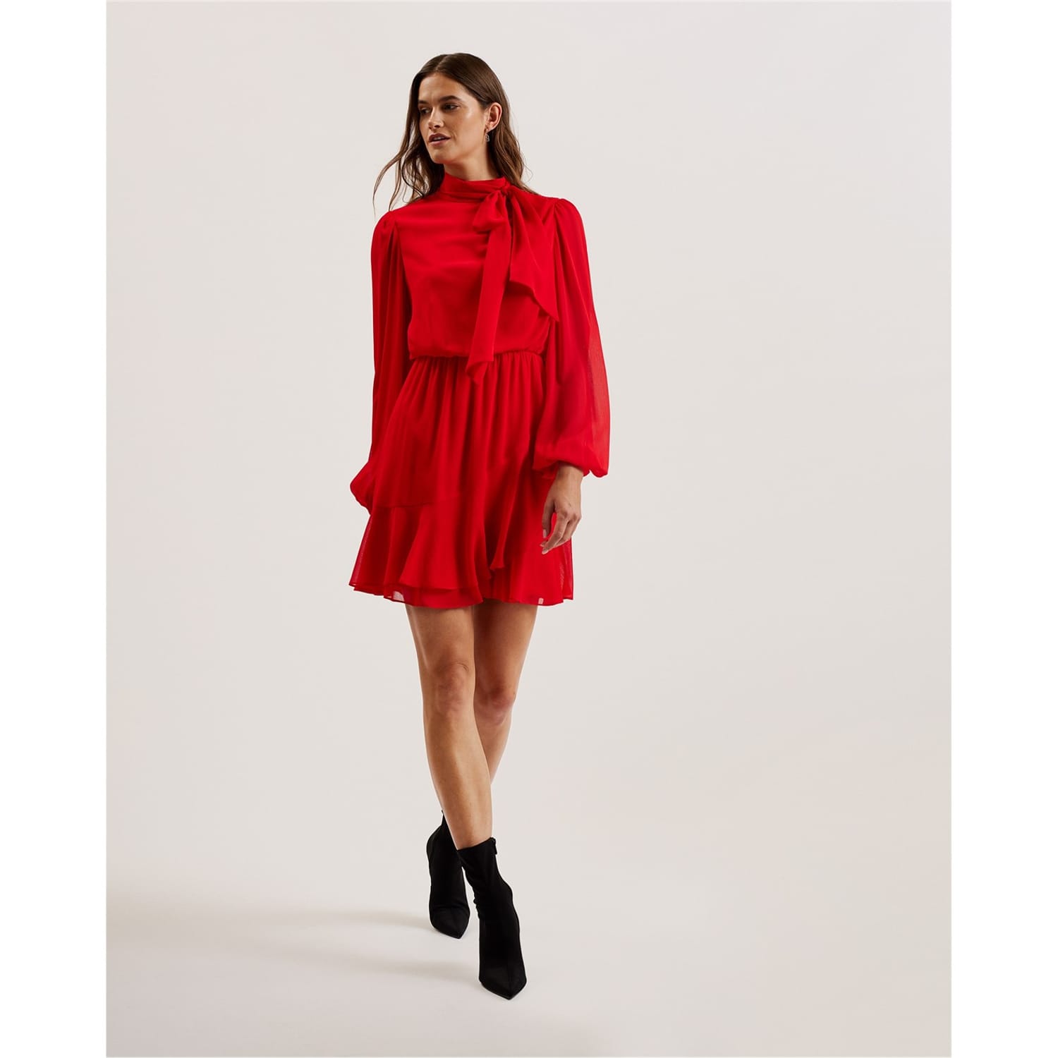 This Ted Baker mini dress features a high collar and a tie neck, offering a sophisticated touch. The long puff sleeves add a stylish flair, while the solid pattern ensures a classic look. The A-line style is complemented by a ruffle hem, adding a playful element to the design. Perfect for those seeking a blend of elegance and modernity. -