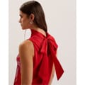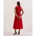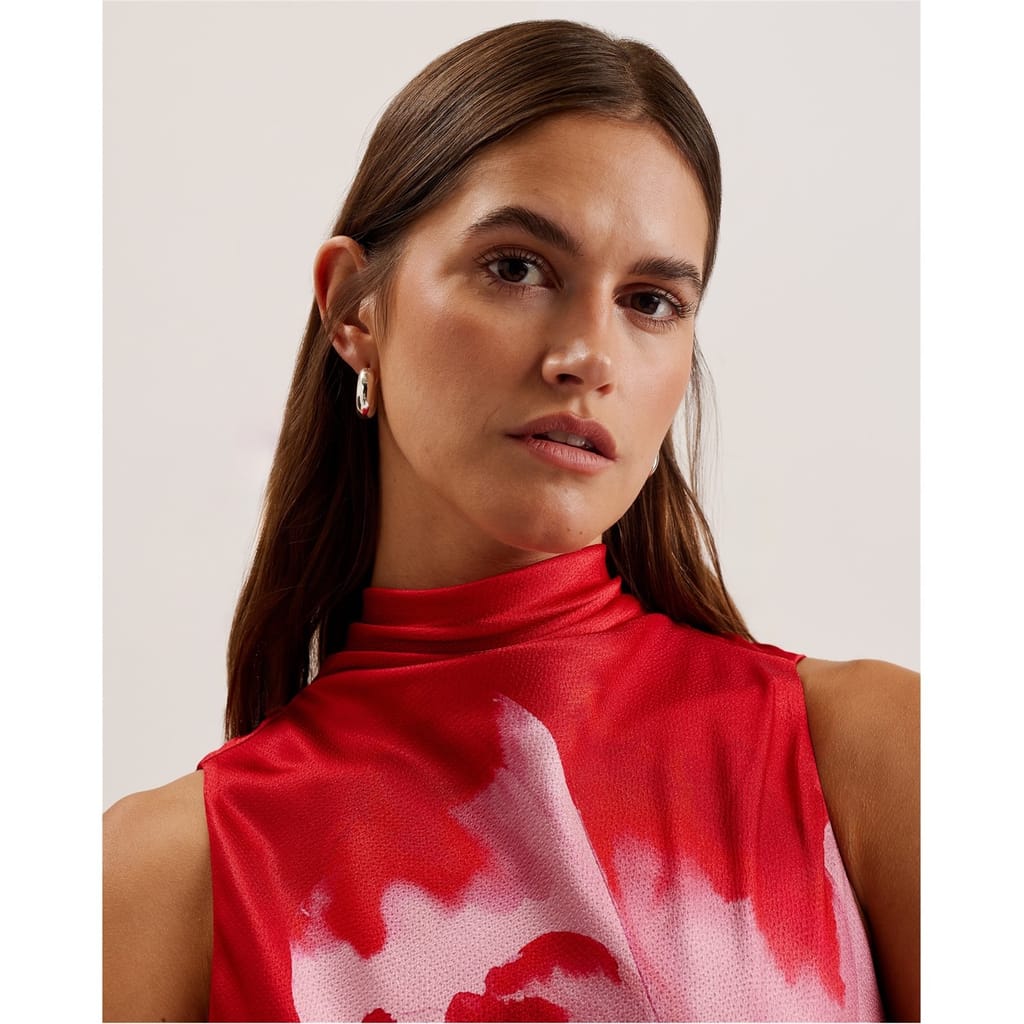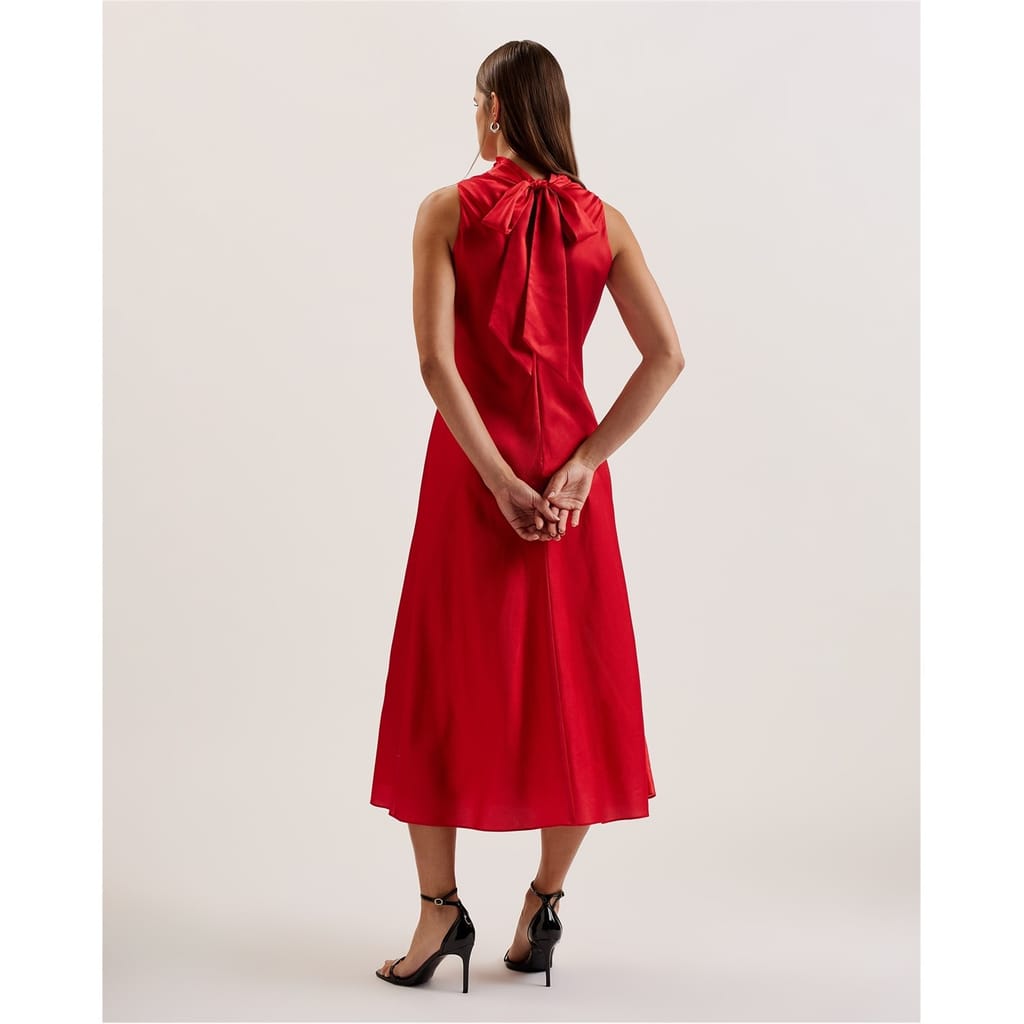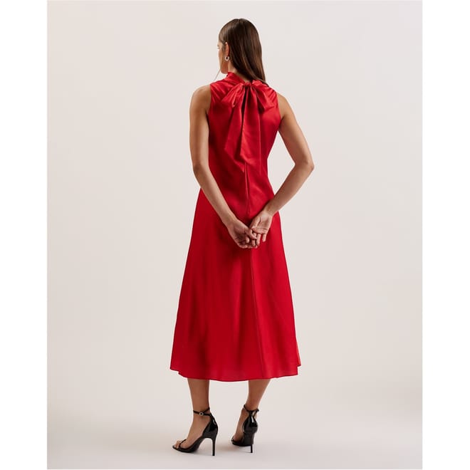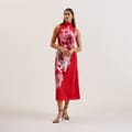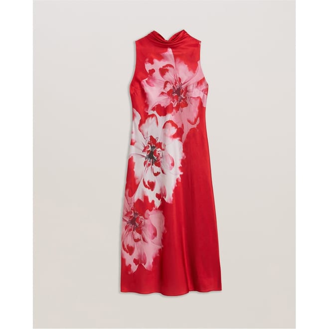 This Ted Baker slip dress features a charming floral pattern, perfect for adding a touch of elegance to any occasion. The midi length and high neck design offer a sophisticated silhouette, while the tie-back closure adds a unique detail. A delicate bow embellishment completes the look, making it a stylish choice for those who appreciate refined fashion. -