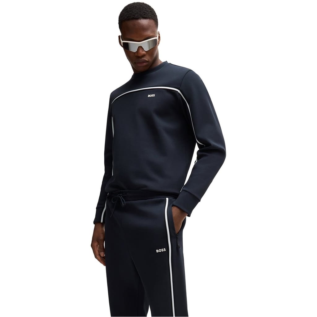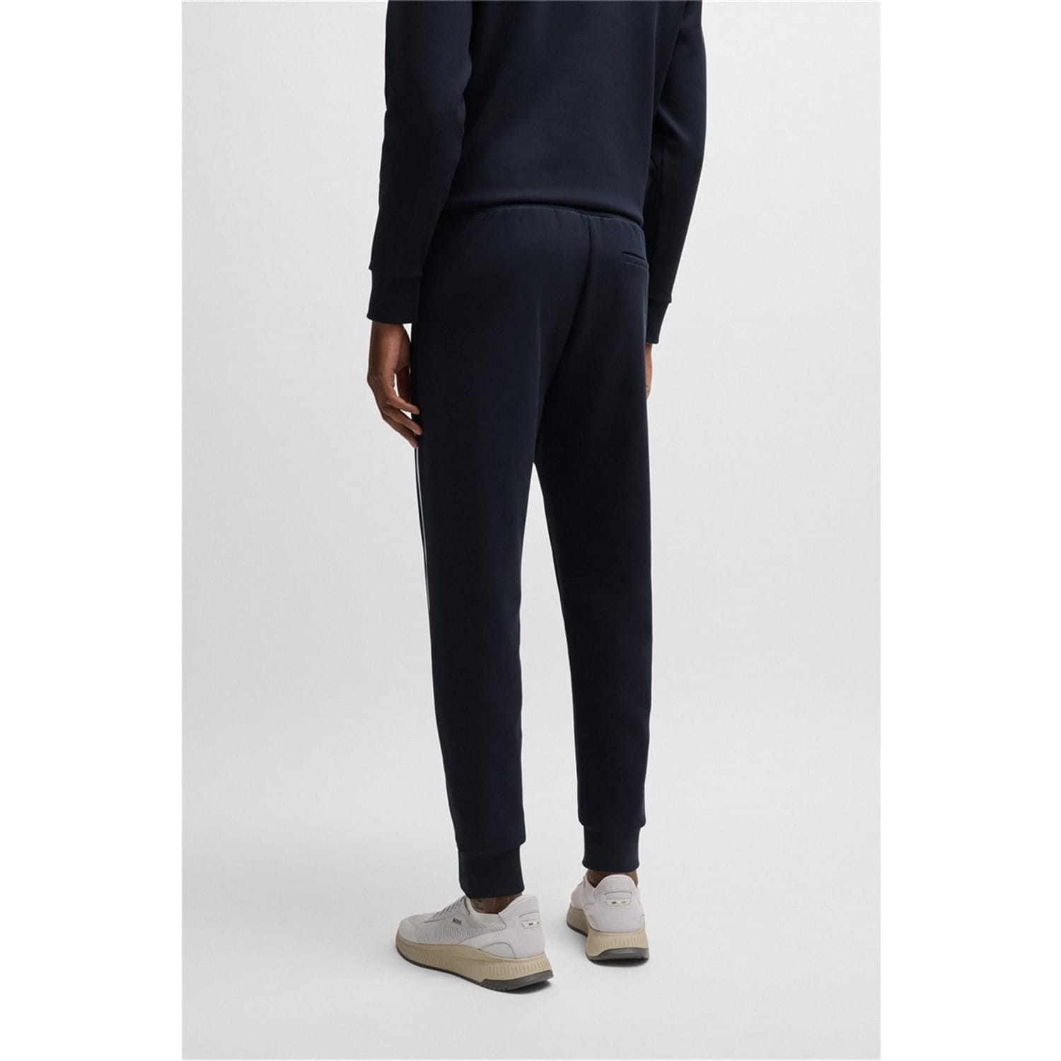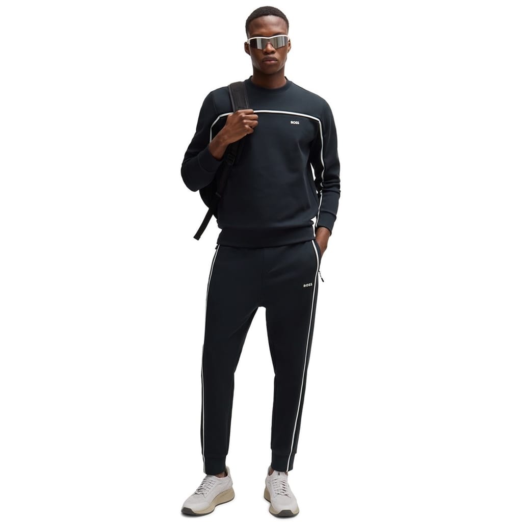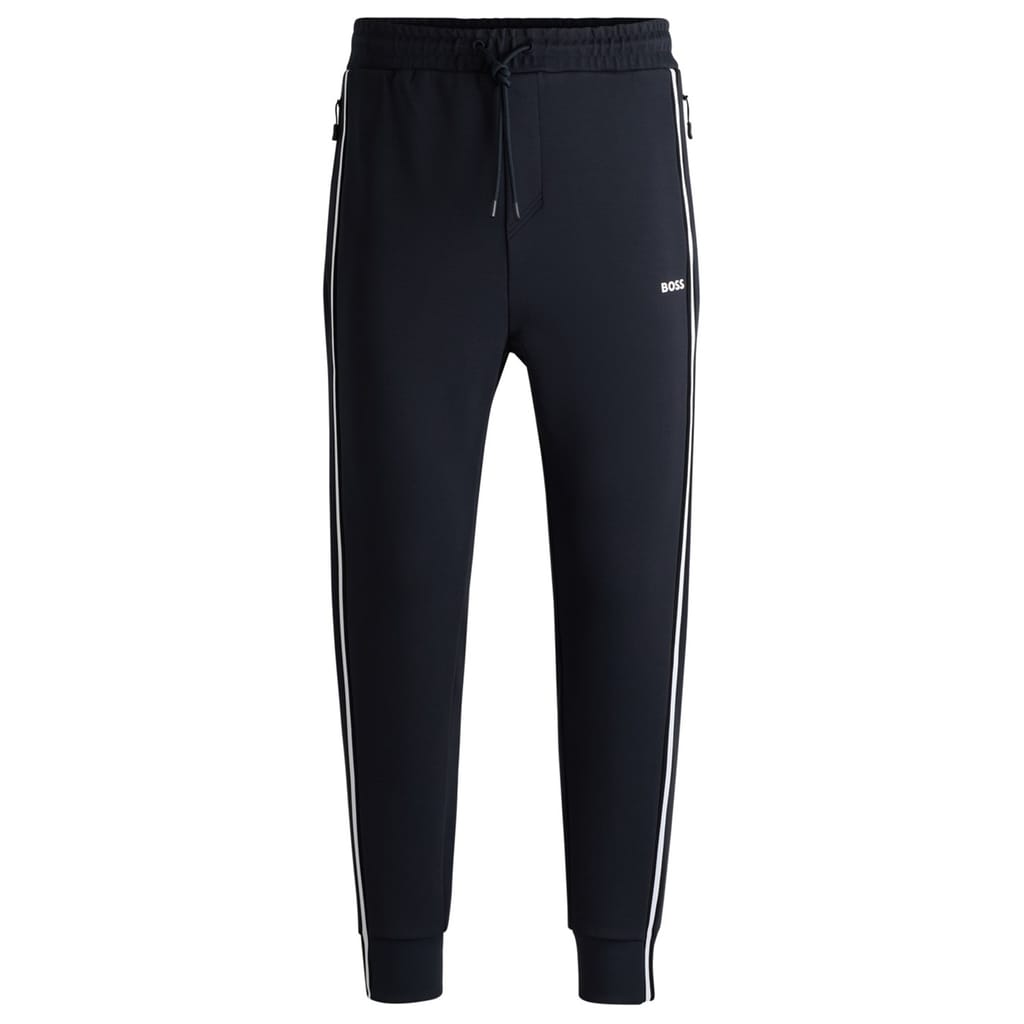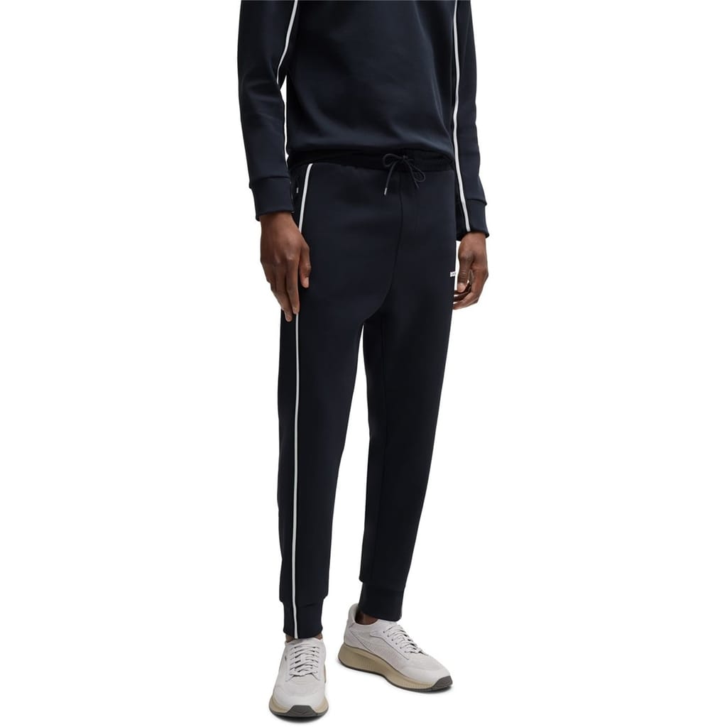 Elevate your casual wardrobe with Boss joggers, featuring a stylish stripe pattern. These regular fit joggers come with a convenient drawstring closure and a cuffed leg design for added comfort. The iconic logo embellishment adds a touch of brand recognition, making these joggers a versatile addition to your collection. -