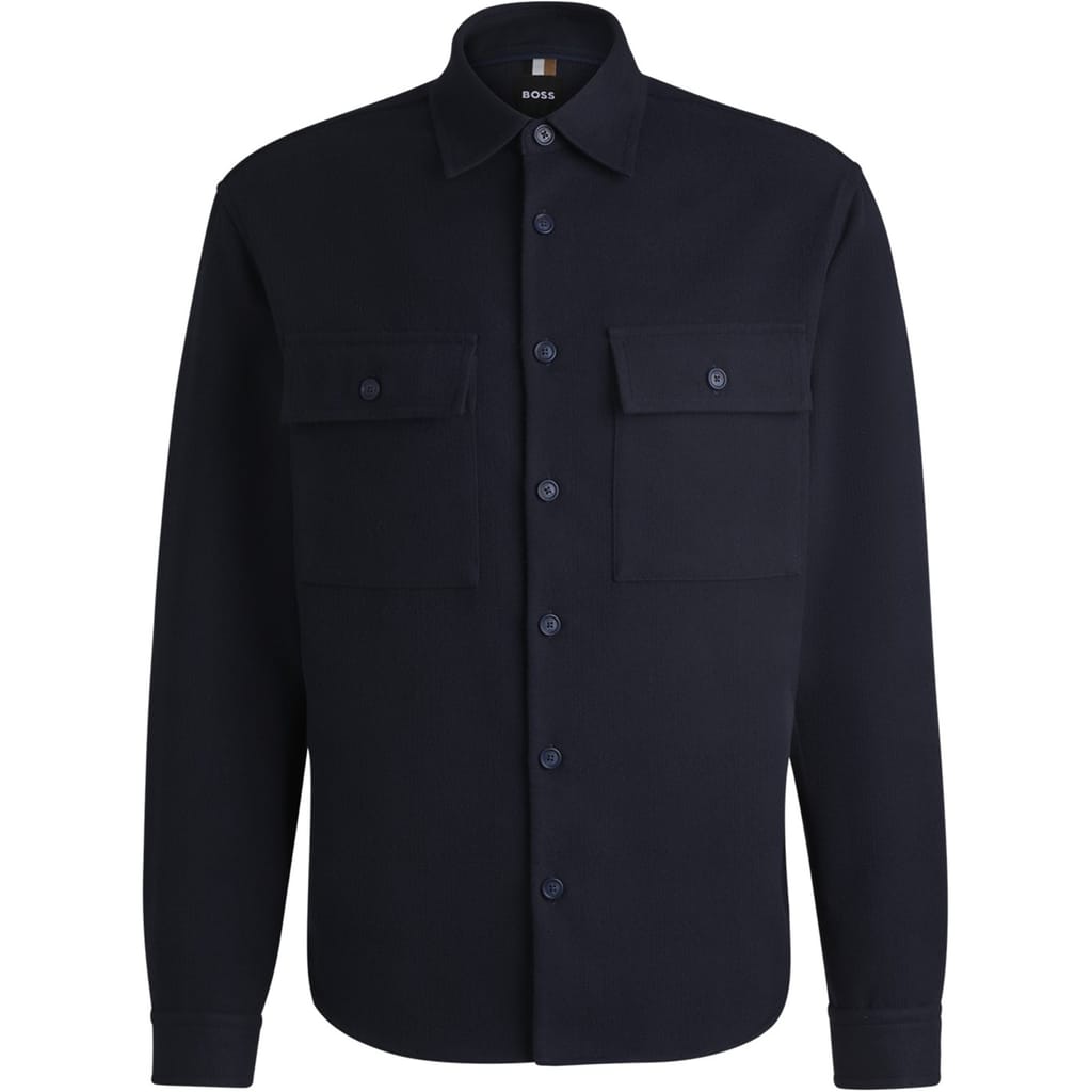 Introducing the Boss overshirt jacket, a stylish addition to your wardrobe. This jacket features a classic shirt collar and a button closure for a timeless look. Designed in a regular fit, it offers comfort and ease of movement. The solid pattern provides a sleek appearance, complemented by practical pocket embellishments, including flap pockets for added functionality. -