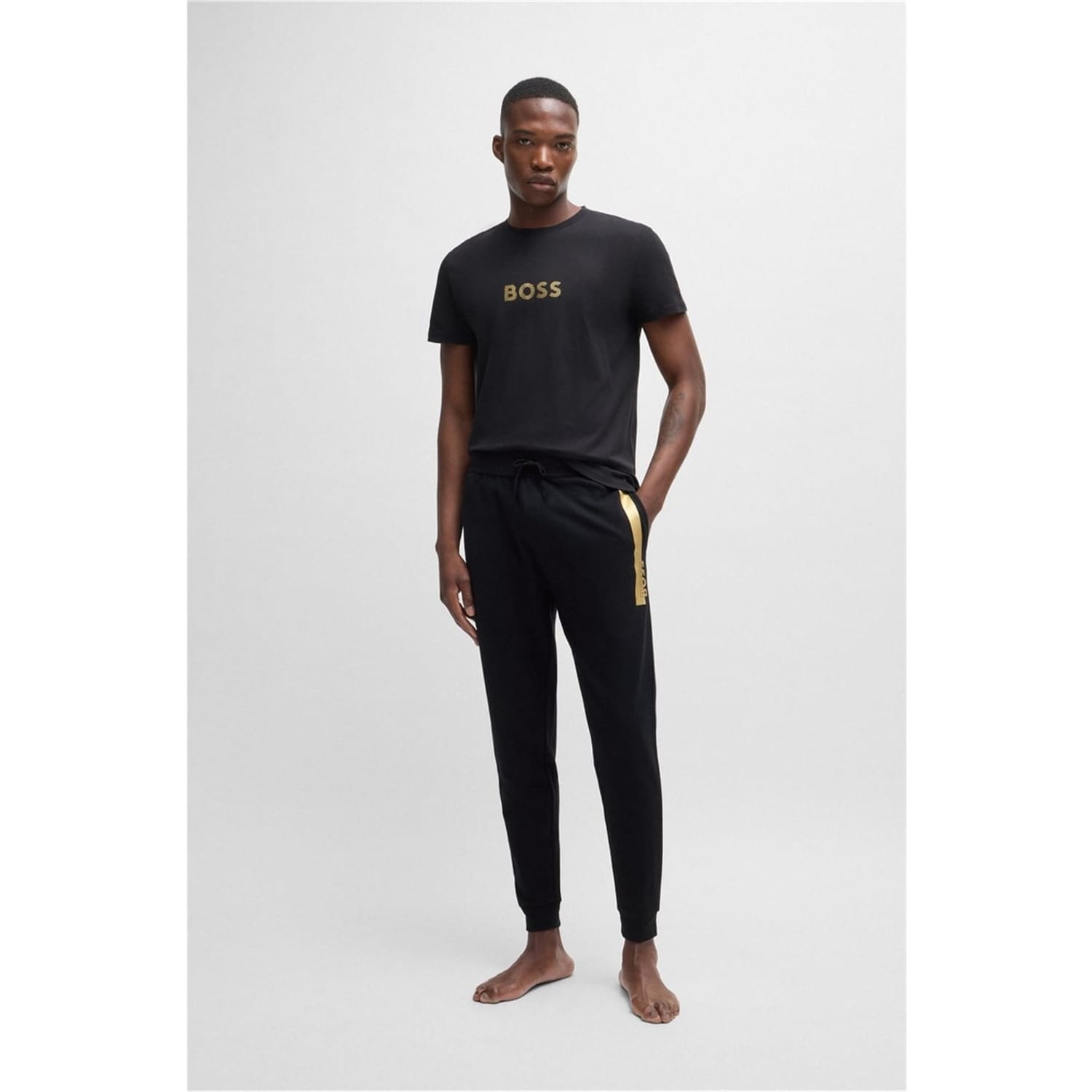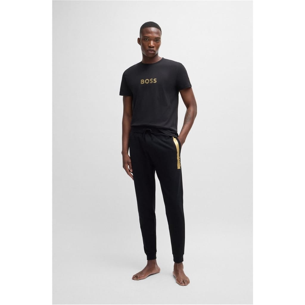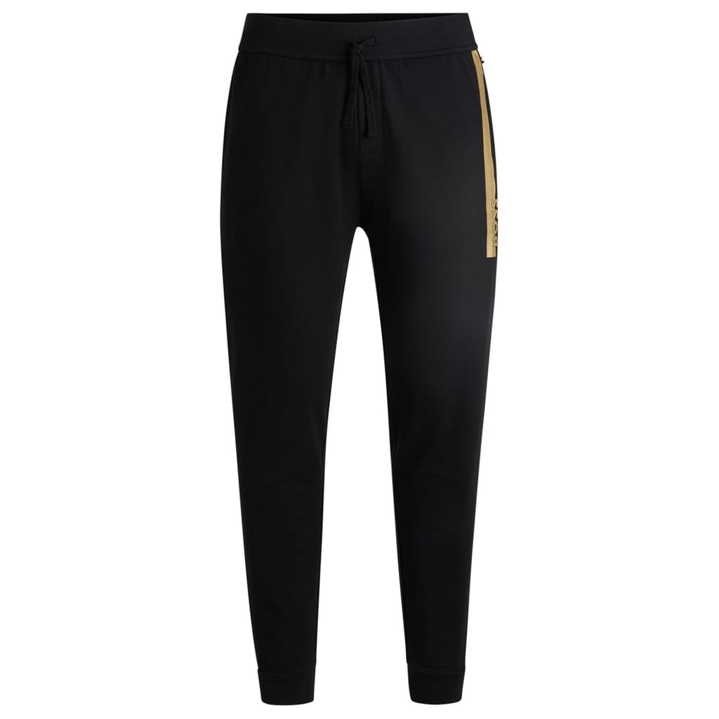 Elevate your loungewear collection with Boss joggers, featuring a drawstring closure for a comfortable fit. These joggers are adorned with a logo and side stripes, adding a touch of style to your casual wardrobe. -