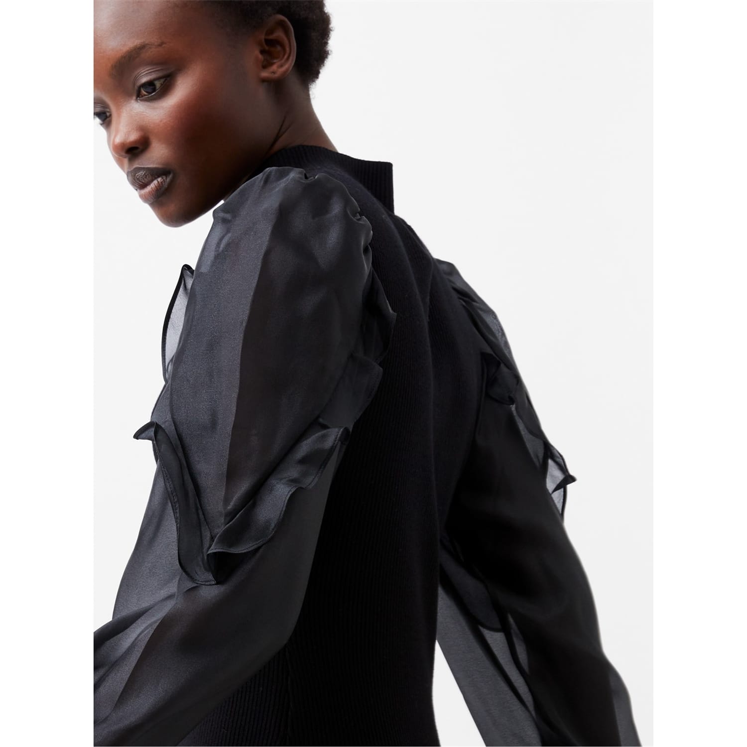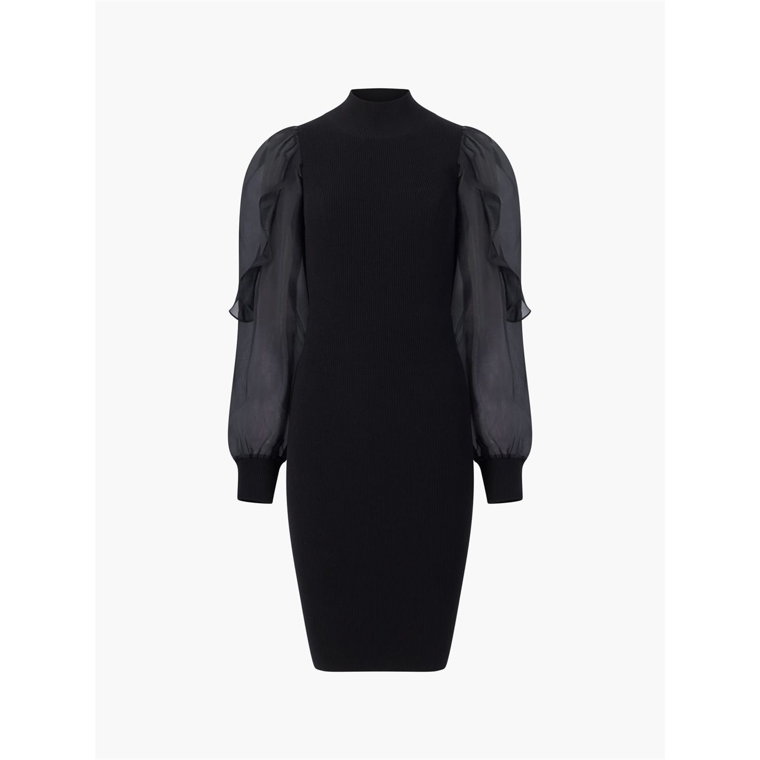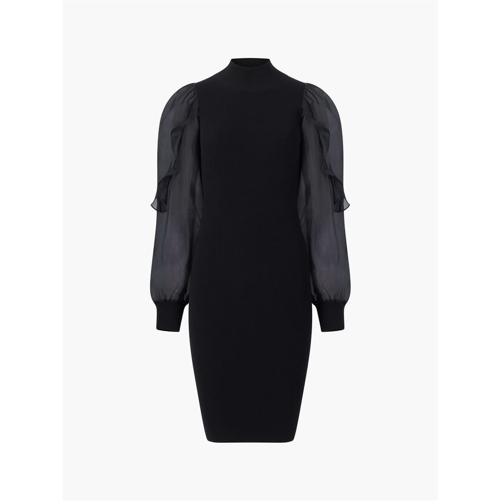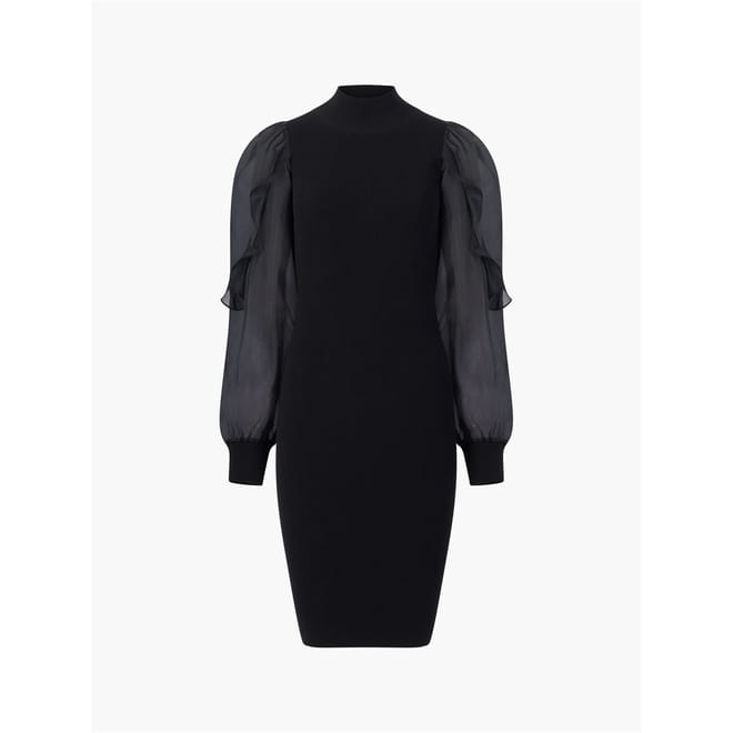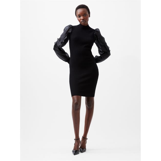 Discover the French Connection bodycon dress, a knee-length knit piece designed for a slim fit. Featuring a high neck and long puff sleeves, this solid dress is adorned with ruffle embellishments, adding a touch of elegance to its classic silhouette. -