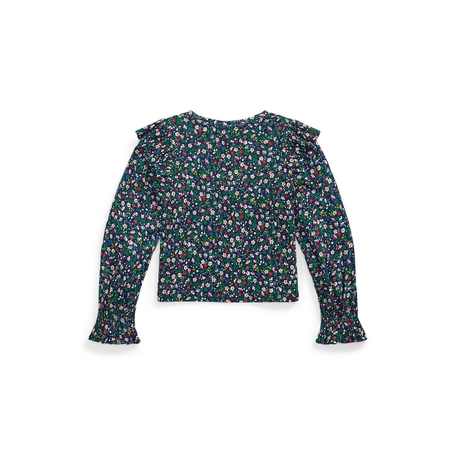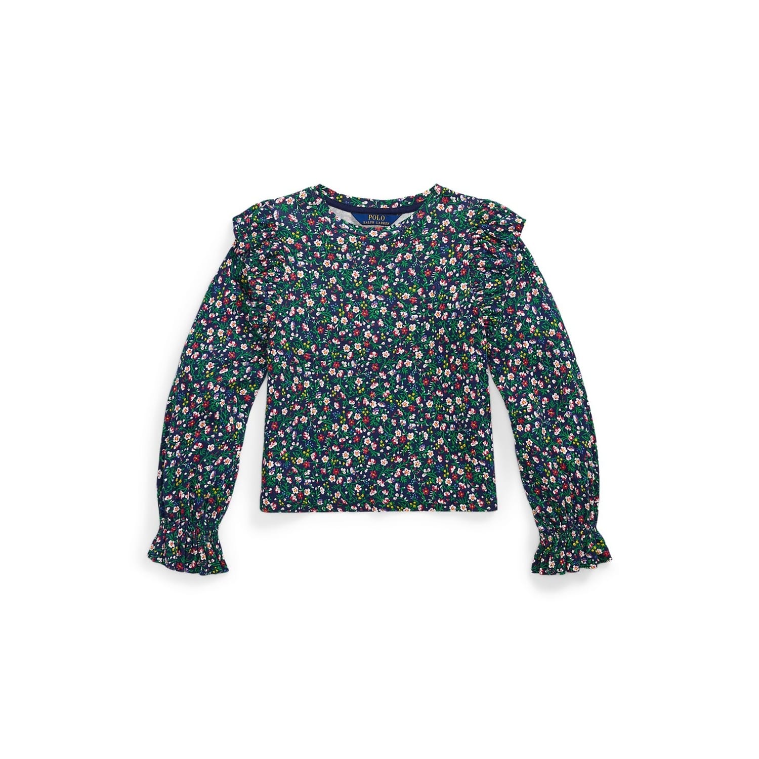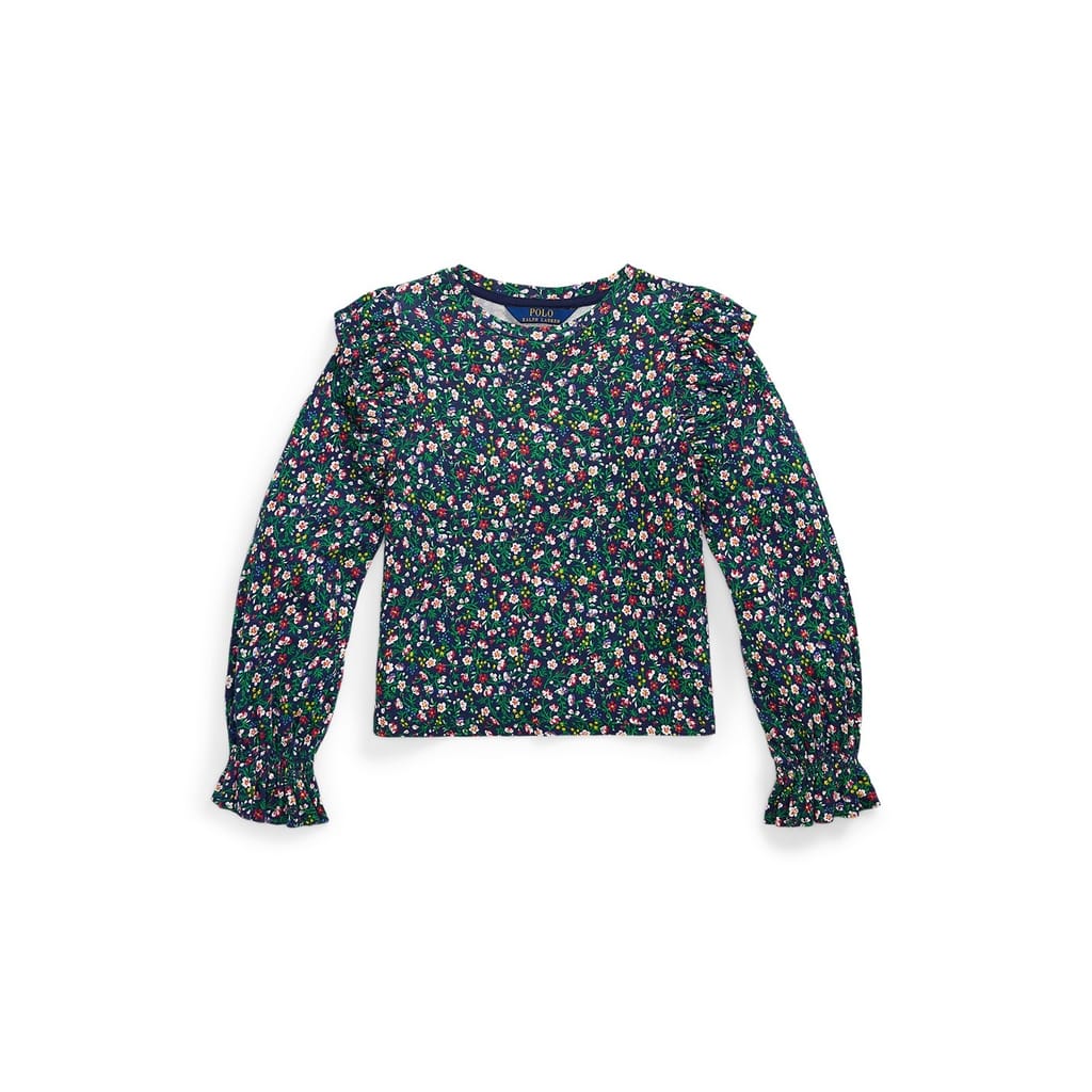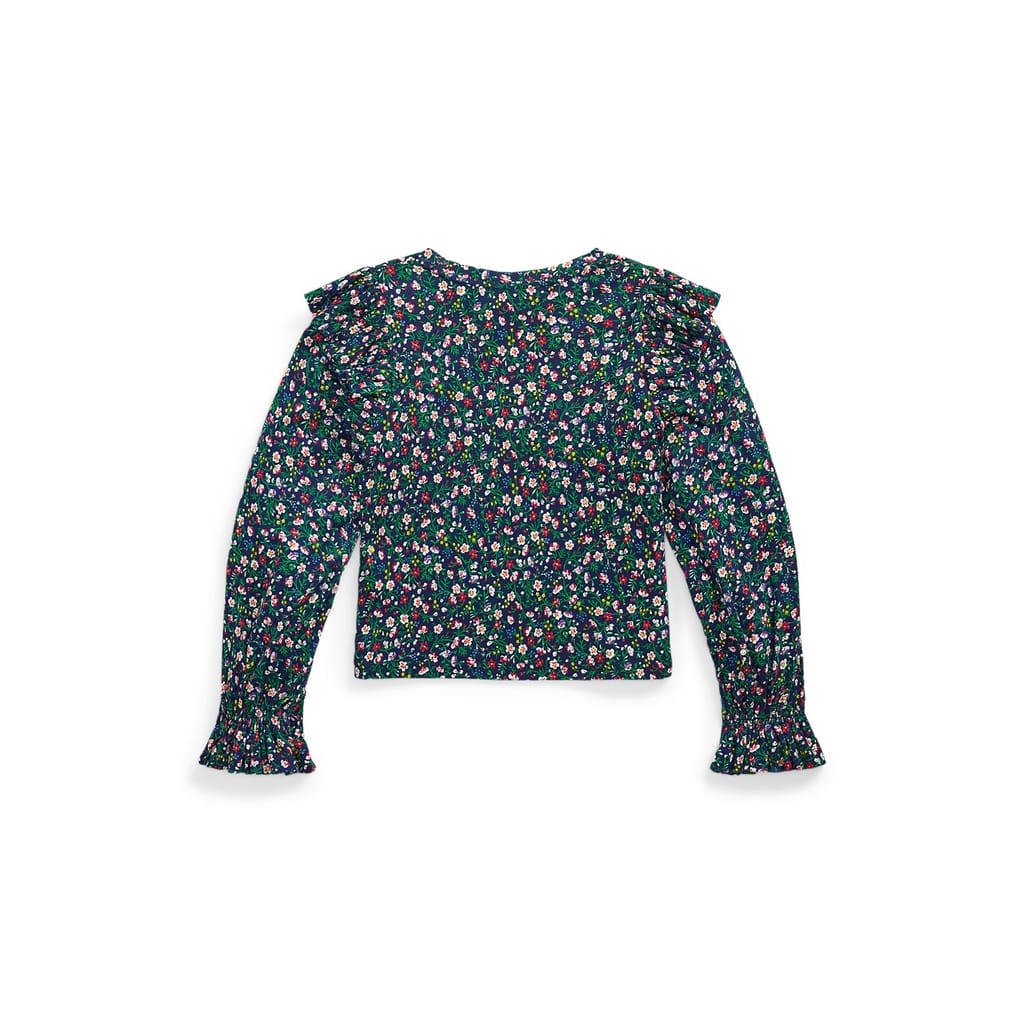This Polo Ralph Lauren top for juniors combines a floral pattern with a knit design. Featuring a crew neck and long ruffle sleeves, it offers a regular fit that ensures comfort and style. Perfect for adding a touch of elegance to any wardrobe. -