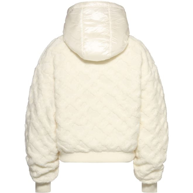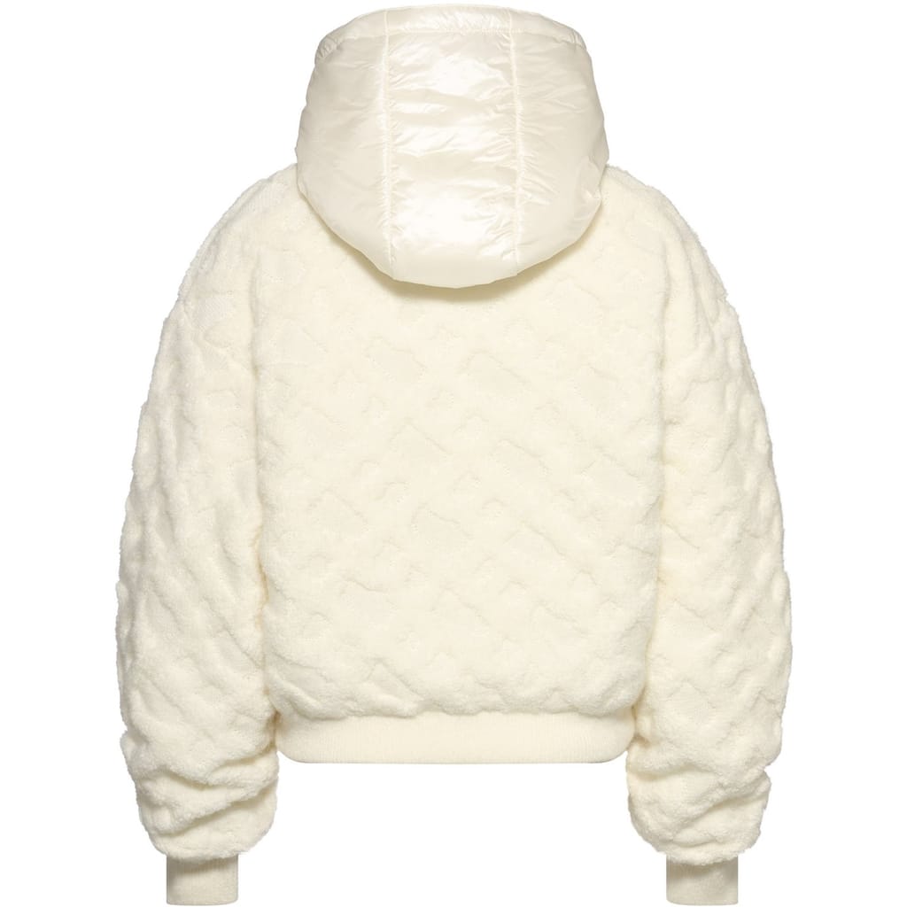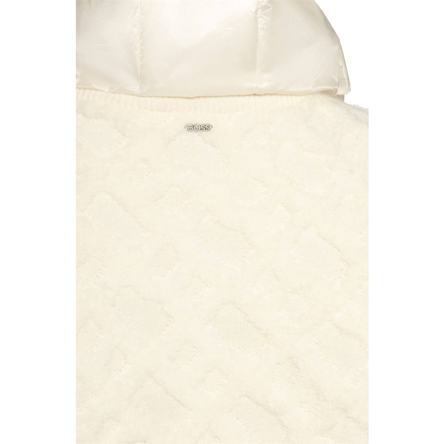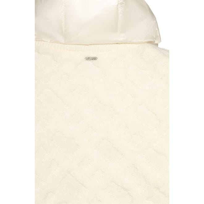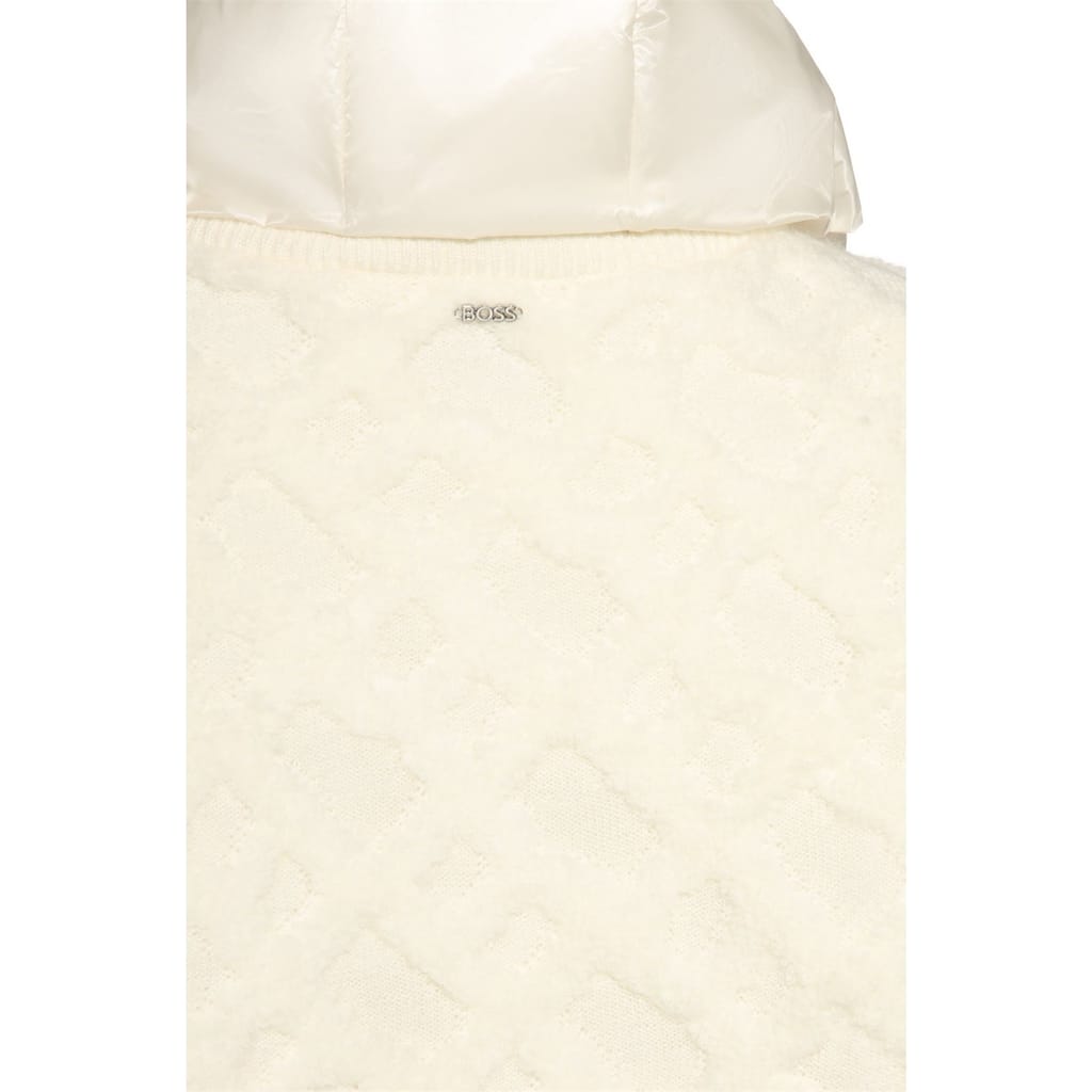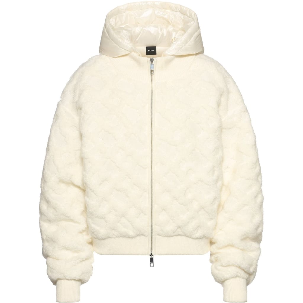 The Boss bomber jacket offers a relaxed fit, perfect for casual comfort. This short, solid knit piece features a hooded neckline and a zipper closure, providing both style and functionality. The ribbed cuffs add a refined touch, while the logo embellishment completes the look with subtle branding. -