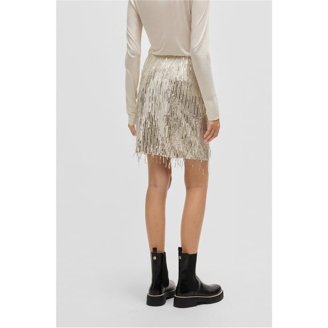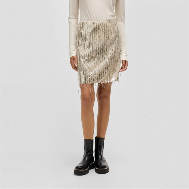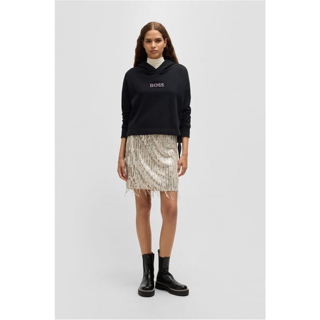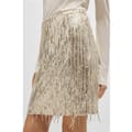 This Boss mini skirt is a standout piece from the casual collection. Designed with a regular fit, it features eye-catching sequin and fringe embellishments, adding a touch of flair to your wardrobe. Perfect for those seeking a stylish and contemporary look. -