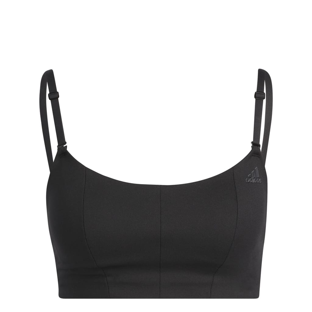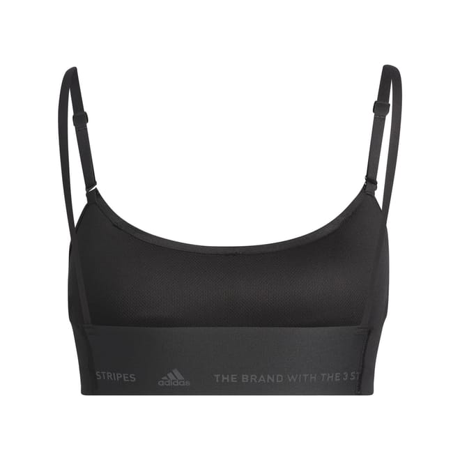 Enhance your training sessions with this adidas sports bra. Designed for activewear, it features a scoop neck design for optimal comfort. The solid pattern and iconic logo embellishment add a touch of style, making it a perfect addition to your sporting activity wardrobe. -