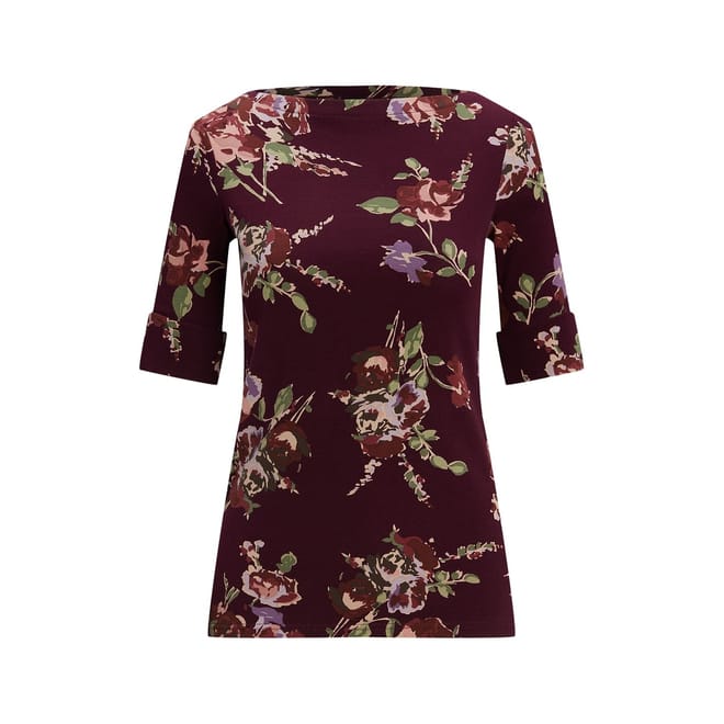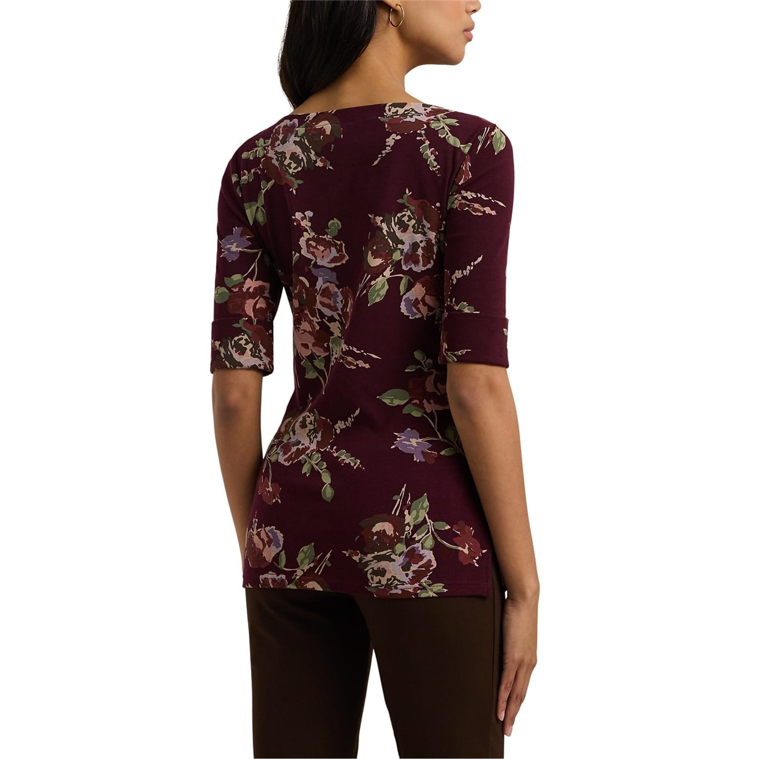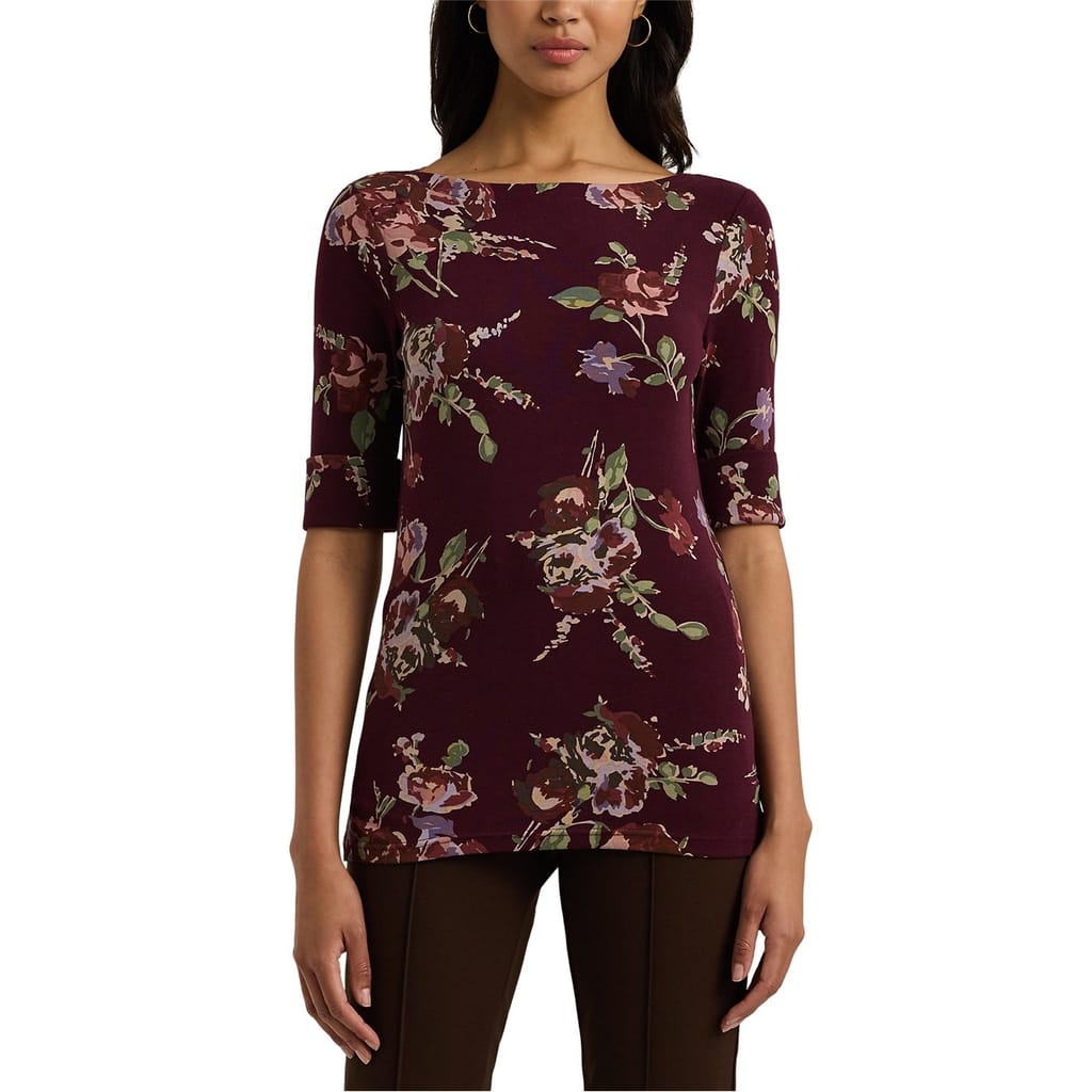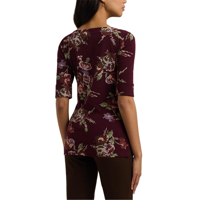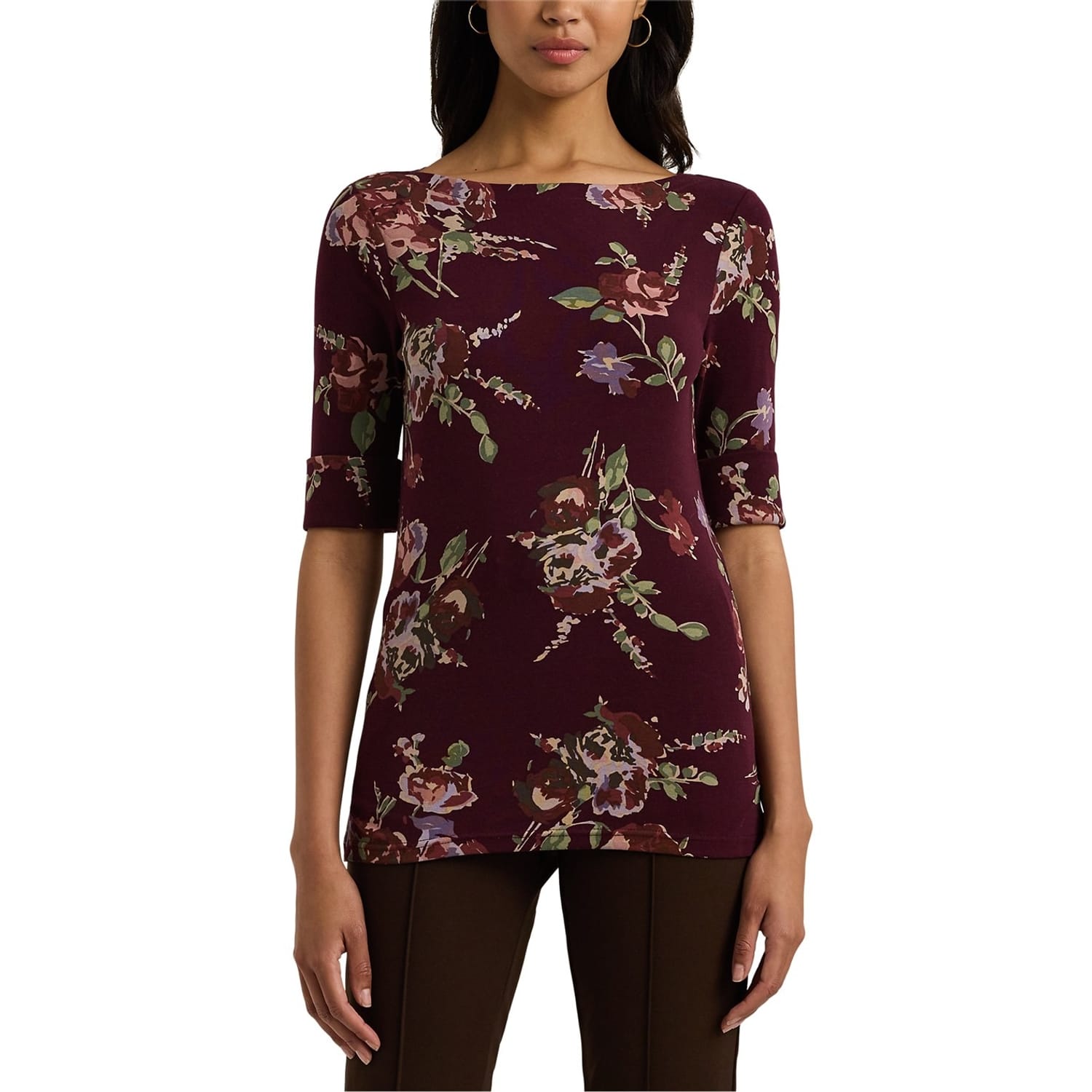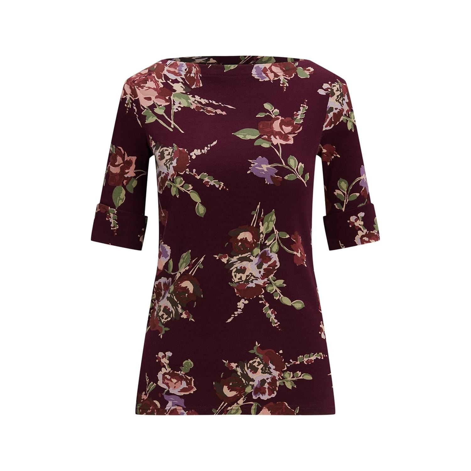 This Lauren by Ralph Lauren T-shirt features a regular fit and a stylish boat neck. The three-quarter sleeves add to its casual appeal, making it ideal for everyday wear. Adorned with a charming floral pattern, this Judy top is perfect for adding a touch of elegance to your wardrobe. -
