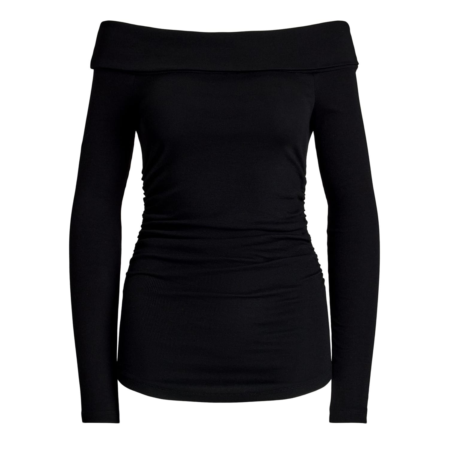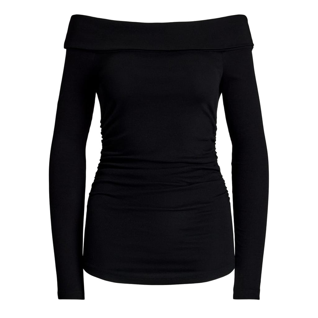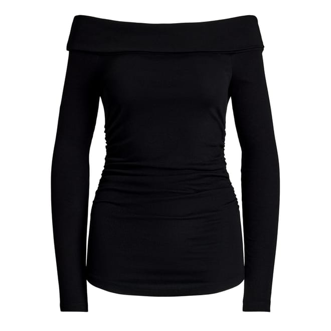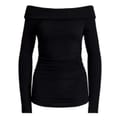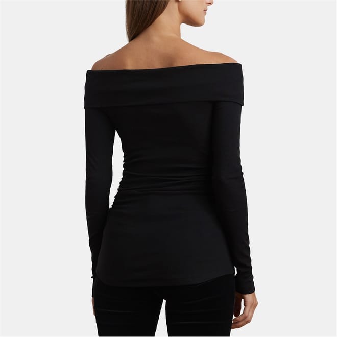 This Lauren by Ralph Lauren blouse features a chic off-the-shoulder neckline and long sleeves, creating an elegant silhouette. Designed with a slim fit, this top offers a sleek and contemporary look. Perfect for those who appreciate a blend of classic and modern style in their wardrobe. -