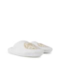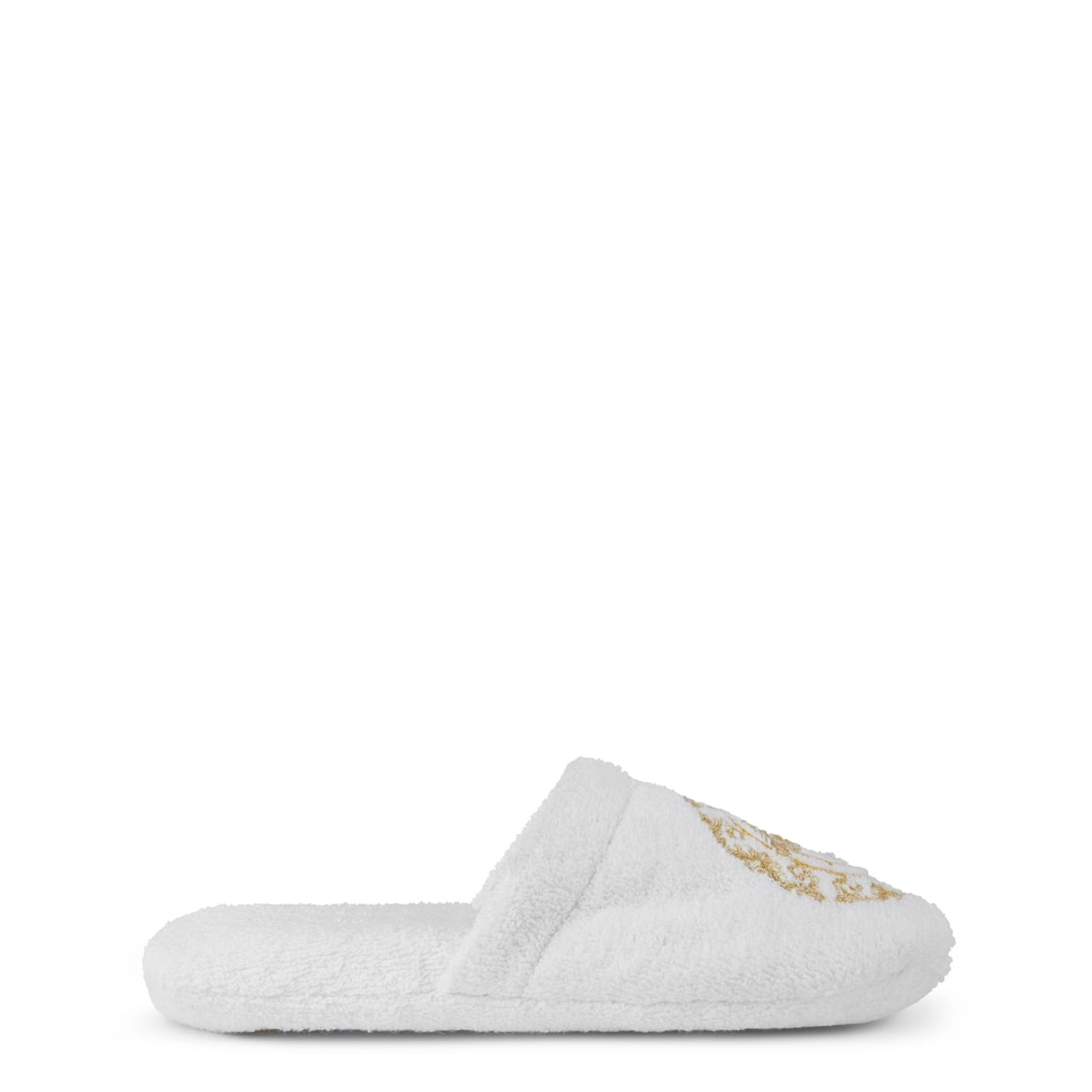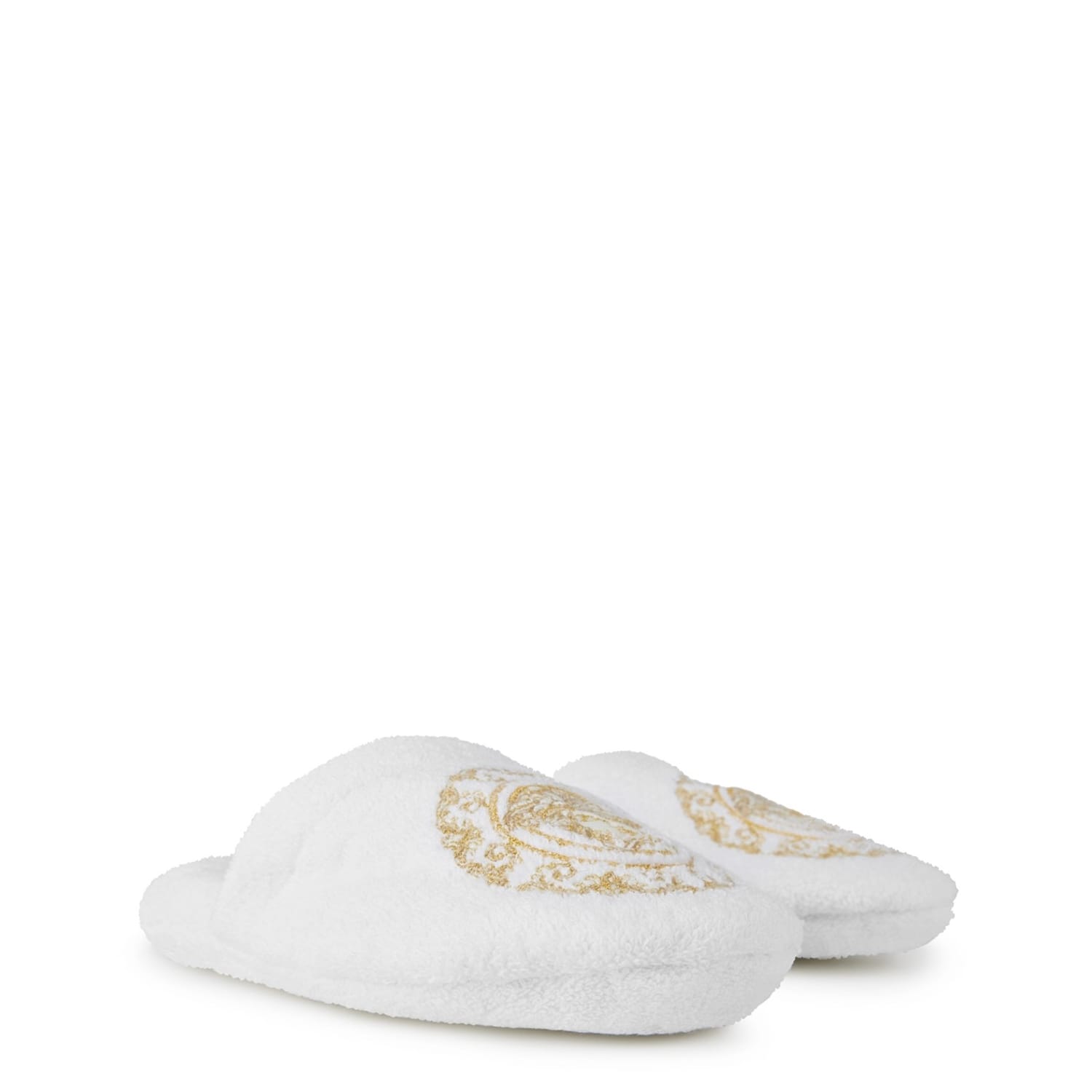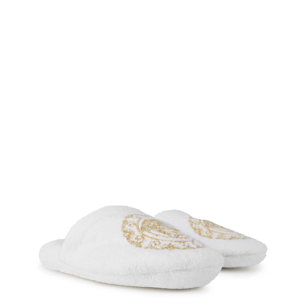 Discover the luxurious leather slippers by Versace Home, designed for those who appreciate sophistication. These shoes feature a round toe, offering both comfort and style. Perfectly crafted from high-quality leather, they embody elegance and timeless design. Ideal for those seeking a blend of modern luxury and classic appeal. -