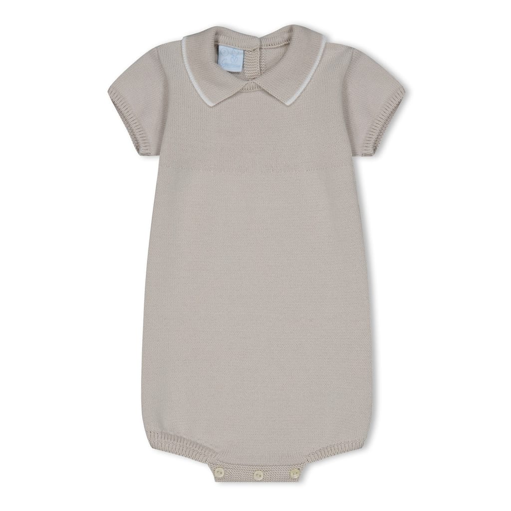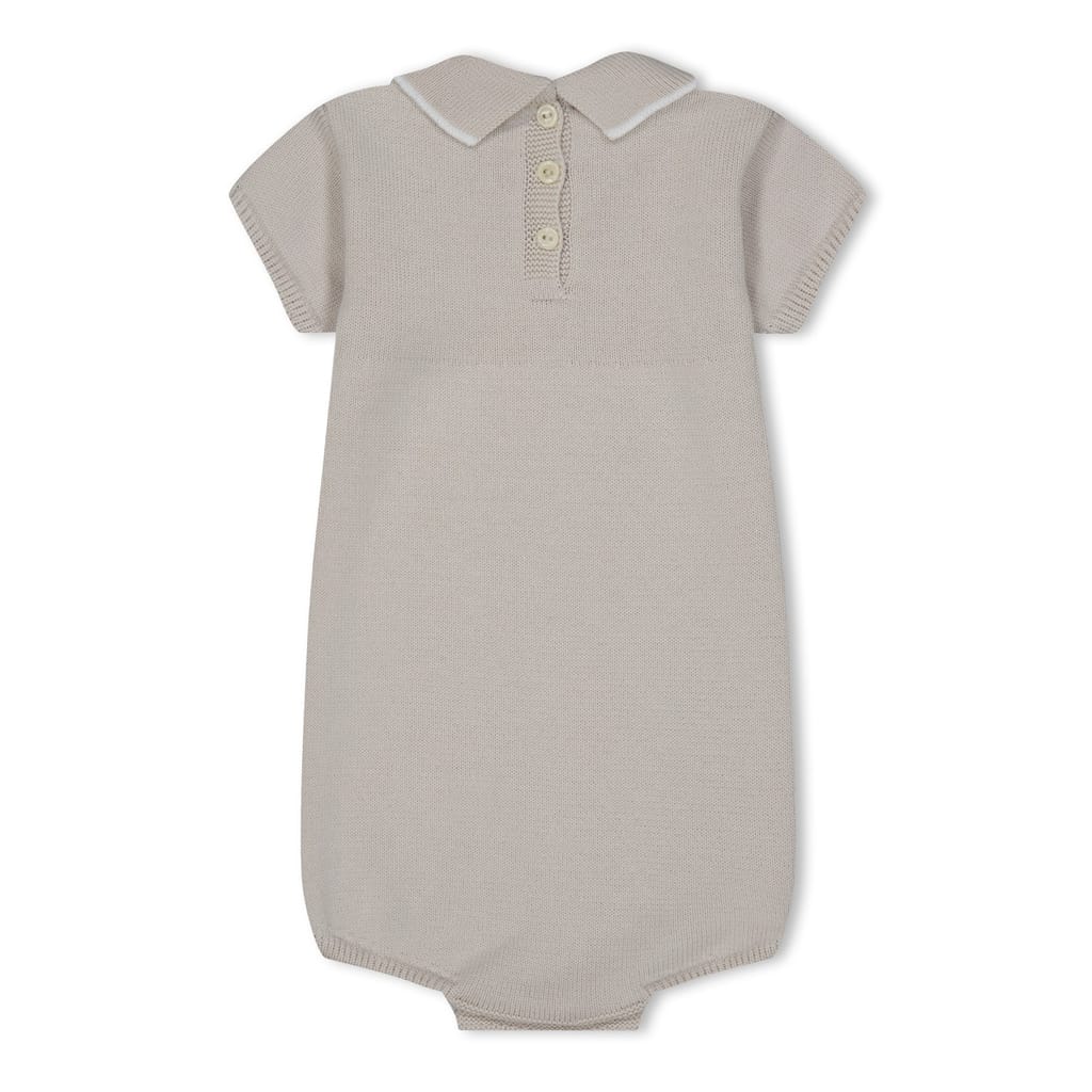 This Artesania Granlei romper is designed for babies, featuring a collared neck and short plain sleeves. The regular fit ensures comfort, while the button closure and button placket add a touch of detail. The shortalls style makes it a practical choice for little ones. -