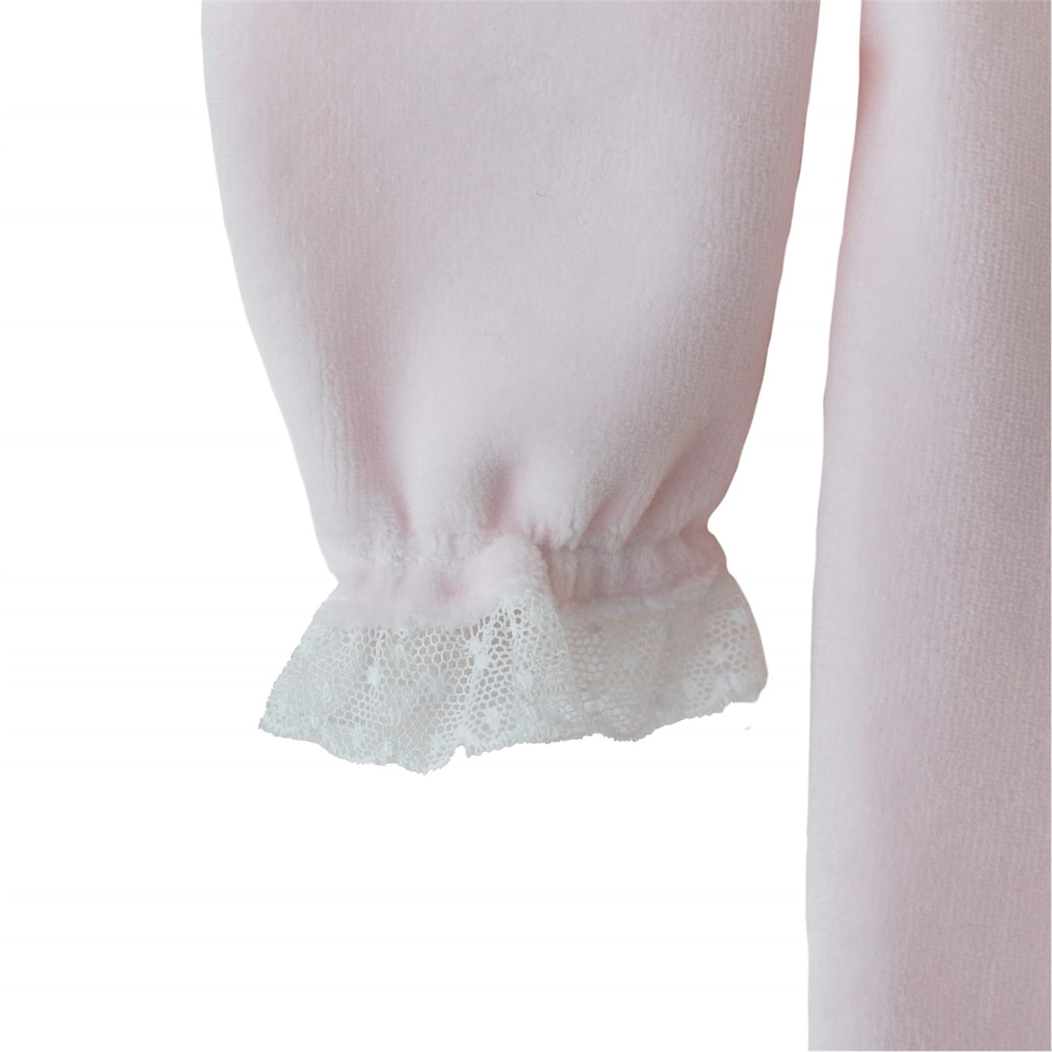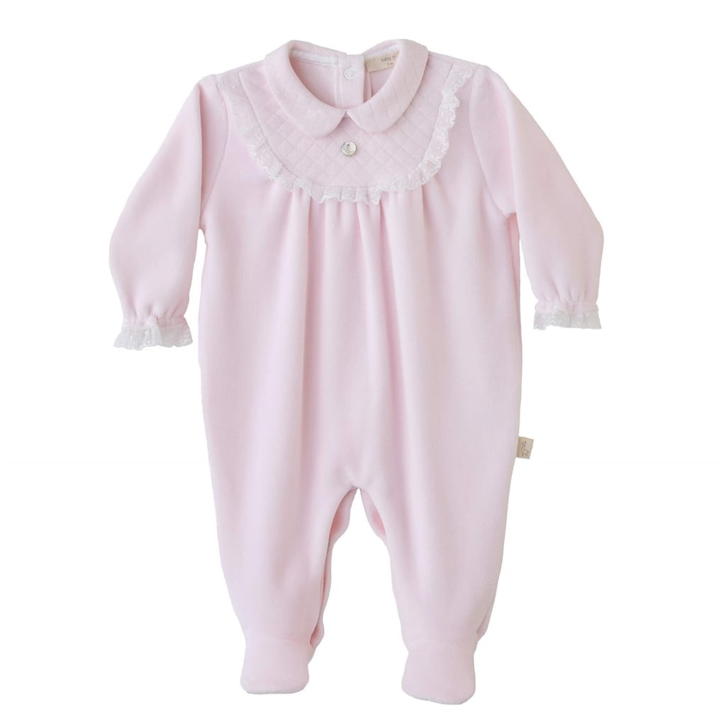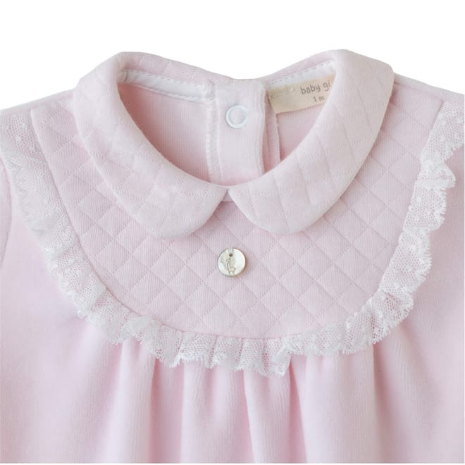 Discover the Baby Gi romper, a charming onesie featuring a collared neck and long cuff sleeves. This regular fit piece is adorned with delicate lace trim, a charming embellishment, and ruffles, adding a touch of elegance. The snap button closure ensures easy dressing, making it a practical choice for any occasion. -