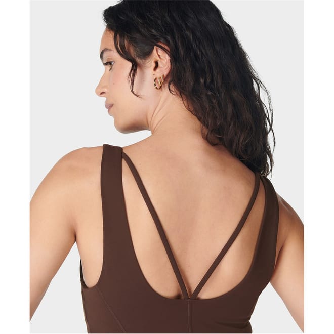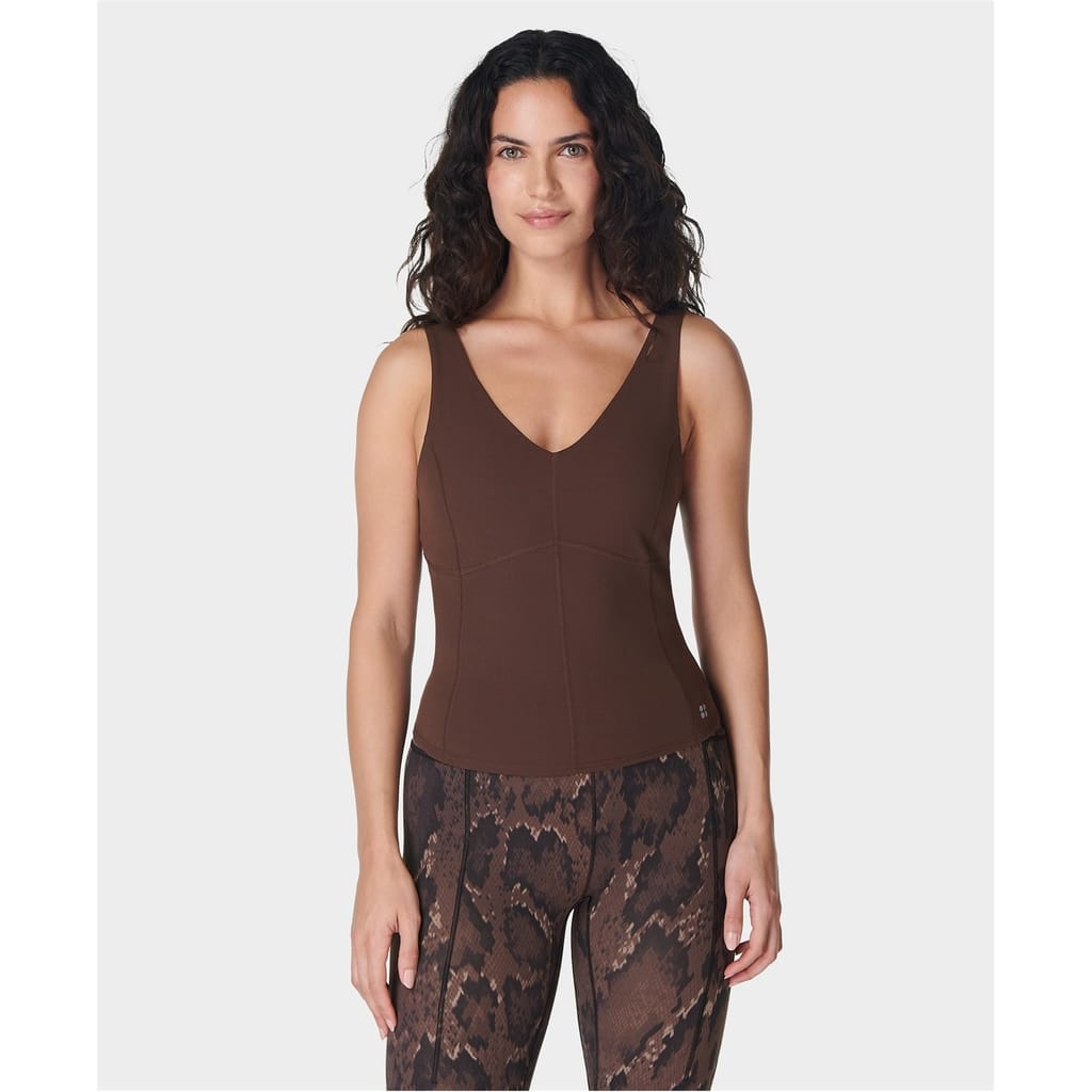 Discover the Sweaty Betty top, designed with a sleek racerback and a subtle logo embellishment. This sleeveless piece features a V-neck and a solid pattern, offering a slim fit. Crafted from super soft materials, it ensures comfort and style in one. -