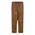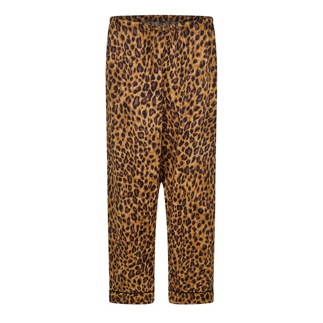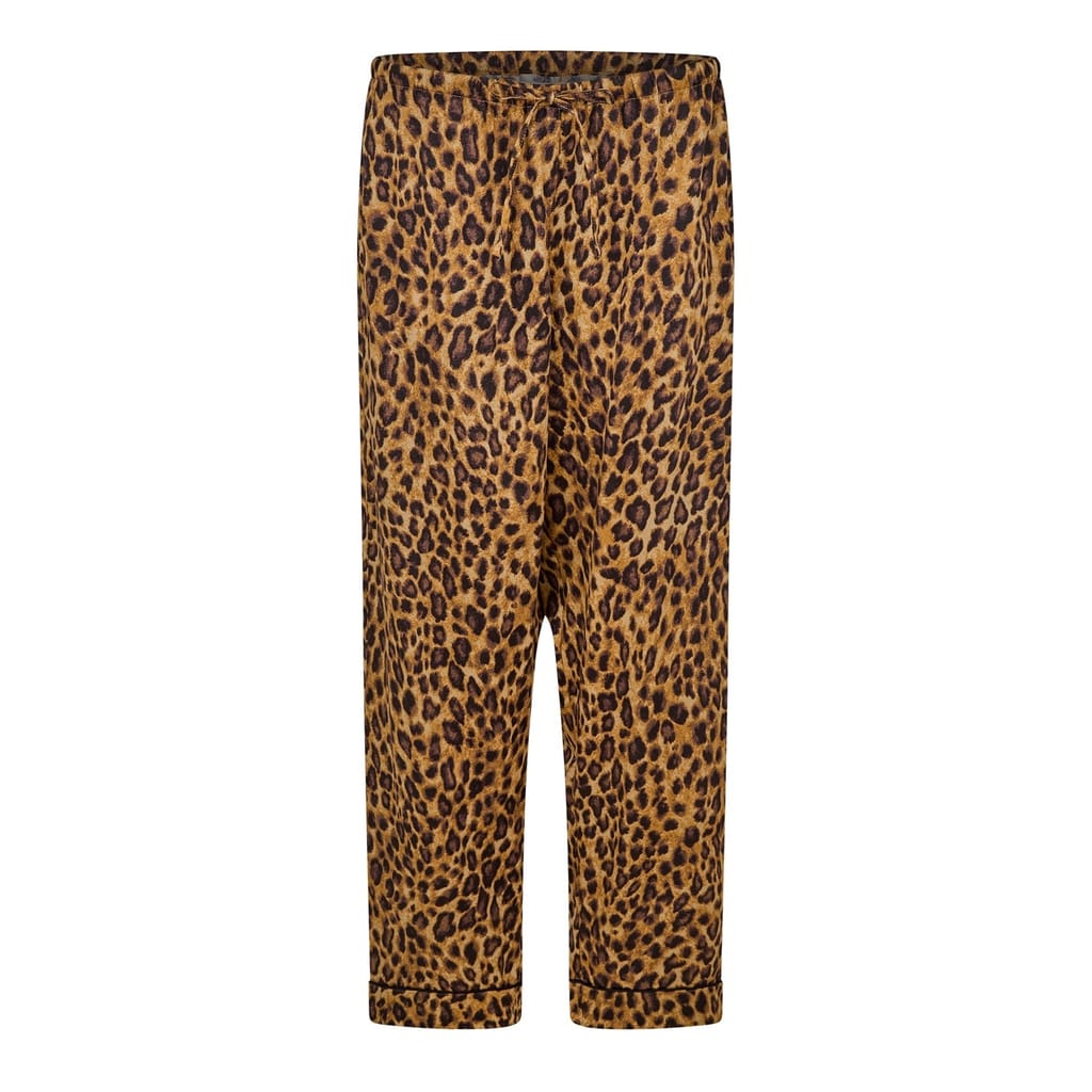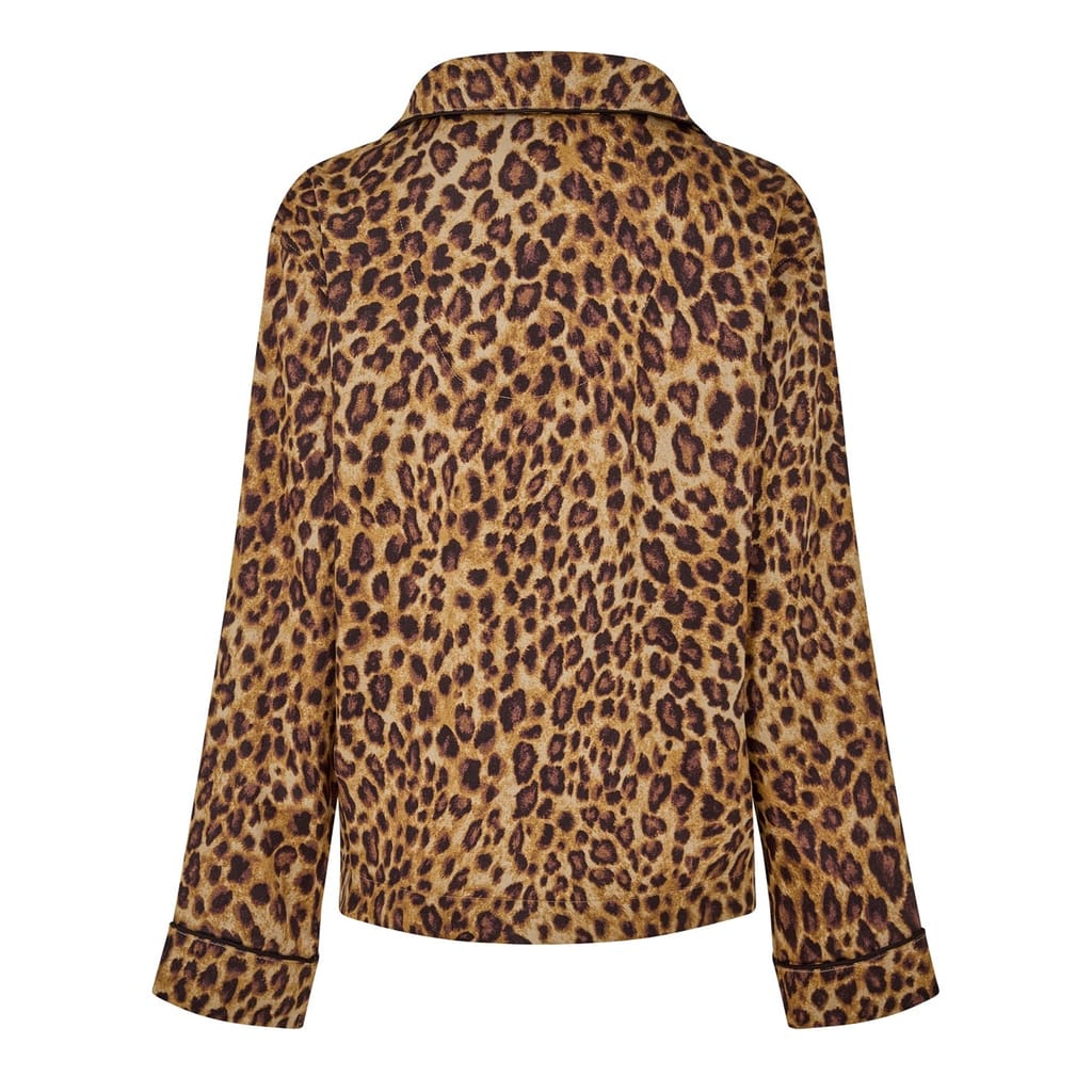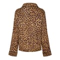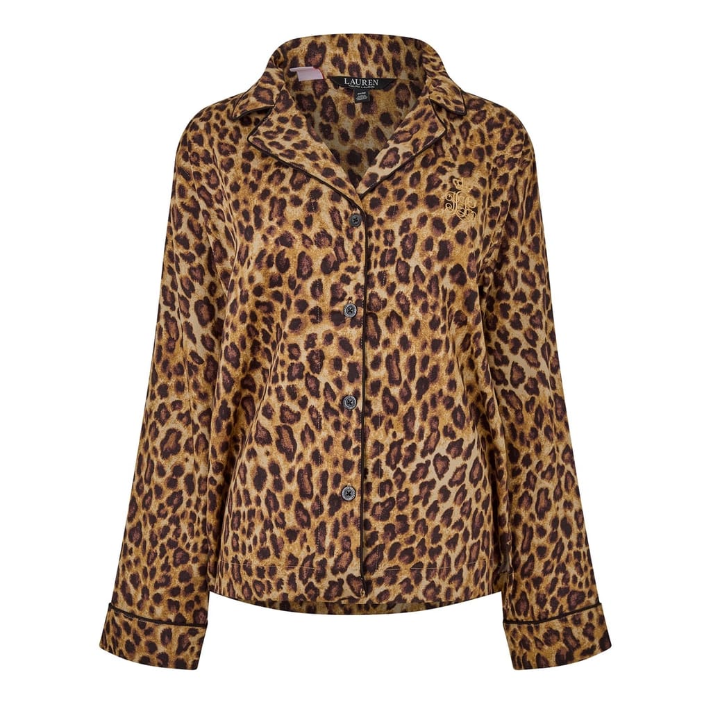 This Lauren by Ralph Lauren sleepwear set features a leopard pattern and includes a collared neck, long sleeve top with a button closure, and regular fit. The two-piece pajama set is adorned with a monogram embellishment, adding a touch of elegance to your loungewear collection. -
