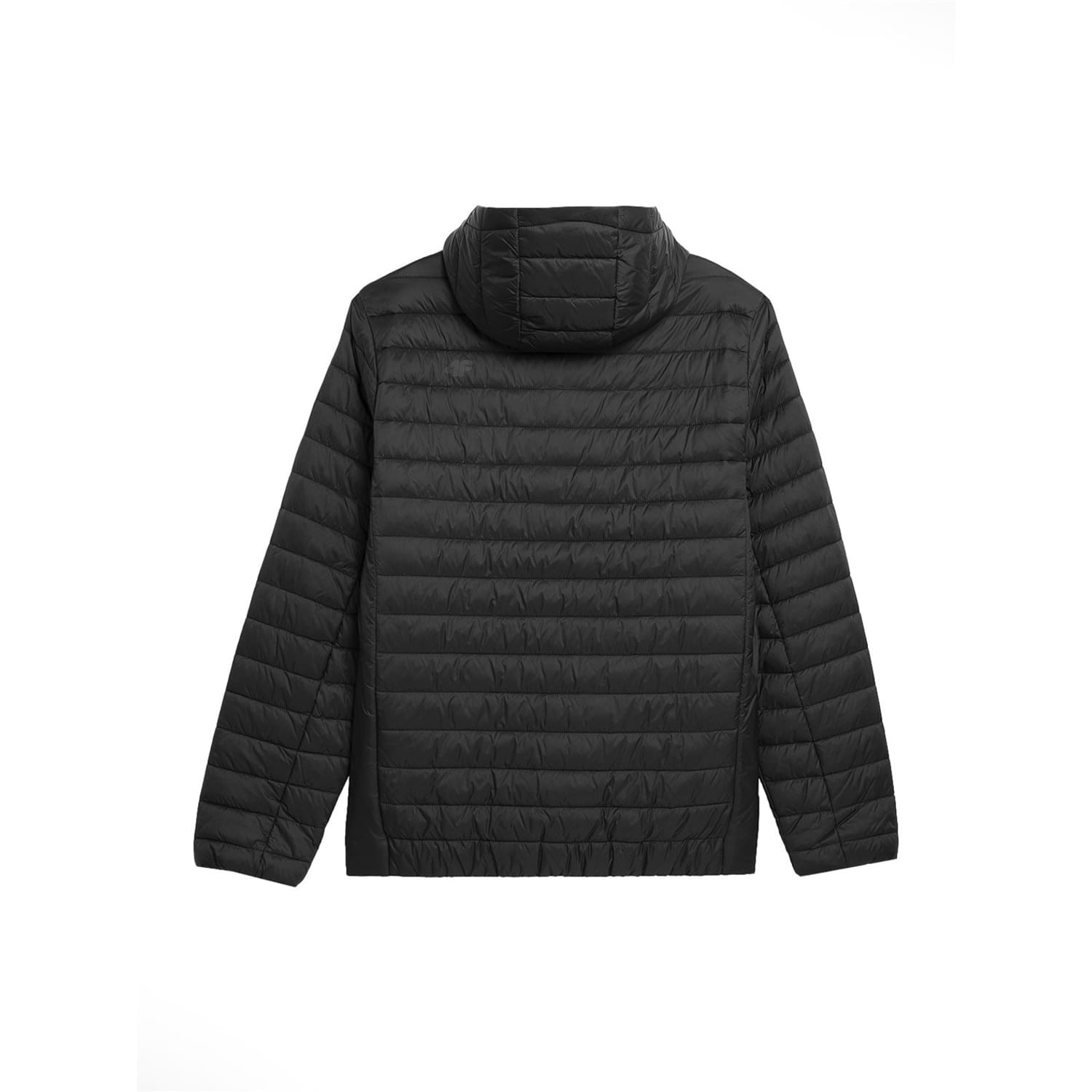 This 4F puffer jacket combines the warmth of a down jacket with a lightweight design. Featuring a hooded neckline and a zip closure, it offers practicality and style. The jacket showcases a regular fit with a solid pattern, and is adorned with a logo for a touch of brand identity. Perfect for keeping warm in cooler weather. -