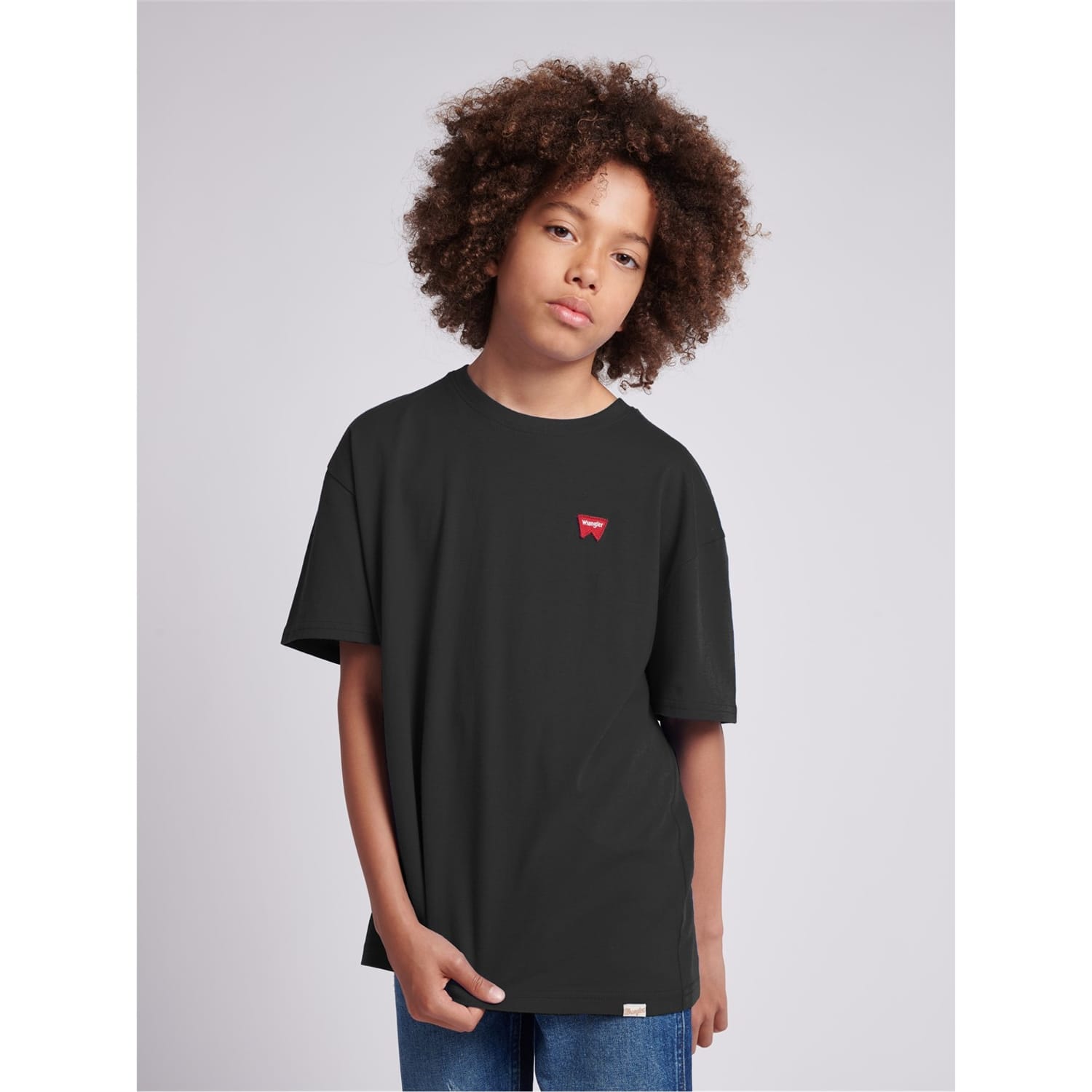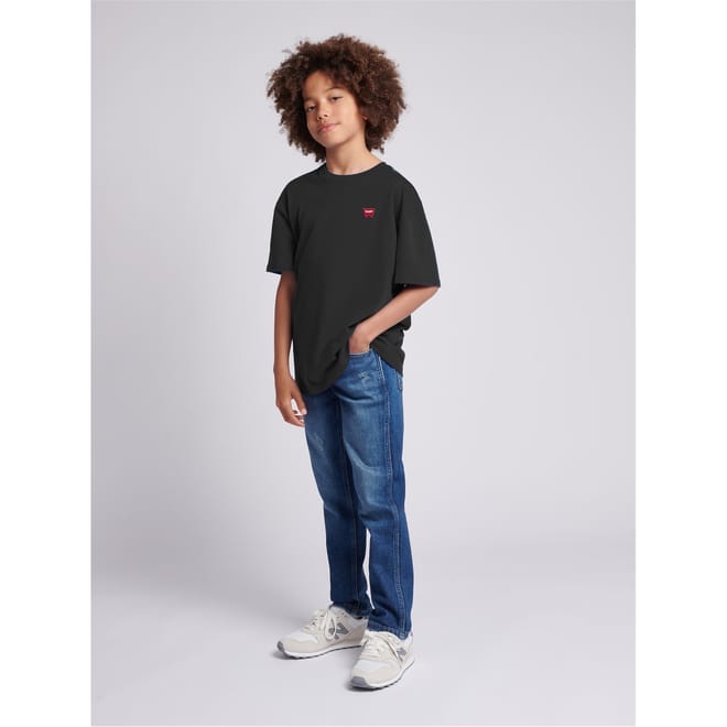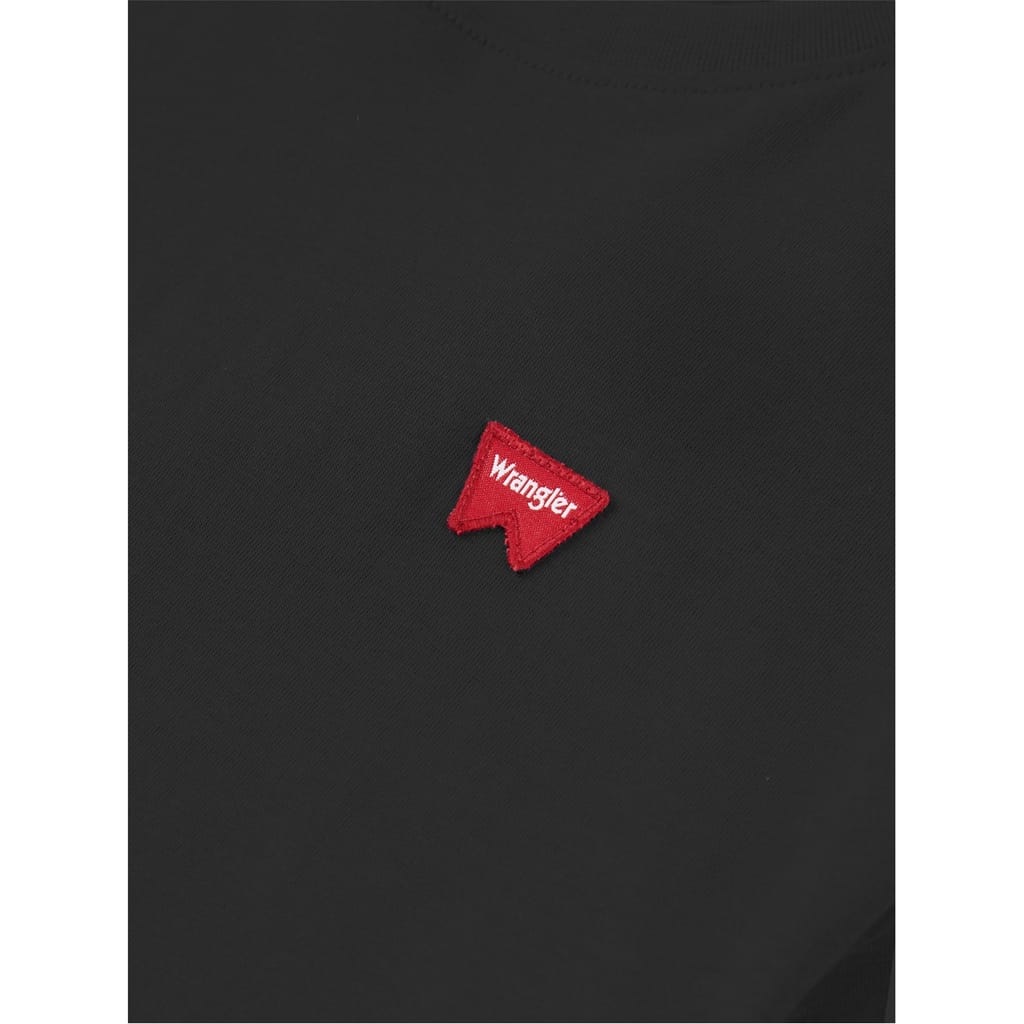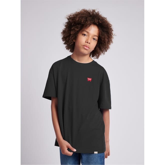This Wrangler top for children is a casual staple featuring a regular fit and a solid pattern. The short sleeves and crew neck design offer comfort and style. Embellished with a distinctive badge and logo, this top is perfect for everyday wear. -