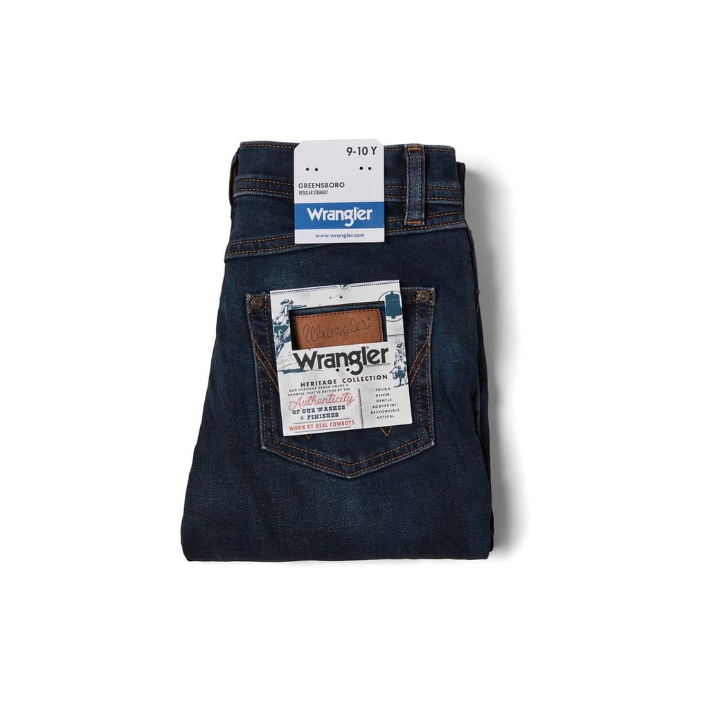Discover the timeless appeal of Wrangler's five-pocket design jeans, featuring a regular fit for comfort and style. These classic jeans come with a zip fly and button closure, ensuring a secure fit. The iconic logo and logo patch add a touch of authenticity, making them a staple in any wardrobe. -