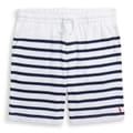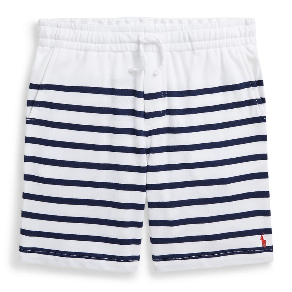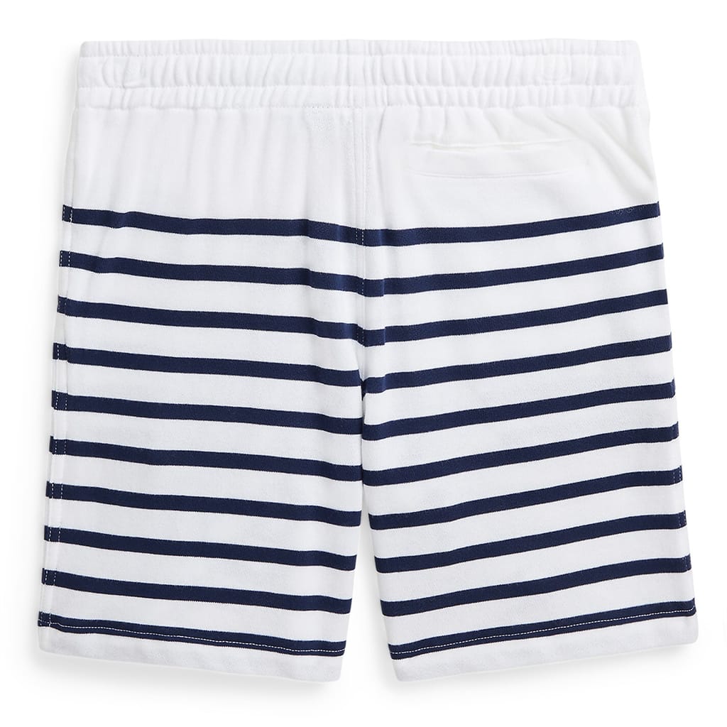 These Polo Ralph Lauren sweat shorts feature a stylish stripe pattern and are perfect for casual wear. Designed with a comfortable drawstring closure, they offer an easy fit. The iconic logo embellishment adds a touch of brand recognition, making them a versatile addition to any wardrobe. -