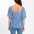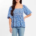 The Be You blouse showcases a unique blend of waffle and floral patterns, offering a distinct aesthetic. Featuring a square neck and short balloon sleeves, this peasant-style top is crafted for comfort with a regular fit. Perfect for adding a touch of elegance to any ensemble. -