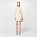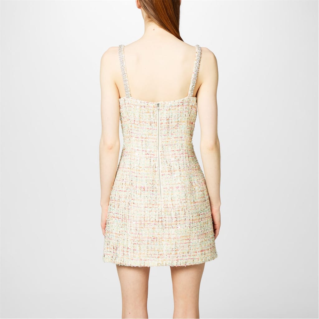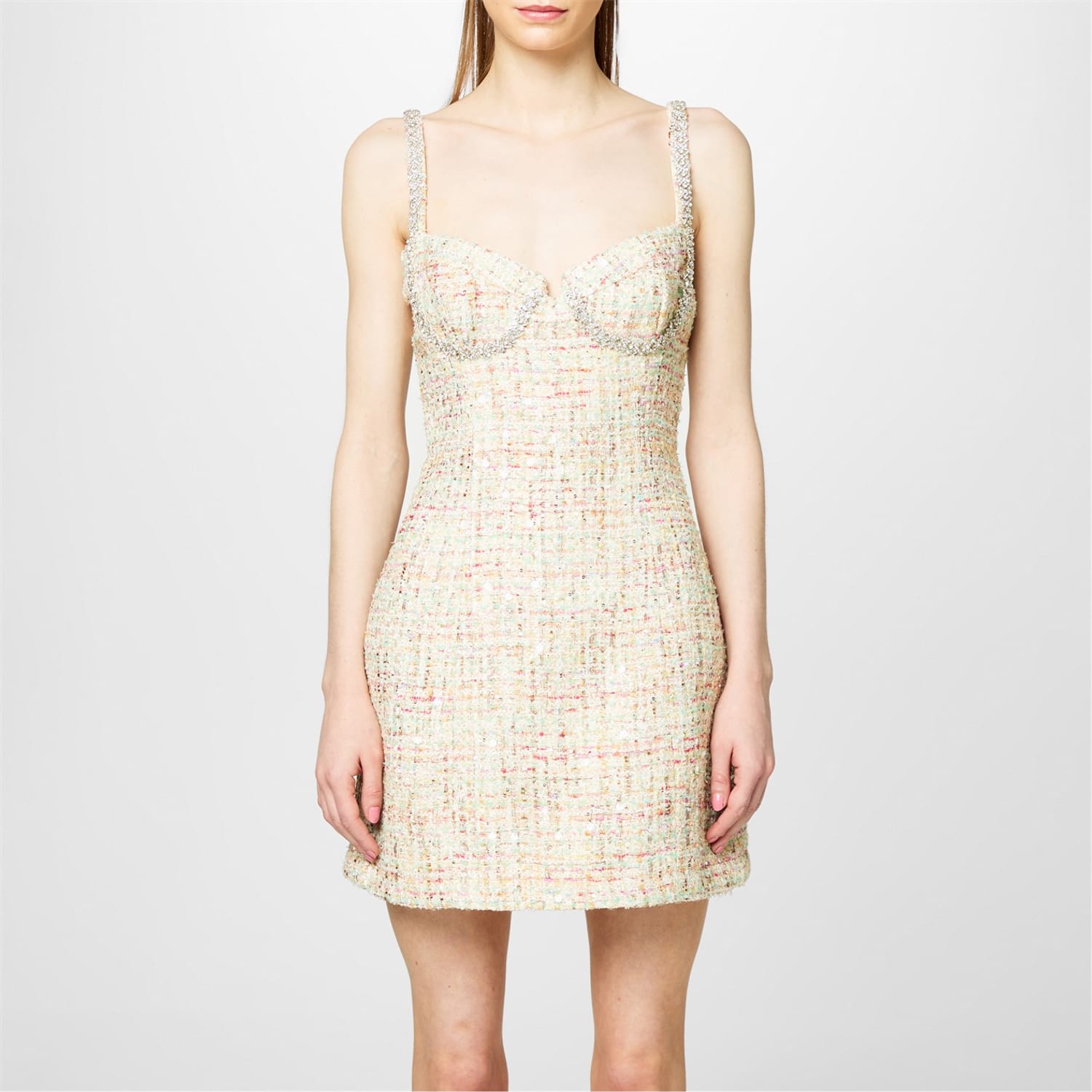 - The classic bouclé colourway is embellished with sparkling diamantés trims that create a mesmerising interplay of light and colour that will command attention from every angle. Whether you are meeting friends for a night out or attending a sophisticated family event, Self-Portrait's Boucle Mini Dress is the ideal choice.