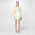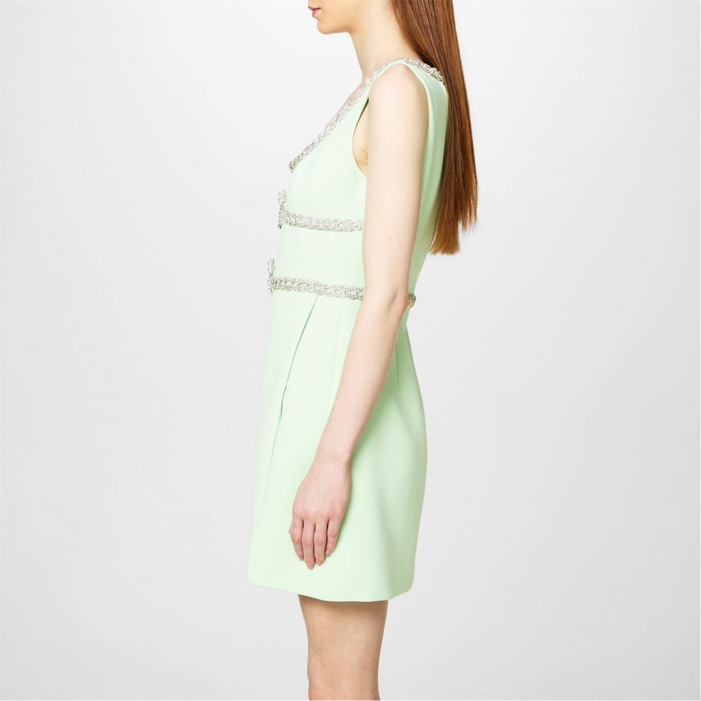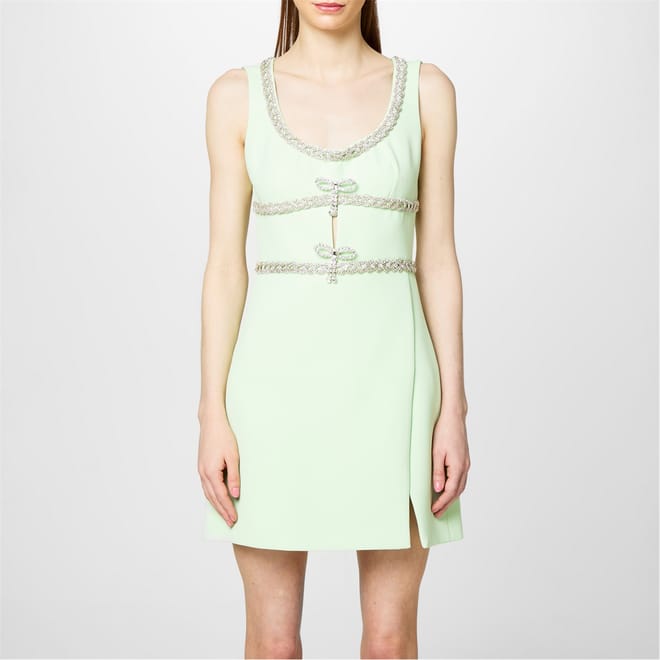 - Adorned with crystal-embellished trims and a side split hem, this one piece is designed in a serene mint green with a sleek and smooth finish, exuding an aura of luxury and refinement. Whether attending a high-profile event or a glamorous soirée, the Diamante Bow Trim Mini Dress by Self Portrait is the perfect piece to elevate your ensemble.