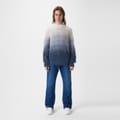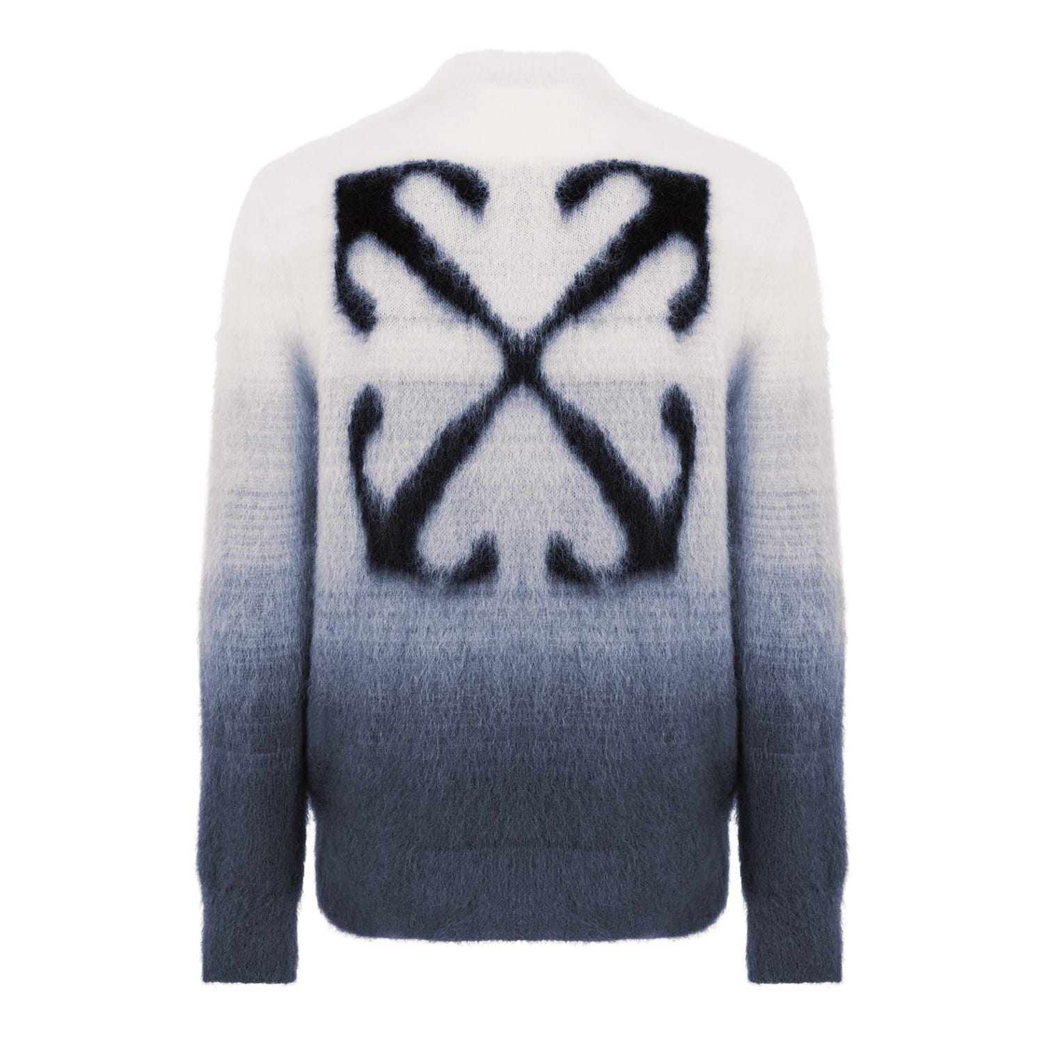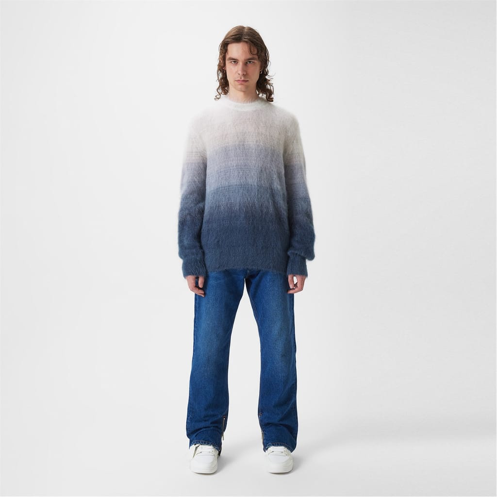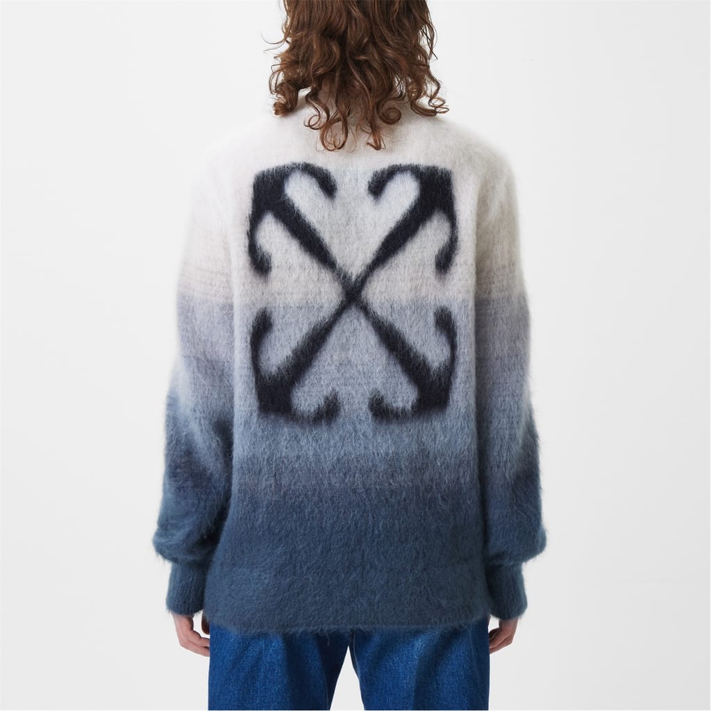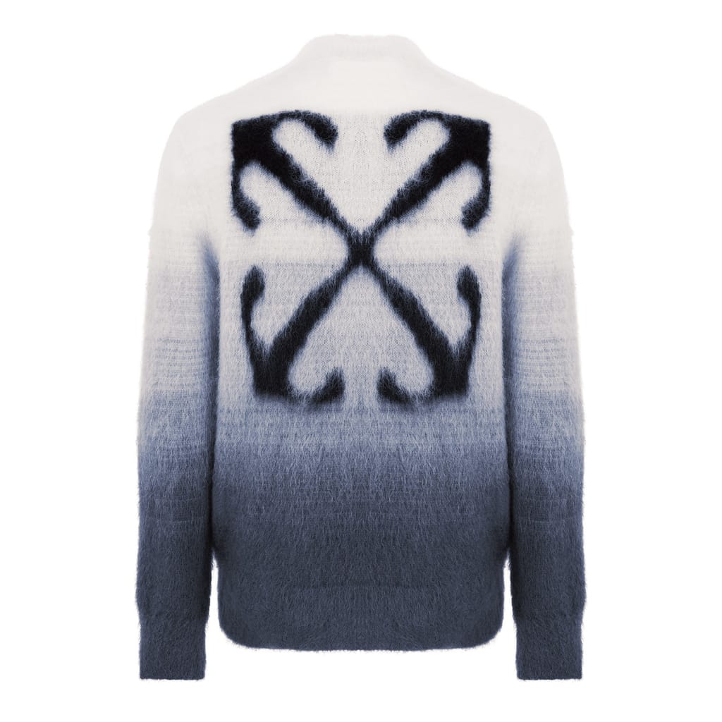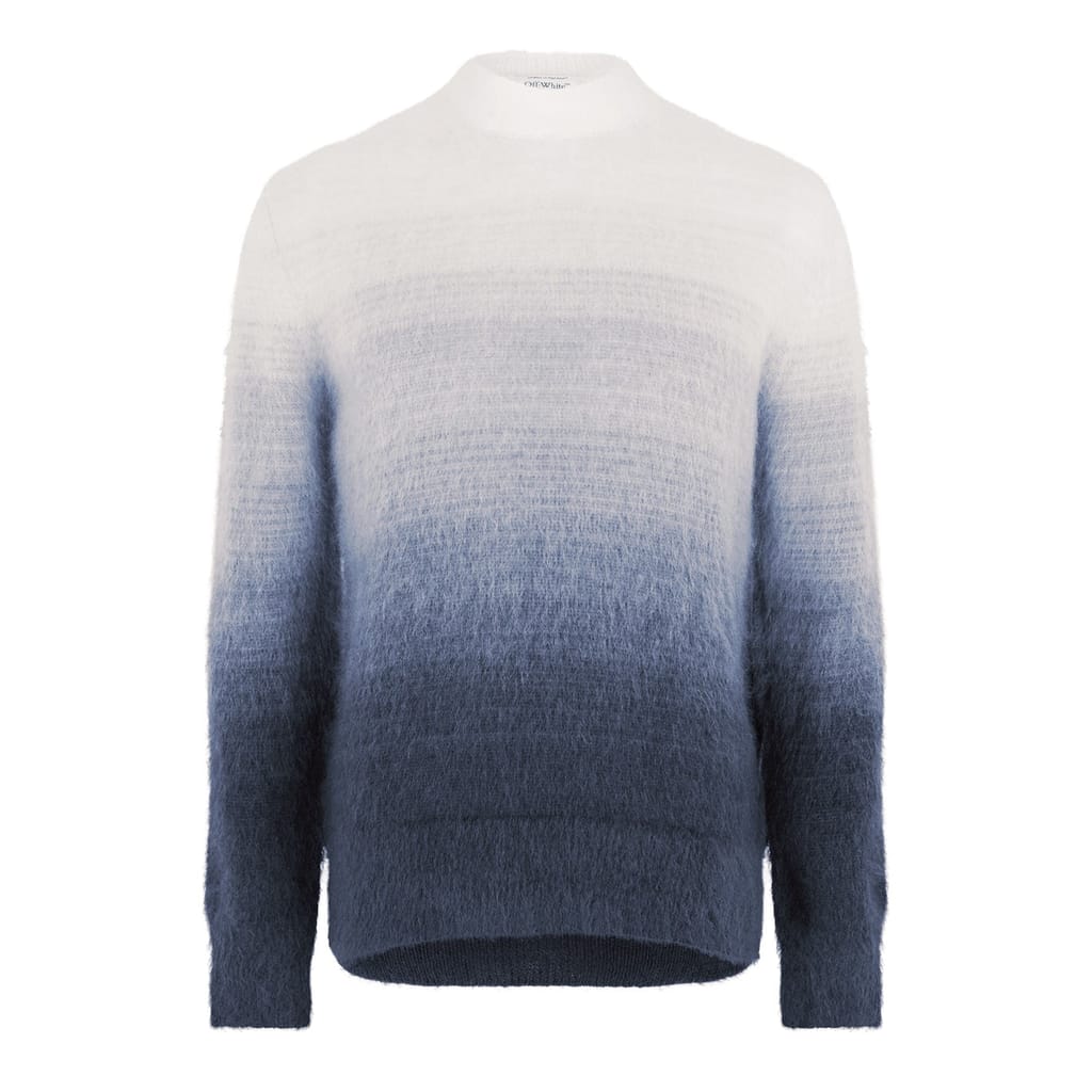 Discover the Off White top, featuring a relaxed fit and a stylish crew neck. This knit design showcases a unique gradient pattern, complemented by a distinctive logo embellishment. Perfect for those seeking a blend of comfort and contemporary style. -