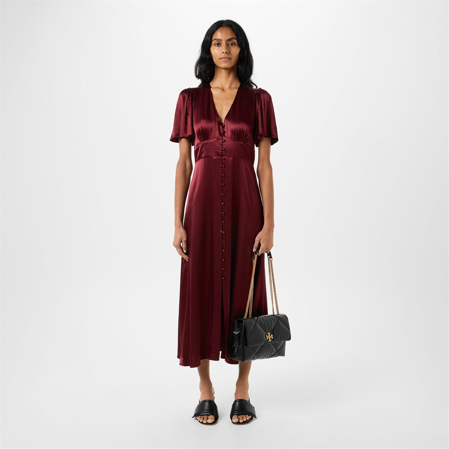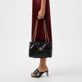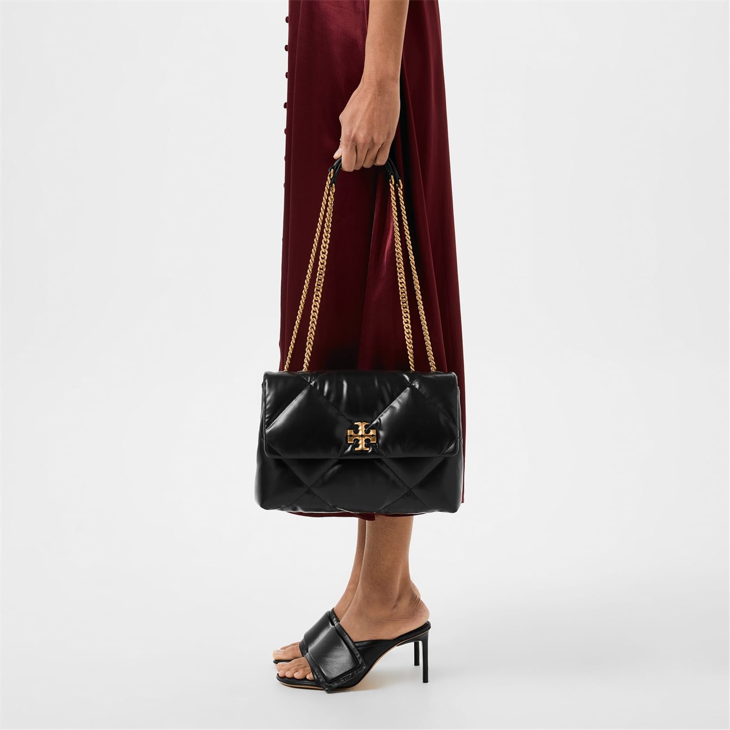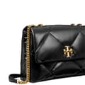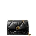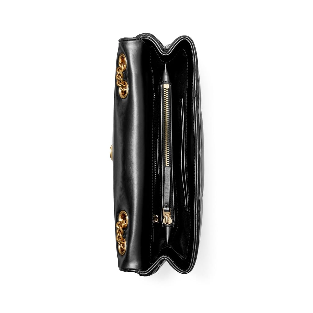 This Tory Burch handbag is a sophisticated choice for any occasion. Featuring a zipper closure and a shoulder handle, it combines practicality with style. The design is enhanced with crystal embellishments, a chain detail, and a logo, adding a touch of elegance to the overall look. -