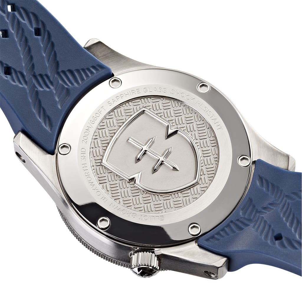 Discover the elegance of Elliot Brown's wrist watch, featuring a striking blue dial and an analogue display. This timepiece is crafted with a durable rubber strap, ensuring both comfort and style. Perfect for those who appreciate a blend of functionality and design in their accessories. -