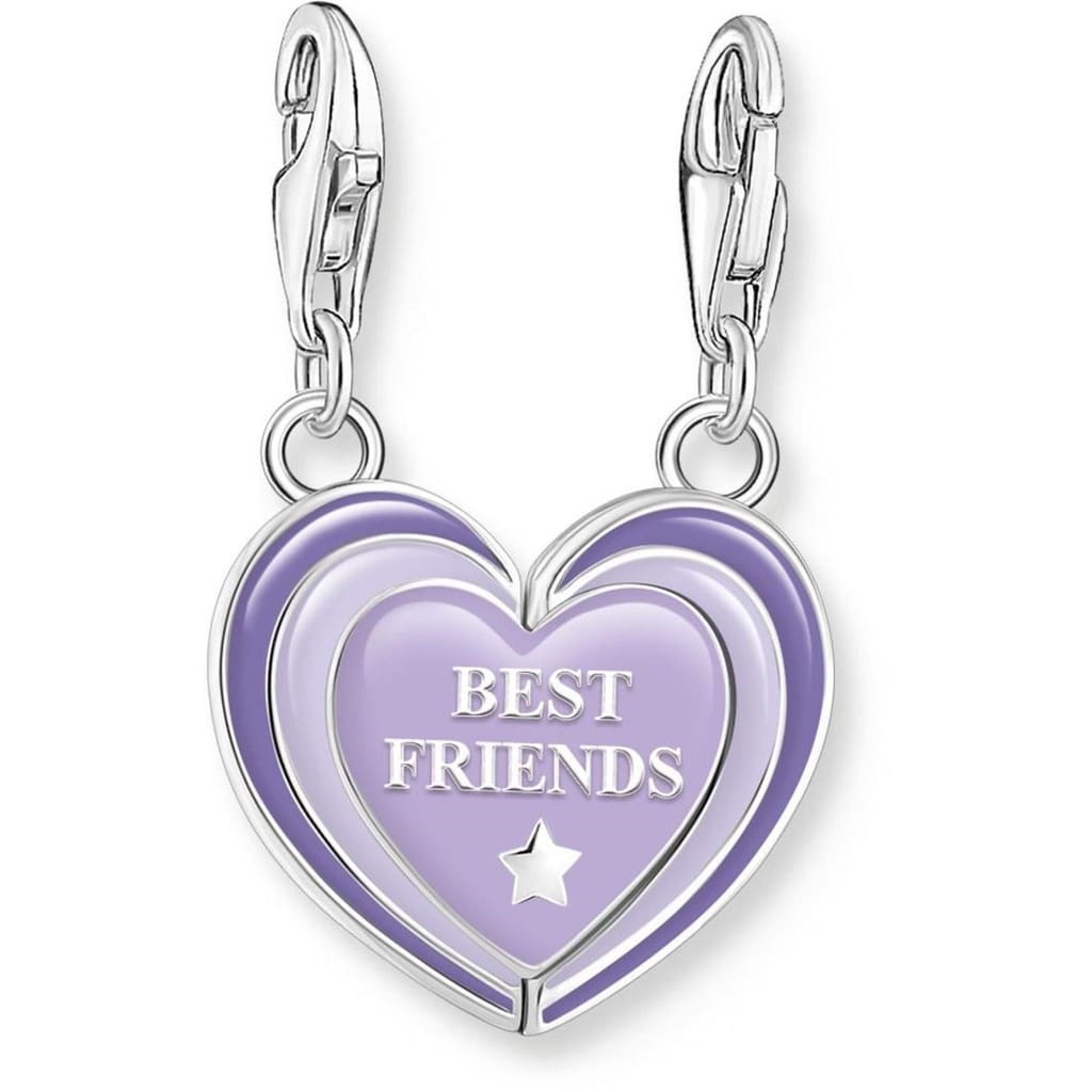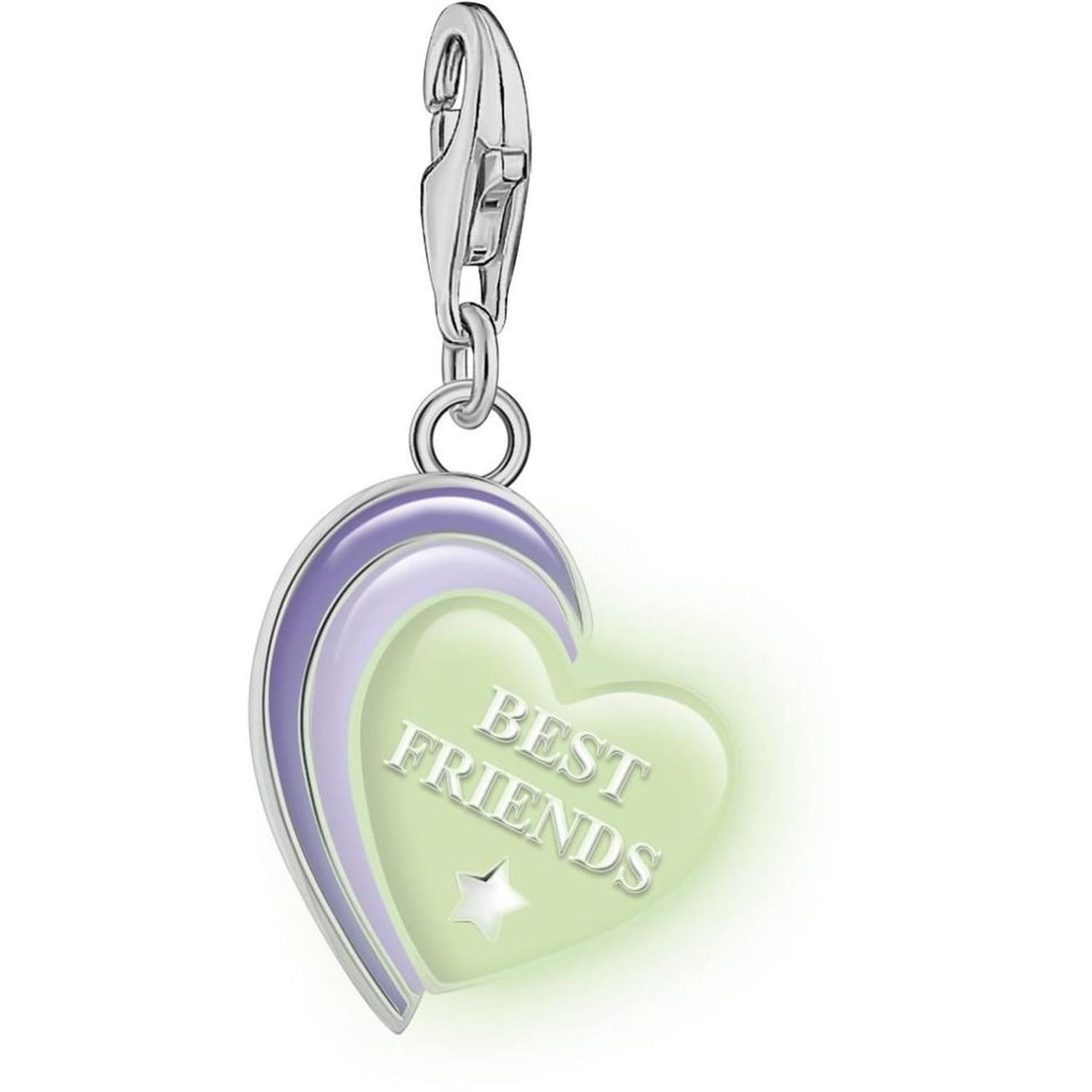Best friends charm . Heart charm that lights up in the dark. The heart features a detailed design with luminescent violet cold enamel, an engraving with the words BEST FRIENDS and a star. Fun highlight: the charm can be joined together with another best friends charm . making it perfect for friendship jewellery. Can be combined with other charms on Charm Club necklaces and bracelets -