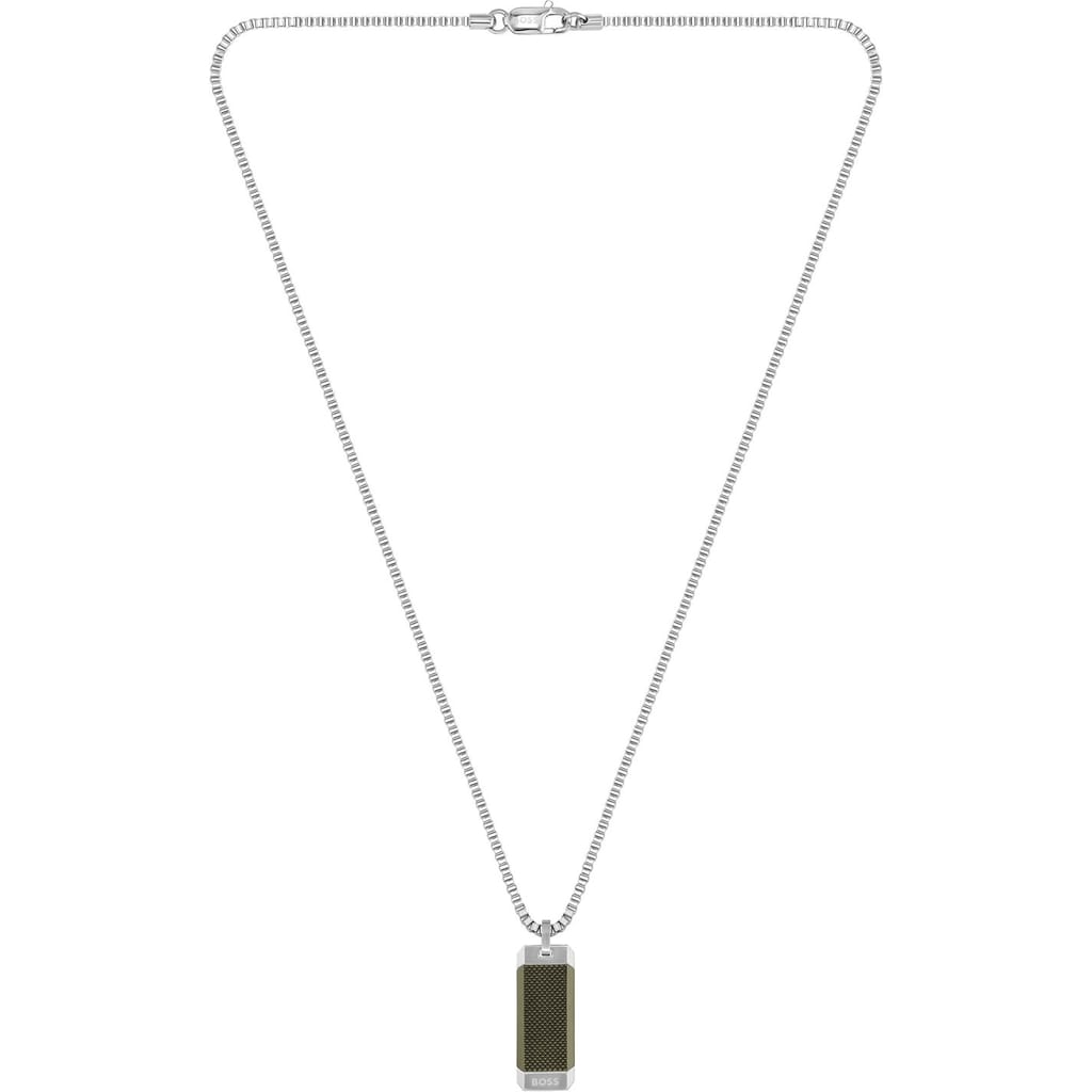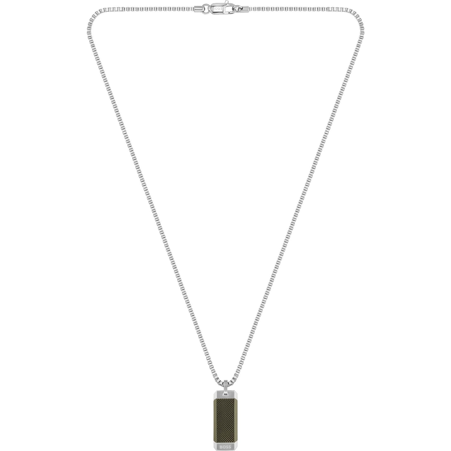 BOSS gents tag necklace from the Bennett family. Features stainless steel box chain and khaki IP textured pendant, with lobster clasp. Length 610mm, pendant 33mm x 13mm -
