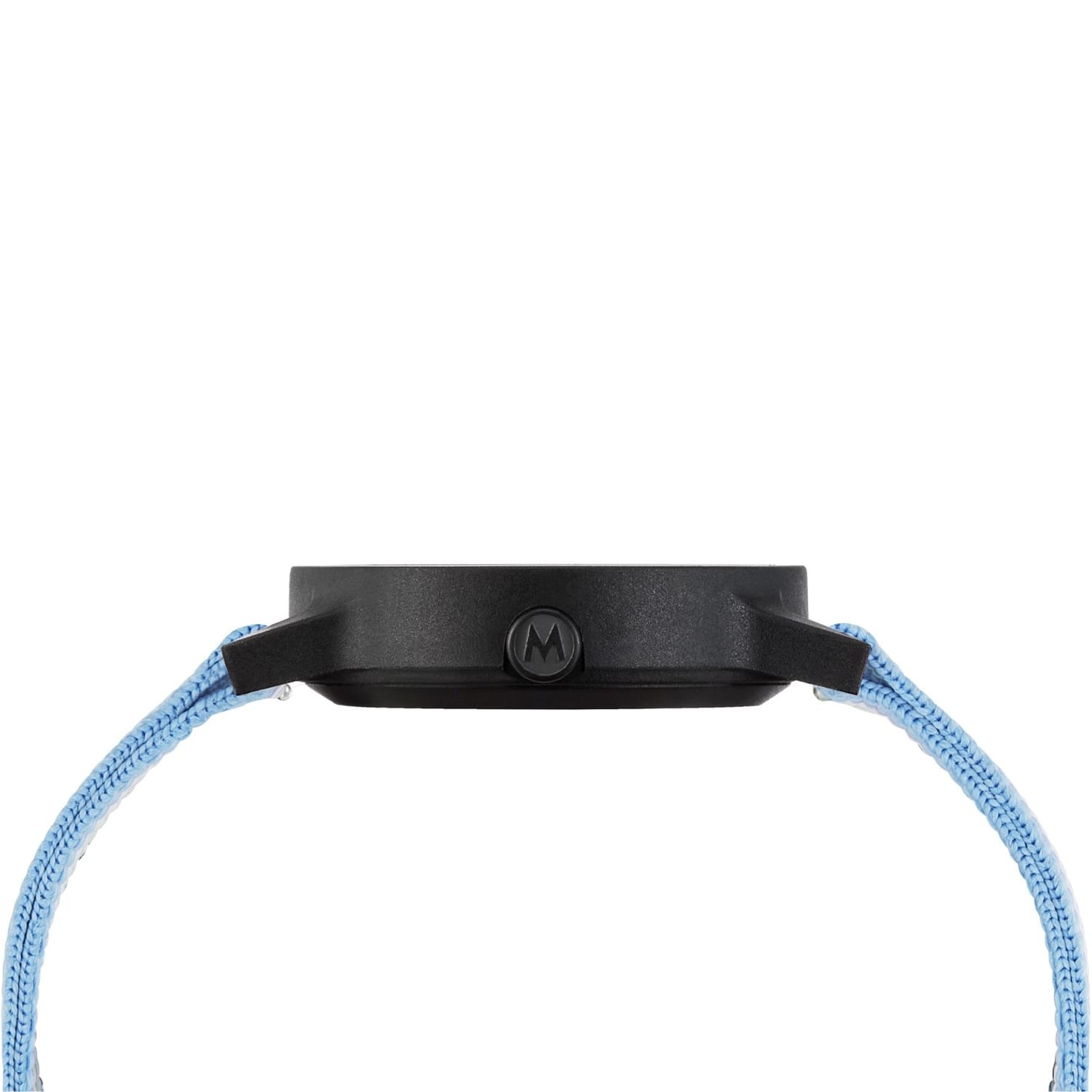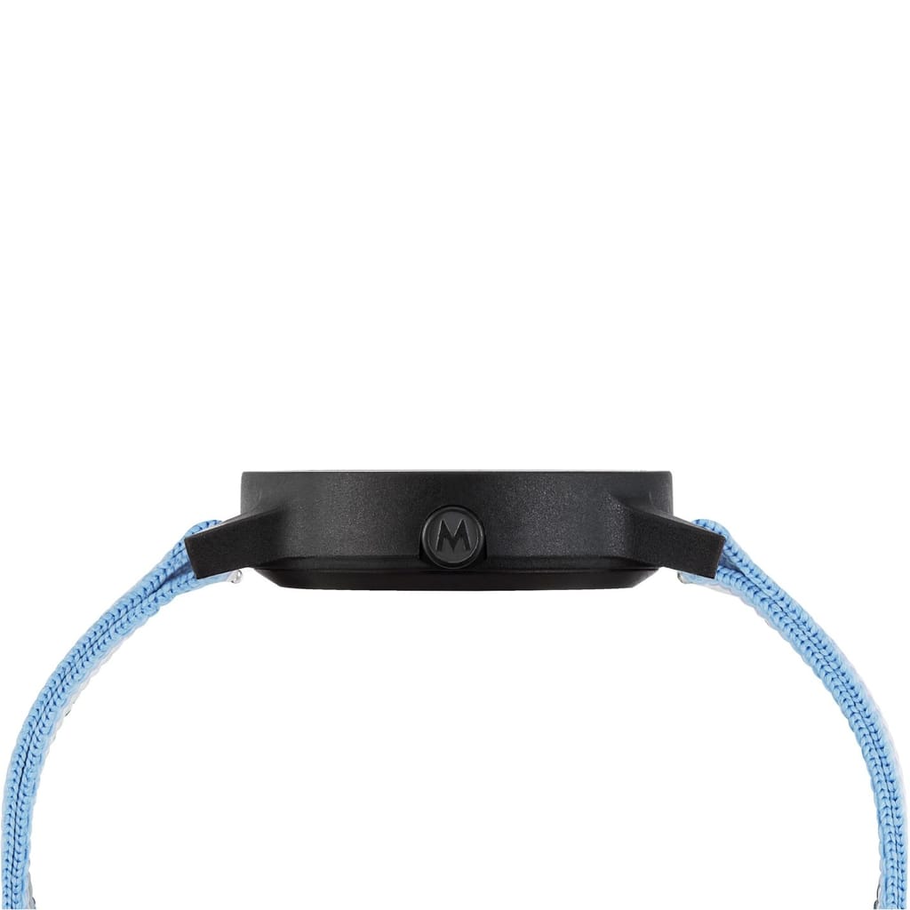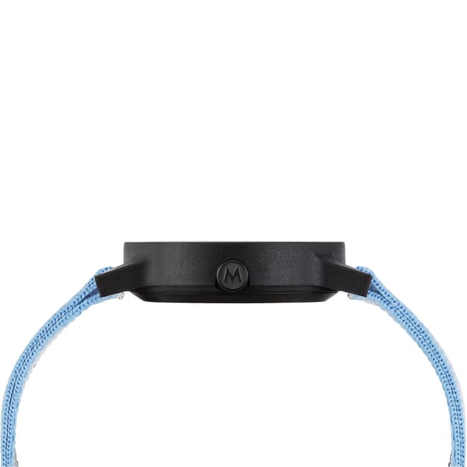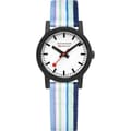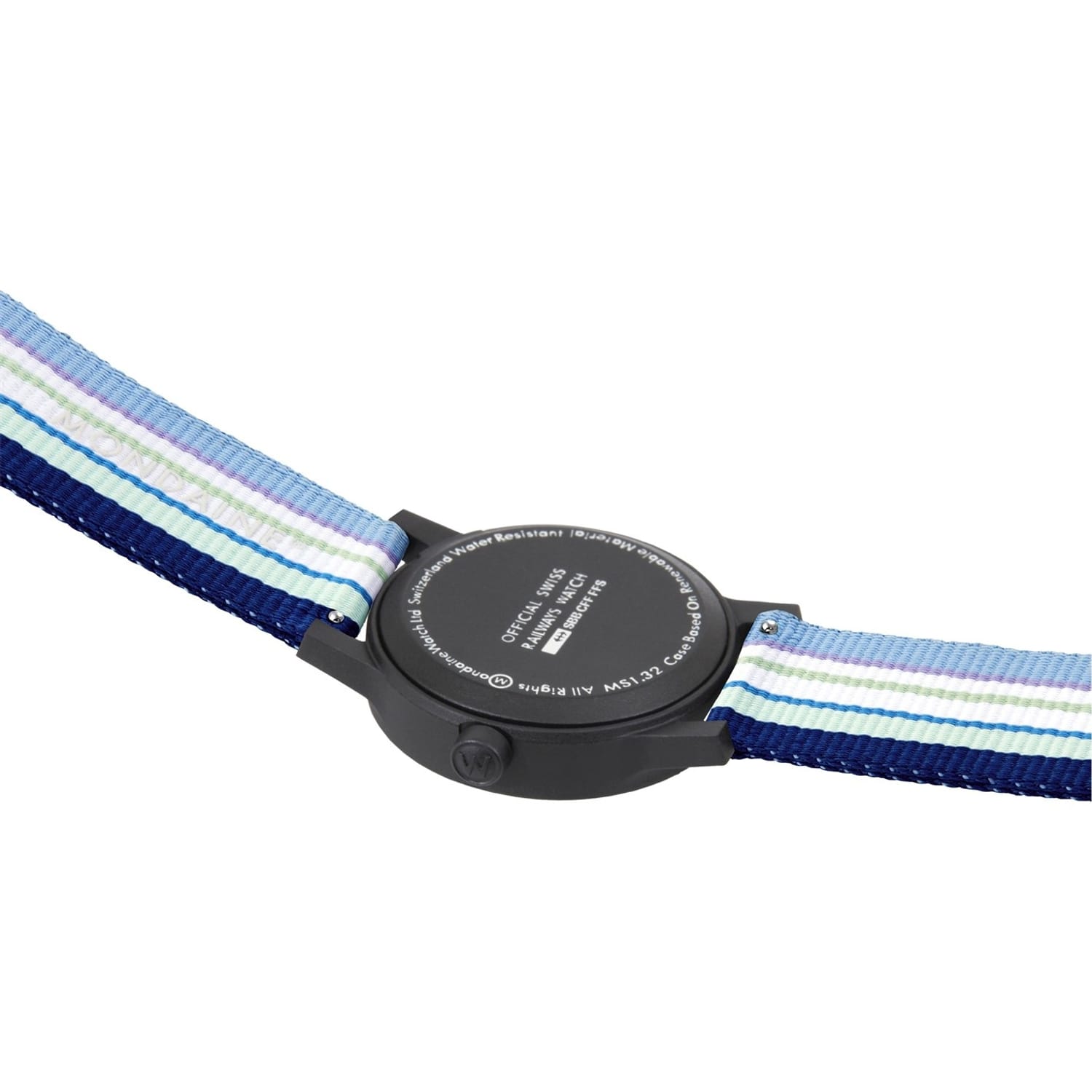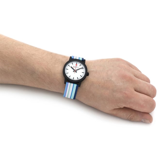 This extraordinary, modern classic presents itself in black with a multi-coloured strap made from recycled PET-bottles. Thanks tThis extraordinary, modern classic presents itself in white with a multi-coloured strap made from recycled PET-bottles. Thanks to the innovative strap system, the strap can be changed in no time at all, giving the watch a new look. The eye-catching strap, the iconic dial and its red second hand combined with the exclusive, removable WE CARE metal pin, lets people know that you care too! The essence collection brings together Mondaines two core values: innovation and sustainability. By using the newest technologies, this collection of timepieces has been produced with renewable raw materials, such as castor oil, wool or cork. The packaging for the watch is made from 100% recycled PET bottles. The essence collection gives the original design of the Mondaine Swiss railways watch a new, modern look. Mondaine has a long watchmaking tradition and our watches are syn -