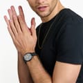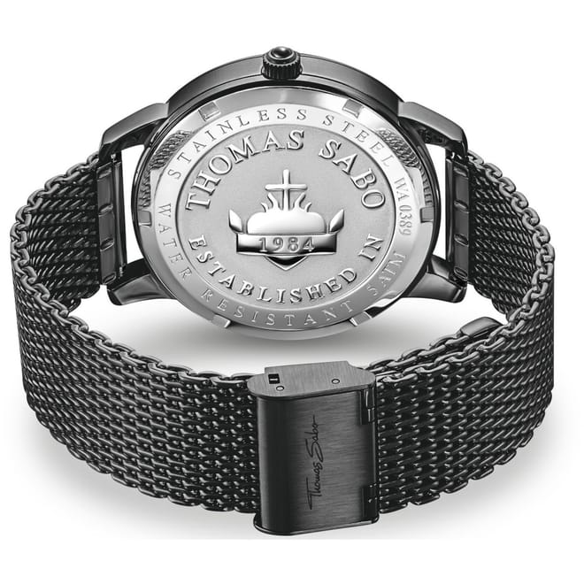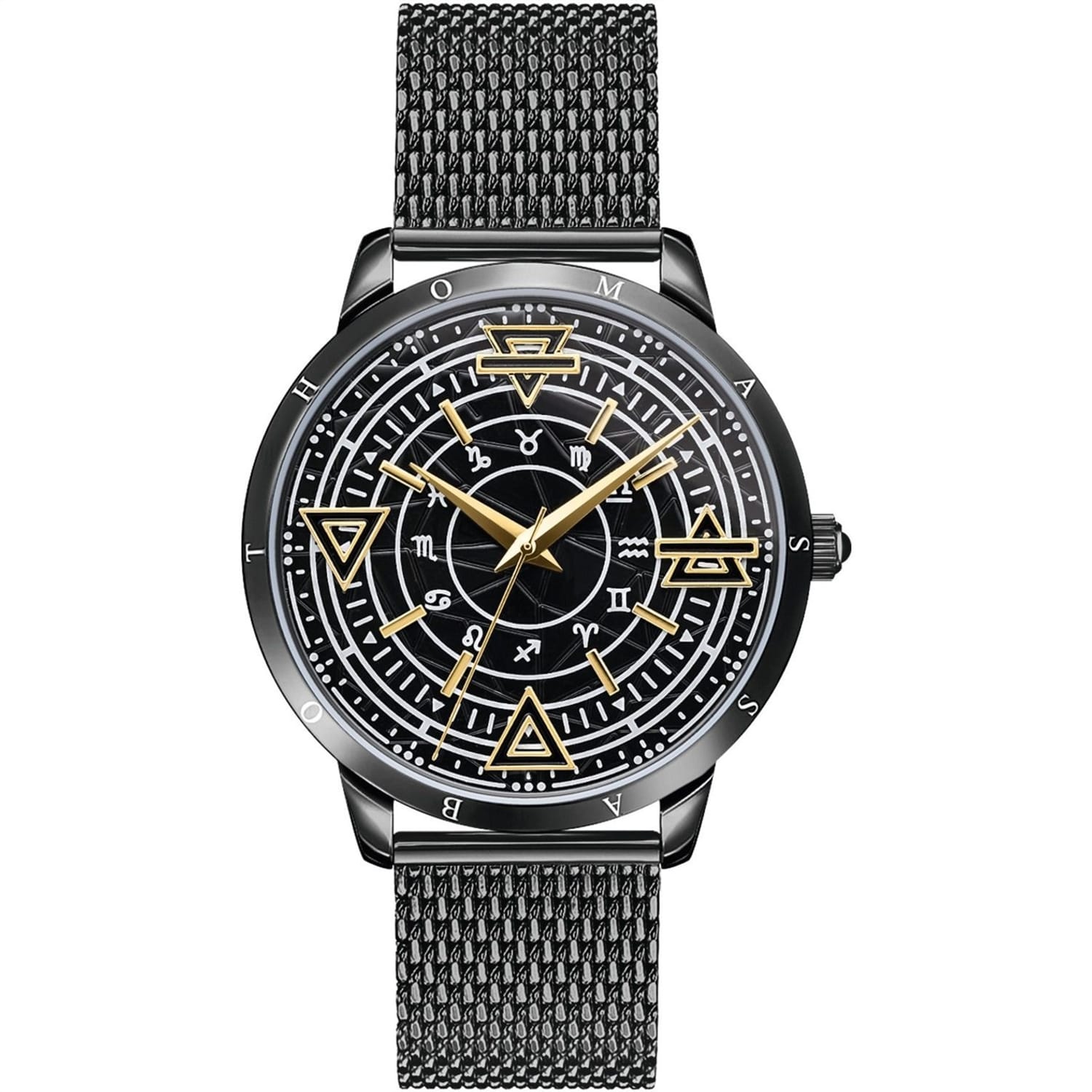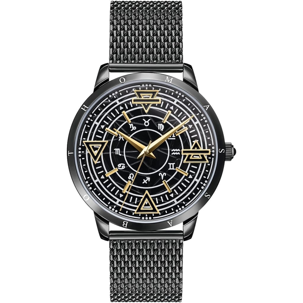 Inspired by the 4 elements Earth, Fire, Air and Water, as well as their own individual Zodiac signs, comes this Unisex watch from Thomas Sabo. It has been beautifully hand-crafted with delicately engraved lines in a two tone design. The black dial with yelm Thomas Sabo. It has been beautifully hand-crafted with delicately engraved lines in a two tone design. The silver dial with blm Thomas Sabo. It has been beautifully hand-crafted with delicately engraved lines in a two tone design. The yellow gold dial wiack hands add to the stand-out appeal and portray an adventurous feel. A small, polished onyx which adorns the crown to finish tlow gold hands add to the stand-out appeal and portray an adventurous feel. A small, polished onyx which adorns the crown to finth black hands add to the stand-out appeal and portray an adventurous feel. A small, polished onyx which adorns the crown to finhis piece strongly. The THOMAS SABO branding on the bezel is partnered with a comfortable, self adjustab -