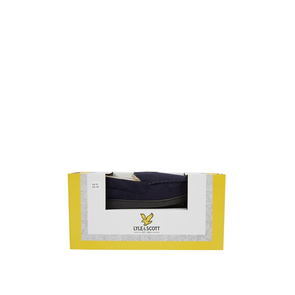 Lyle and Scott Aspen mens moccasin slipper. With a faux suede upper and cosy faux borg lining, complete with the classic embroidered eagle. Ideal for gifting or any occasion.