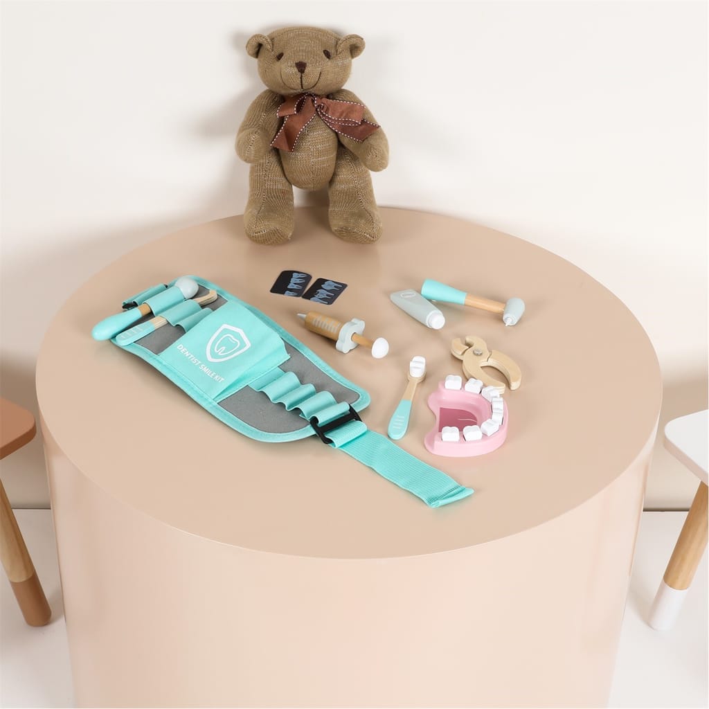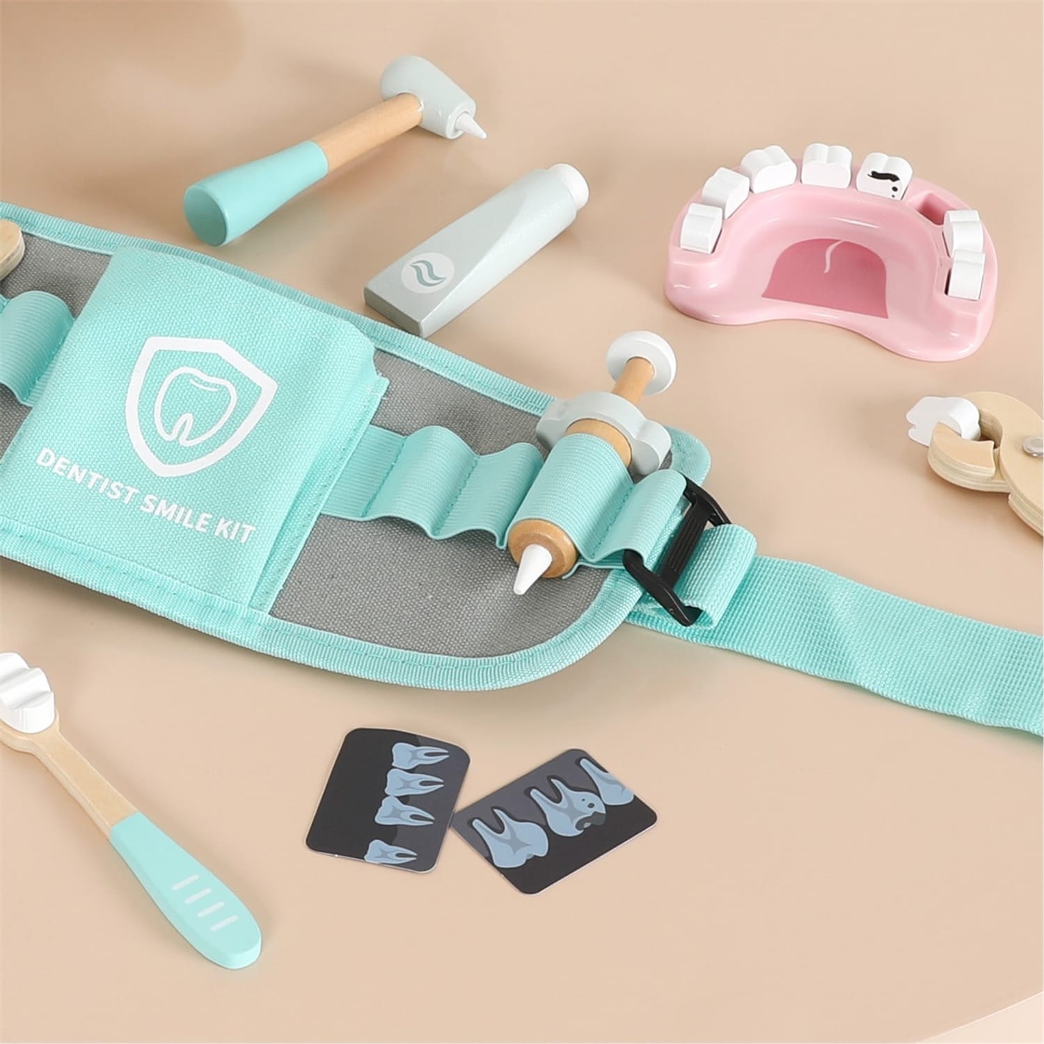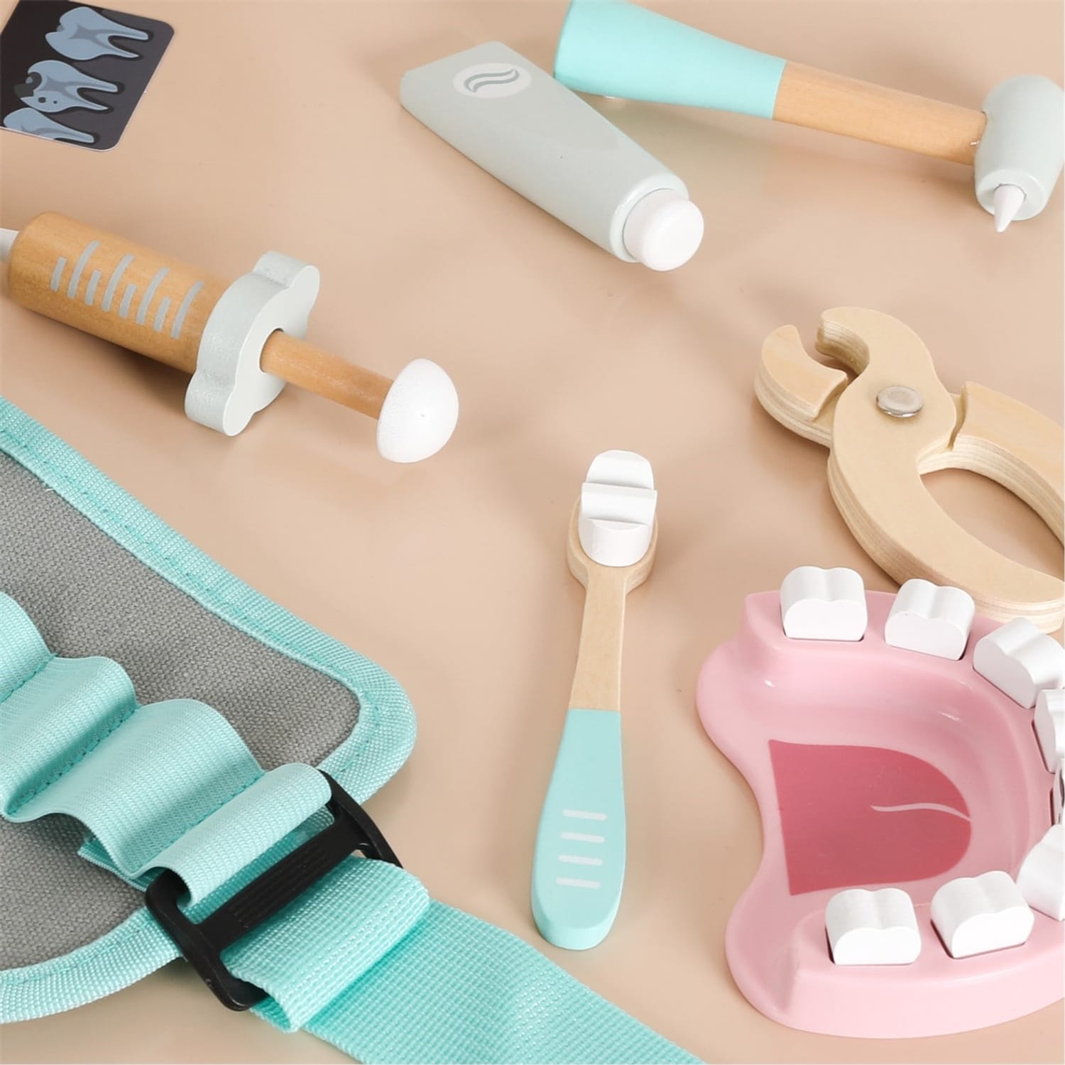 - Complete with detachable dentures and realistic dental tools, tooth paste, mini xray images, syringe the Wooden Dentist Tool Belt allows your child to role-play as a real dentist, learning about oral health while alleviating any fears of going to the dentist. The set helps educate children on maintaining oral hygiene and develops their understanding of dental care.