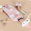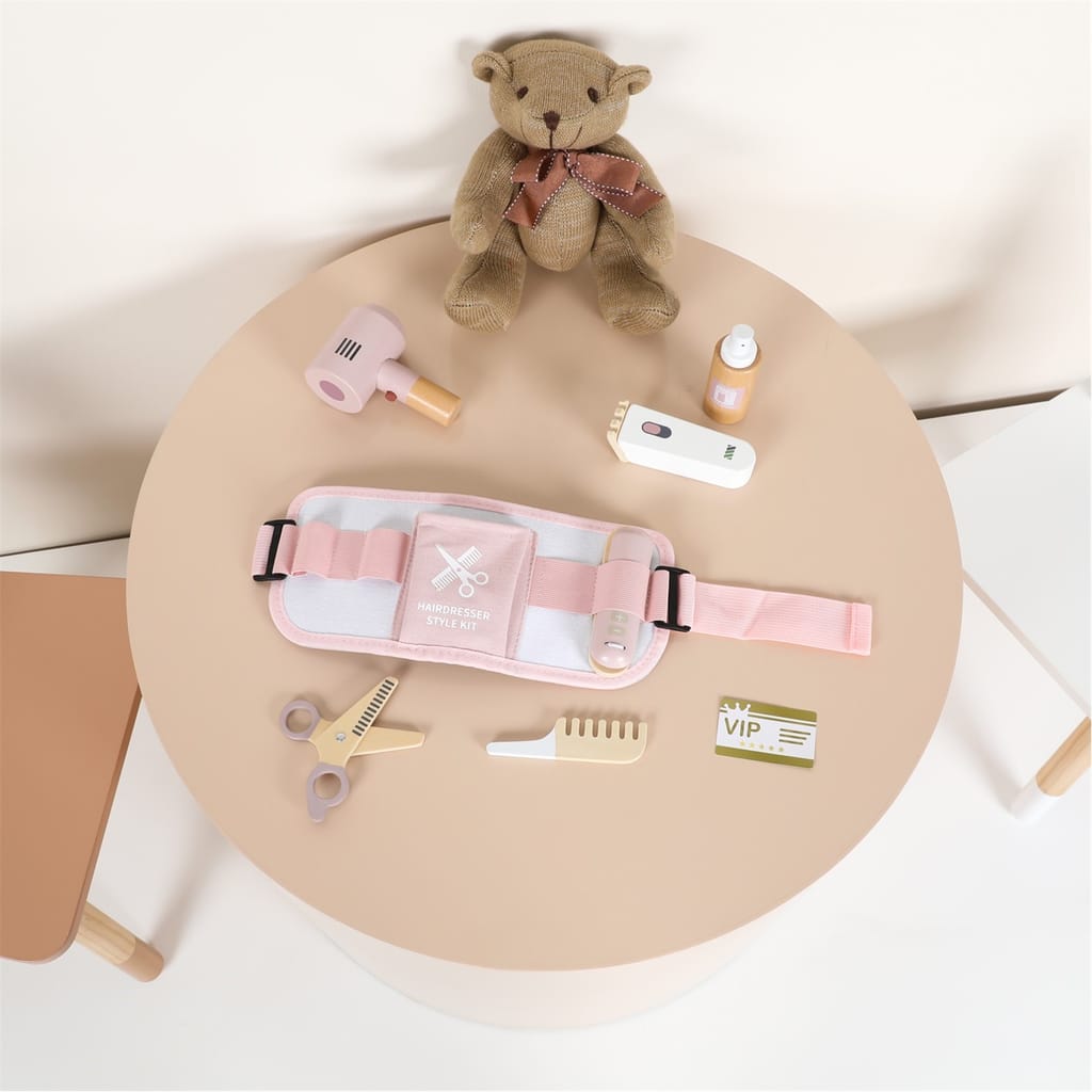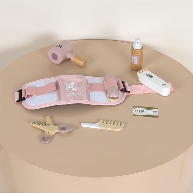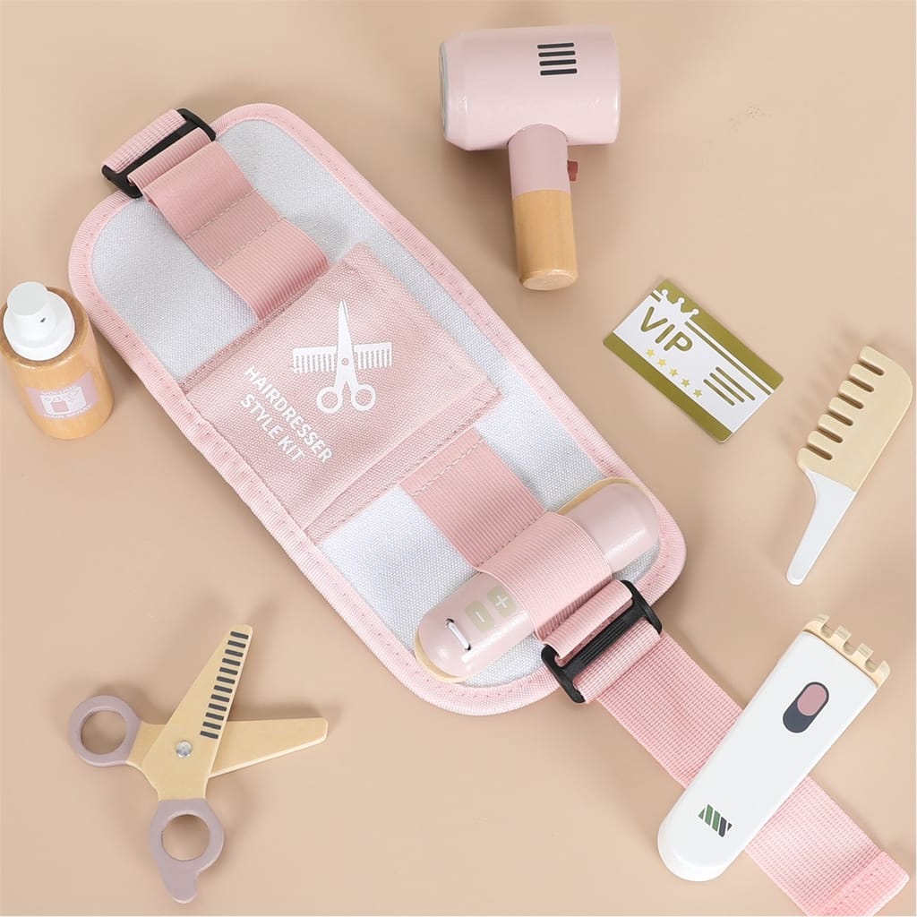 - Includes: Wooden toy hairdryer, shaver, straighteners, comb, scissors, spray and card all fit securely in the belt with adjustable strap.