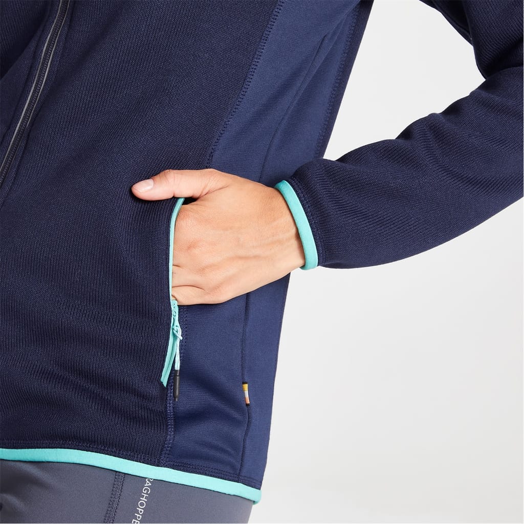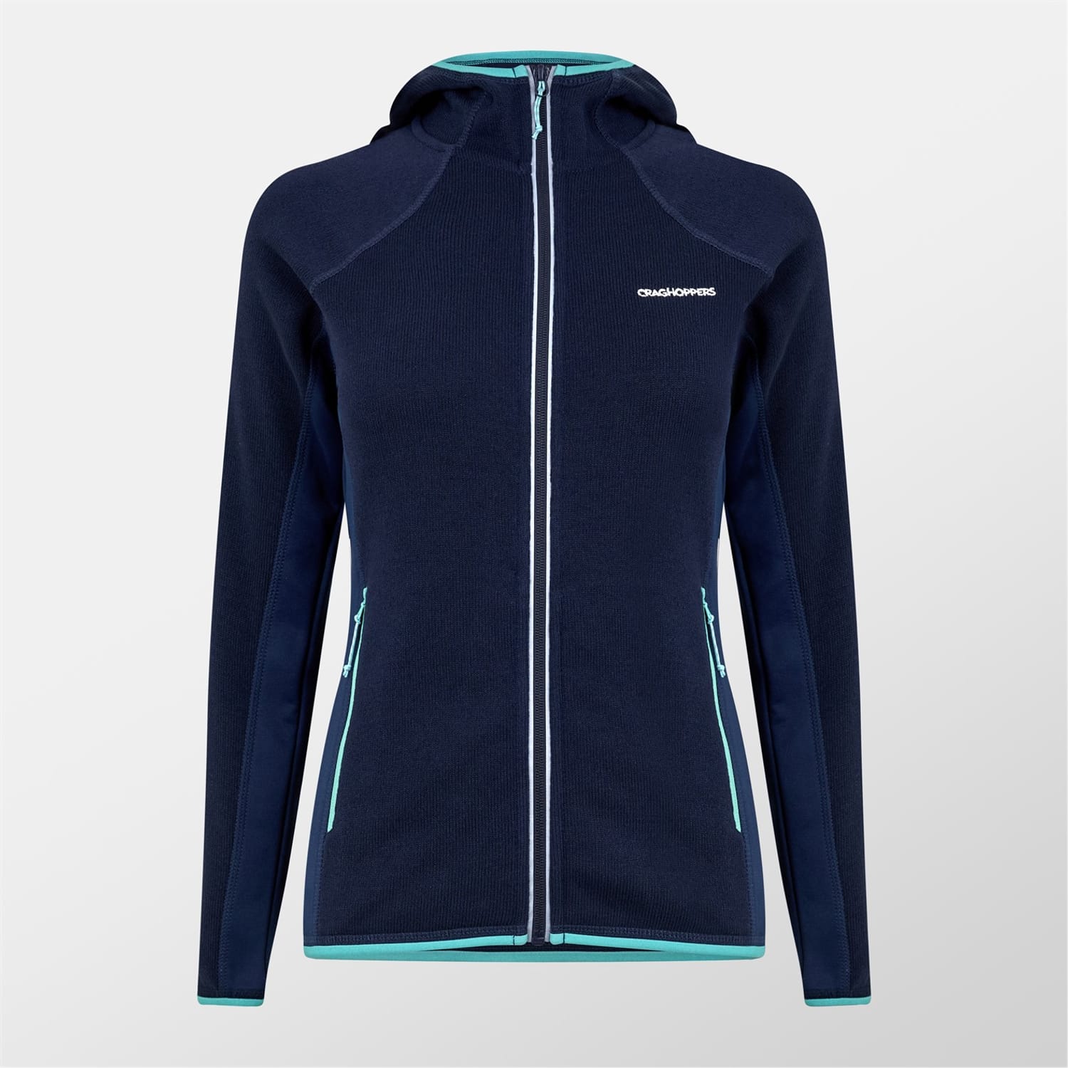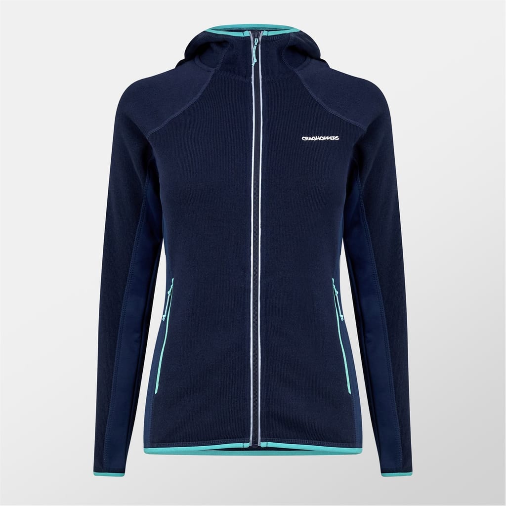 This Craghoppers fleece jacket from the activewear collection features a hooded neckline and a regular fit. It includes a front zipper closure and raglan sleeves for enhanced mobility. The jacket is designed with a ribbed hem and cuffs, and it has a solid pattern. Embellished with a logo and zipped pocket, it combines functionality with style. -