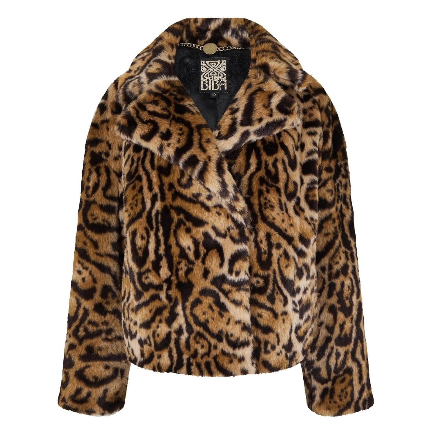Step into glamorous warmth with the Biba Short Faux Fur Jacket, designed to add a touch of luxury to any outfit. This hip-length coat features a stylish wrap-over design and is available in on-trend leopard print or classic black. Perfect for keeping warm while making a statement, this coat is lined with Biba-branded fabric and includes convenient pockets.