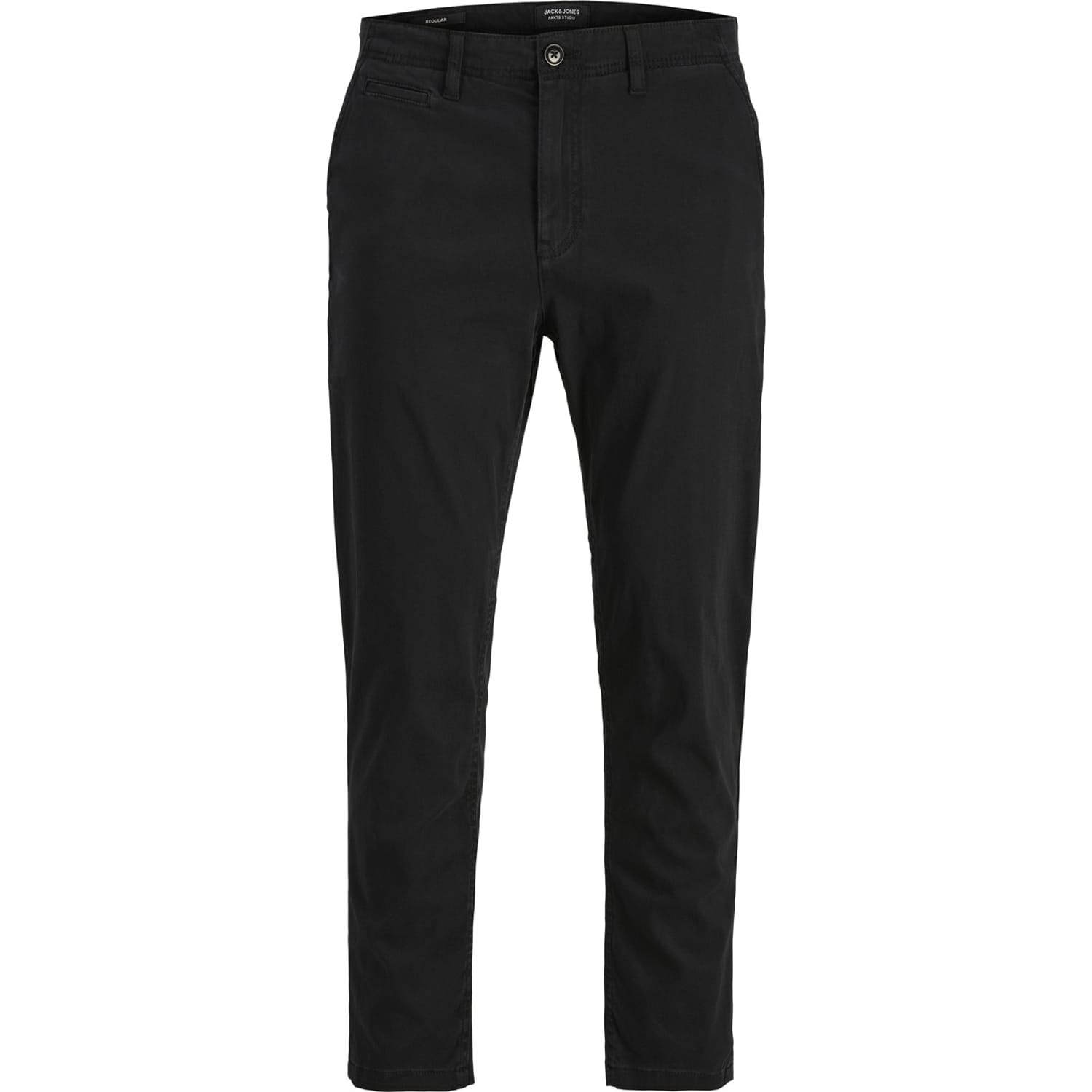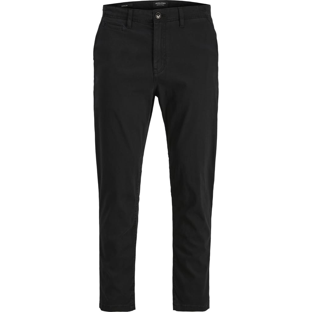 The chino pant is an essential style for this category. It is the in between of a dress pant and a casual 5 pocket styling. It's a plain styling, with front and back pockets only.
