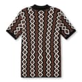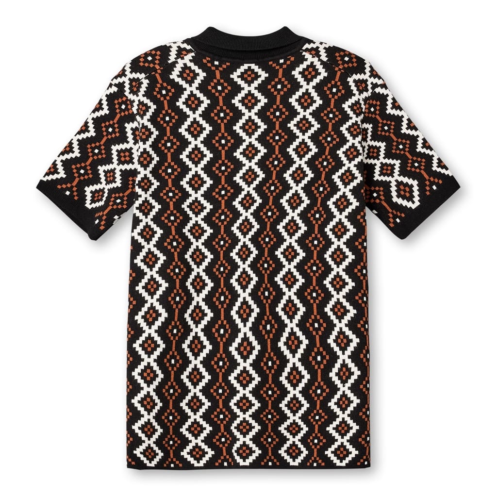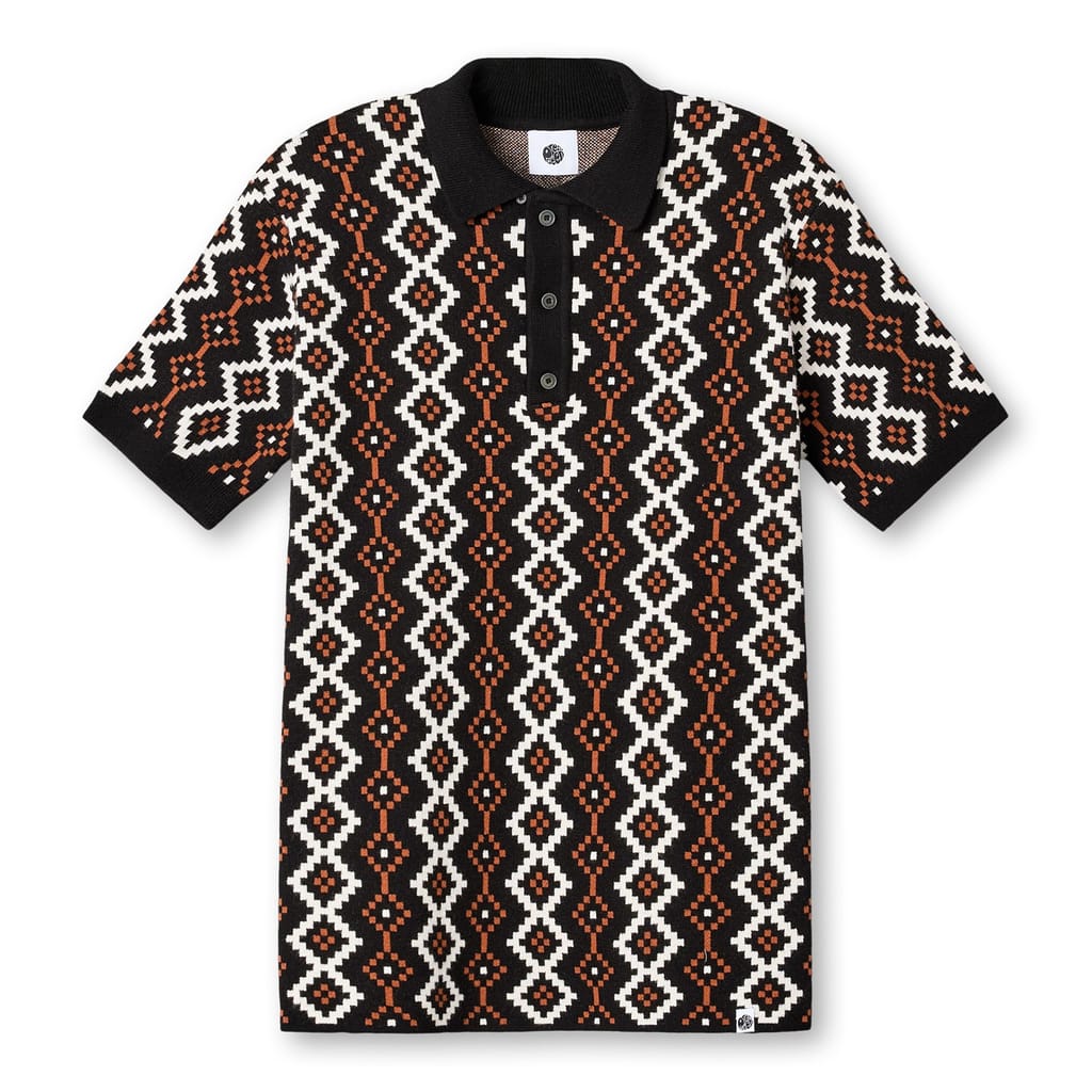 Pretty Green semi-formal polo shirt features a geometric pattern and short sleeves. This knit top is designed with a ribbed cuff and a polo collar, offering a regular fit. The shirt is equipped with a button closure, adding a touch of sophistication. -
